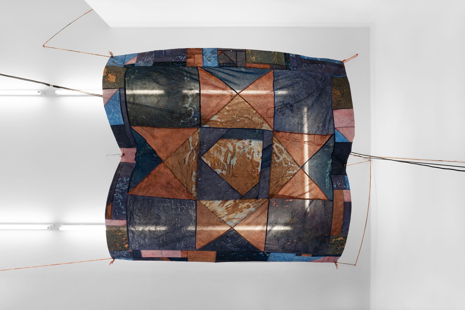 Anchoring the exhibition is Evening Star (Supernova), a quilt co-created with Jones’s mother, Gloria Pottinger. Formed from lived-in fabrics passed between them—an exchange the artist likens to a shared working practice—the work invokes American novelist Alice Walker’s question: What did it mean for a Black woman to be an artist in our grandmothers’ time? Drawing from matrilineal currents of quilting, the artist and her mother recall, among others, the visual vernacular of Gee’s Bend, a rural southern Alabama community whose quilts emerged in the 19th century from necessity and accumulated into an expressive language. Rooted in a history in which quilts were not only forms of care but, a means of survival, enslaved women of Gee’s Bend pieced scraps and worn fabrics to endure cold nights, gathering their families against violence and deprivation. Folding together Adire dyeing, batik, and the improvisational geometries of Gee’s Bend, Evening Star (Supernova) becomes an invocation, a mother’s garden re-entered through cloth.