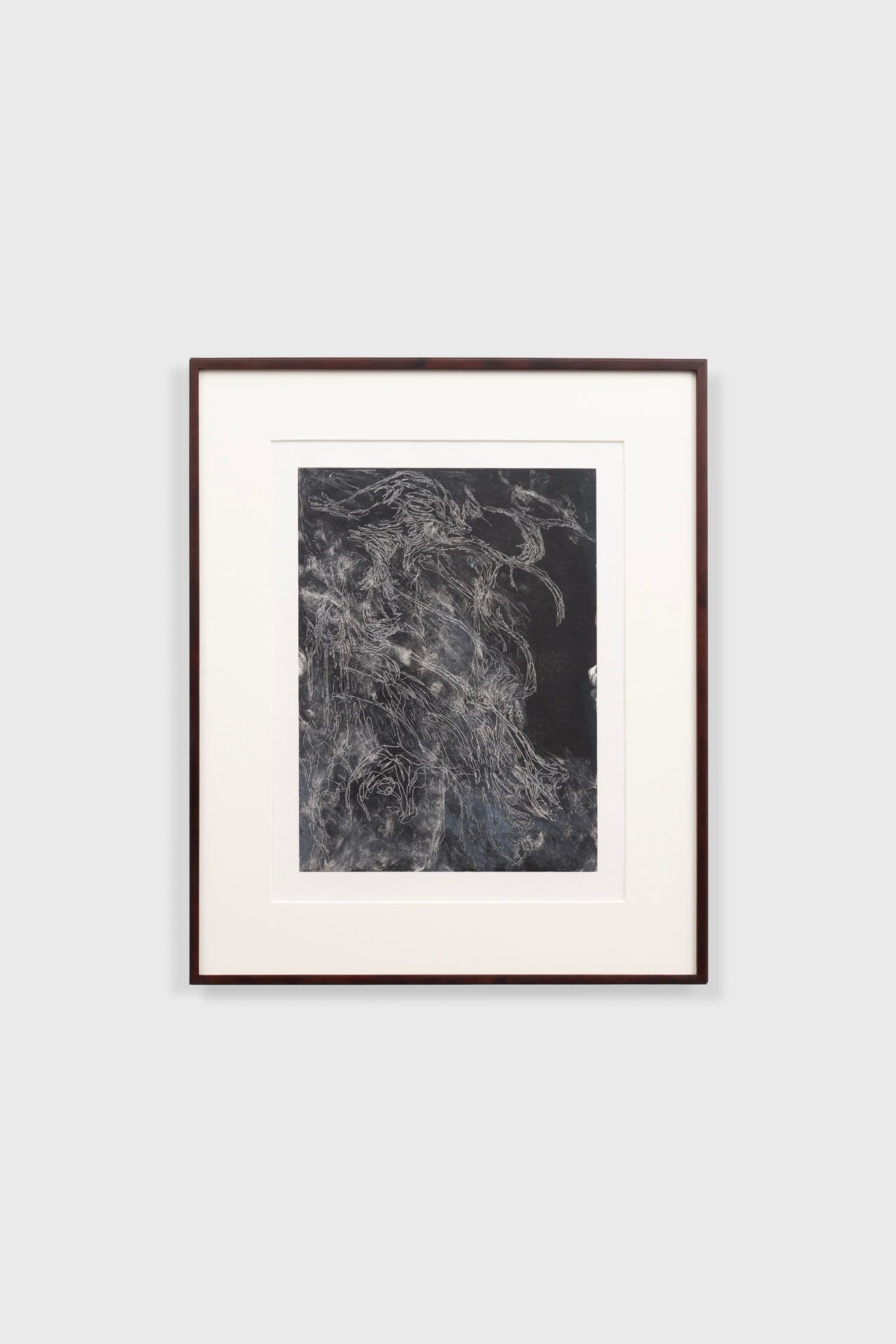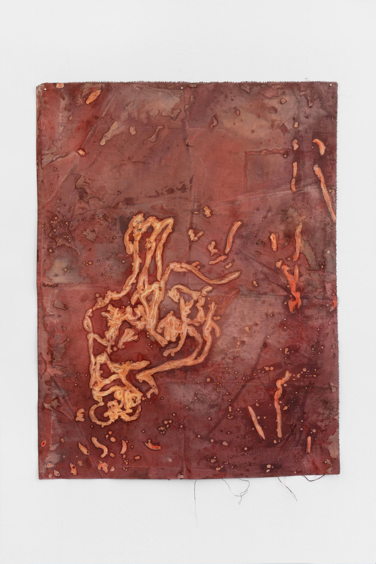 Nearby, The Queen Conch reimagines the ceremonial shell, which has been endangered through economies of extraction—principally those of tourism—in the Caribbean Sea and adjacent waters. Cast in clay, its resonance curls inward, becoming a vessel for cultural languages endangered or suppressed. It gestures toward Safiya Sinclair’s “wild conch-shell dialect,” an image of voice folded tightly against worldly refusals. Jones’ shell is not a relic but a container of submerged tongues and ritual histories that persist despite erasure. In wall works Wide Sargasso Sea (the 2nd Fire) and Humming Eternal Warmth (a Night for Leaving a Vast Beginning), salt dries into constellations across earth-toned cloth, recalling Caribbean atmospheres. Their titles echo Dominican-born novelist Jean Rhys, speaking through an archipelagic set of literary references. Smaller textile works intensify this sensorial field. Other Stars Will Sing, Salt Sweat, Ravenous Dark compresses gravure, dye, salt, and oil into a dense emotional geology, a minor cosmos shaped by labour’s moisture and touch. The Cry Takes Root, nearly translucent, traces grief’s slow infiltration of the body through pencil flickers and faint washes. Double-Edged Fantasy (SN2023zkd) repurposes a bedsheet into a palimpsest of gestures and pressure marks. Two further wall works, Silver is the Moon I Swallowed (i) and (ii), meditate on internal luminosity. In (i), chalk and pigment glow softly, as if light has been metabolised. In (ii), the glow crystallises into a gravure print.