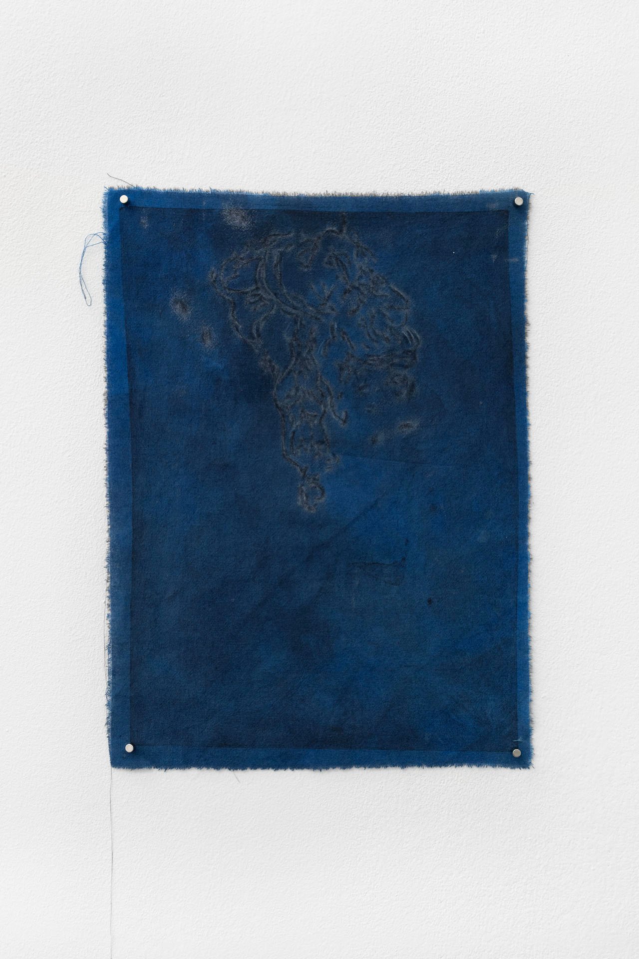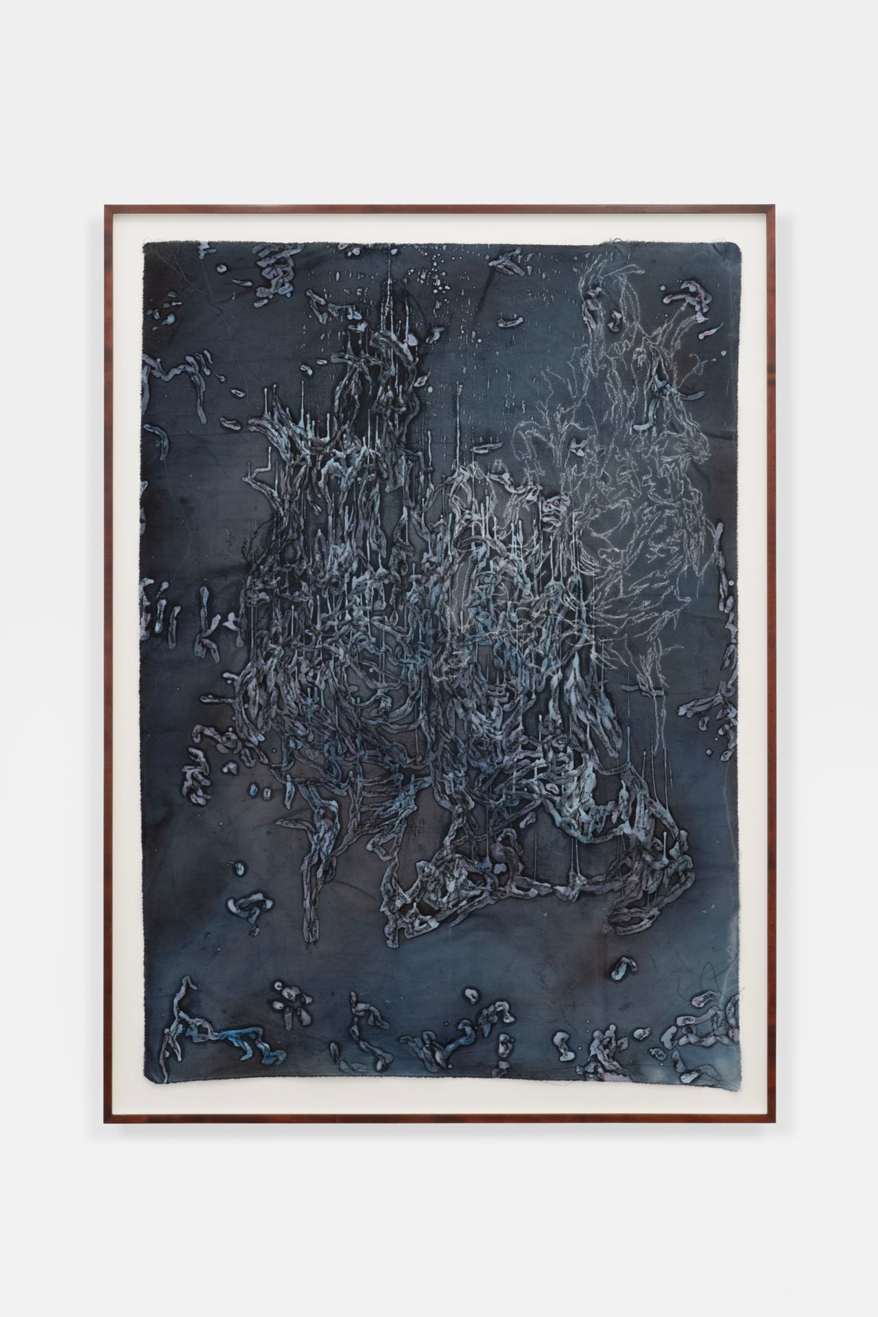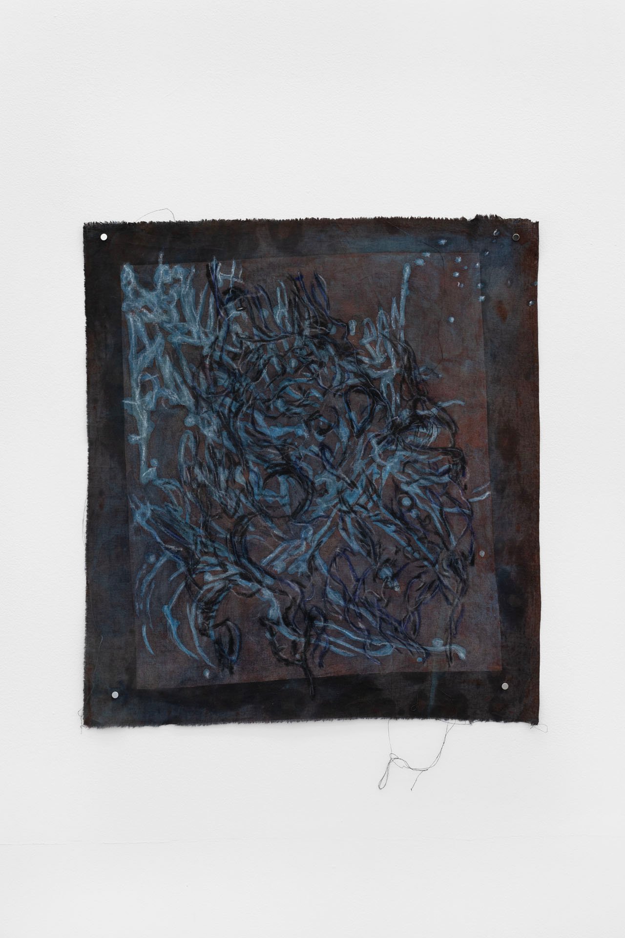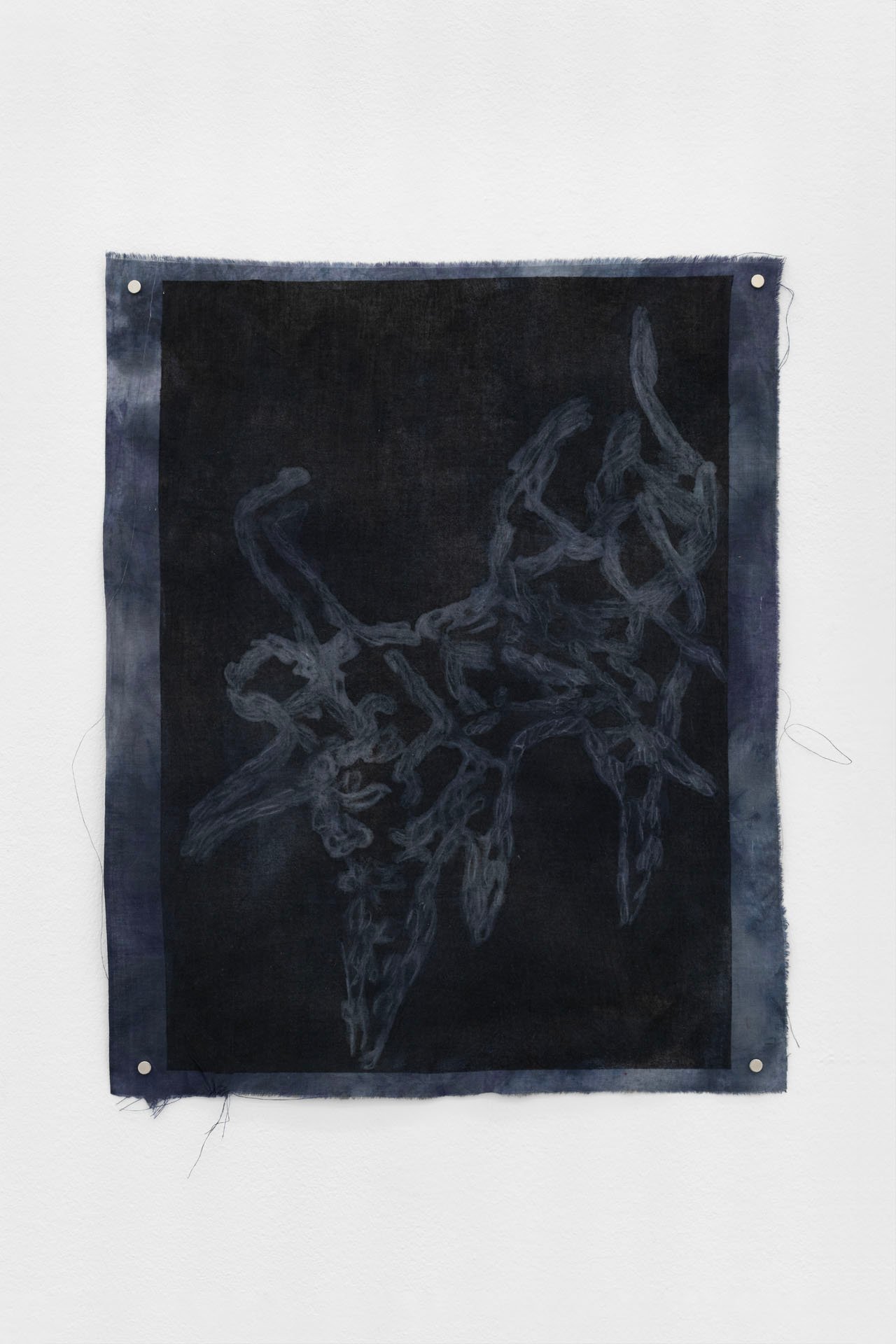 At the centre of the exhibition is The 9th Requiem (Aspiration), a spatial sound composition that explores tuning, attuning, breath, and listening—sonic practices that function as conduits for remembrance. The work is composed of nine channels arranged as an immersive field— sound moves through the room in slow, tidal circulations. This spatial composition is fundamental: tones drift, approach, recede, and cross one another without settling, creating a choreography of proximity and distance that mirrors the fluctuating cadence of breath. Built from layers of improvisational recordings using classical (cello, flute), folk (harmonica, panpipe), and instruments made by the artist (tuning fork, shell, voice, bells). Among these instruments is a rusted tuning fork, sounding outside the 440 Hz grid, which creates a xenharmonic field where tones hover and resist resolution. The work’s nine-channel form extends from Nine-Night, the Jamaican wake tradition with Akan roots, where the dead are honoured through stories, hymns, and gathering over nine nights to support the transition of the spirit. Like Christina Sharpe’s theorisation of the wake, Jones treats funerary rituals not as stabilising practices but as portals through which the living and the dead move without hierarchy. Surrounding this sonic architecture is a set of textile works that channel pre-industrial cloth traditions—through wax resist, hand-dyeing, salt crystallisation, and stitching—as a material vocabulary of mourning.