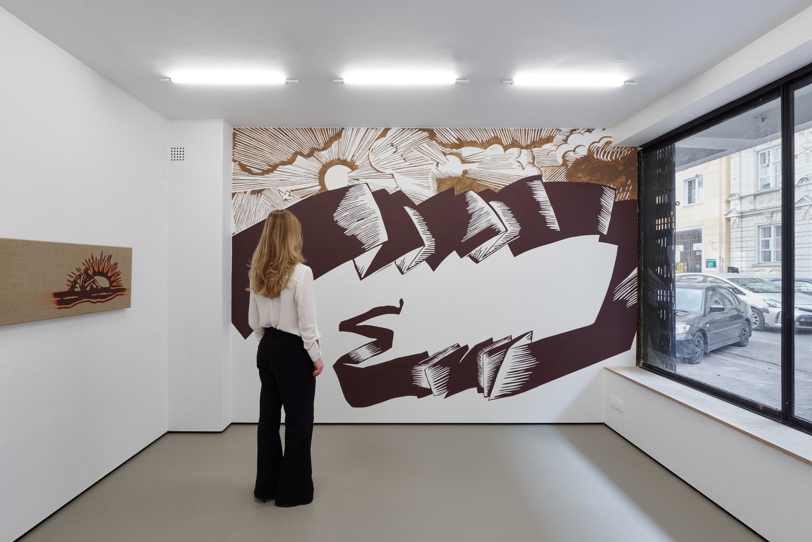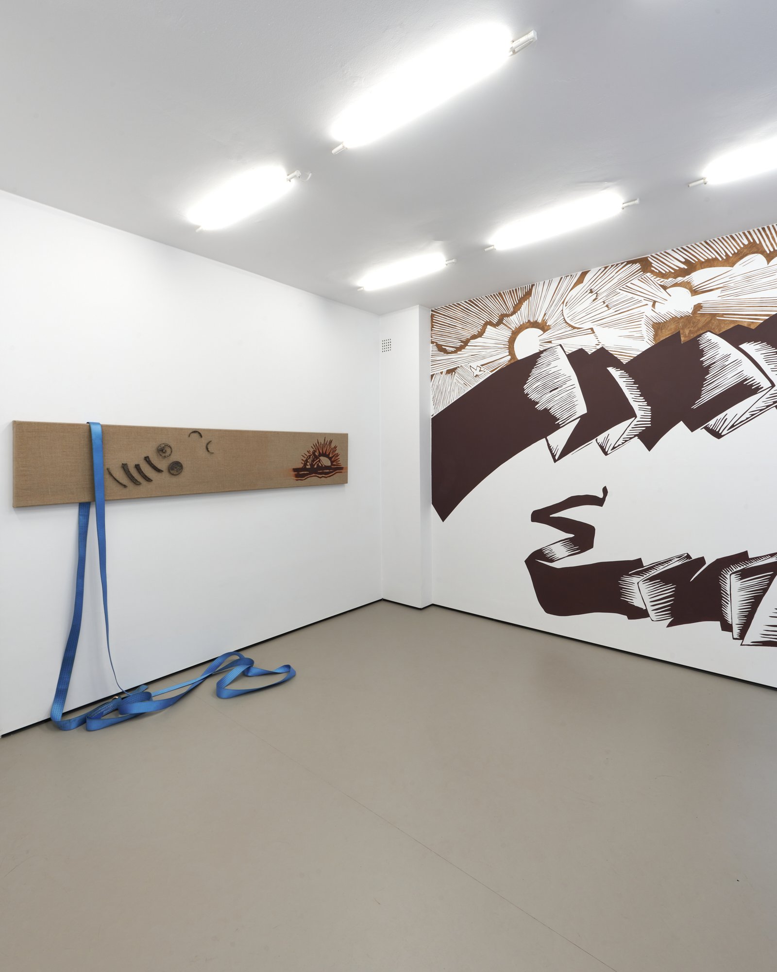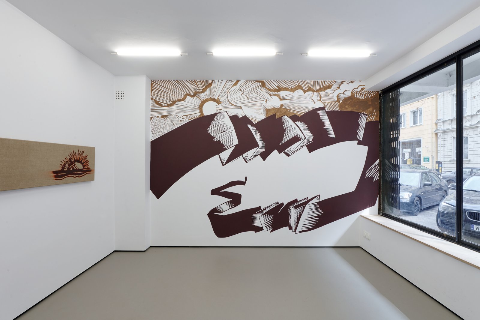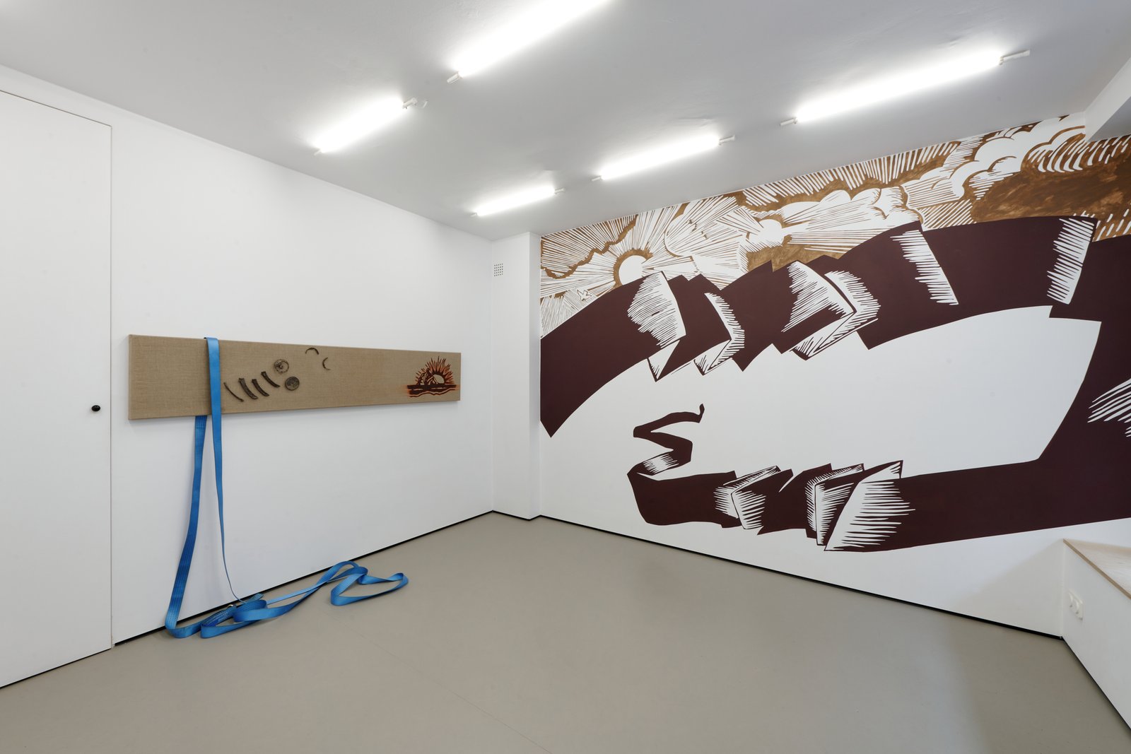 At the center of the exhibition is the fresco When the banner becomes a landscape, developed specifically for the space. It appears as if it had always been there uncovered rather than produced. Positioned between image and erasure, it presents a scene that is both familiar and unstable: a drifting banner without inscription and two suns suspended between reality and fiction. It is not a fixed narrative, but its trace something partially lost or never fully formed.