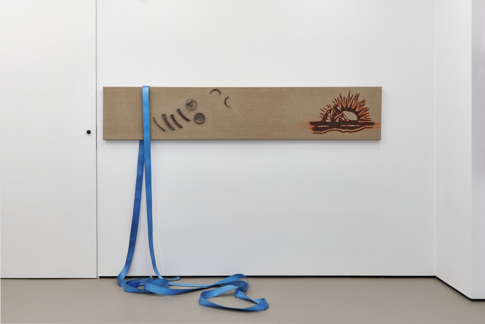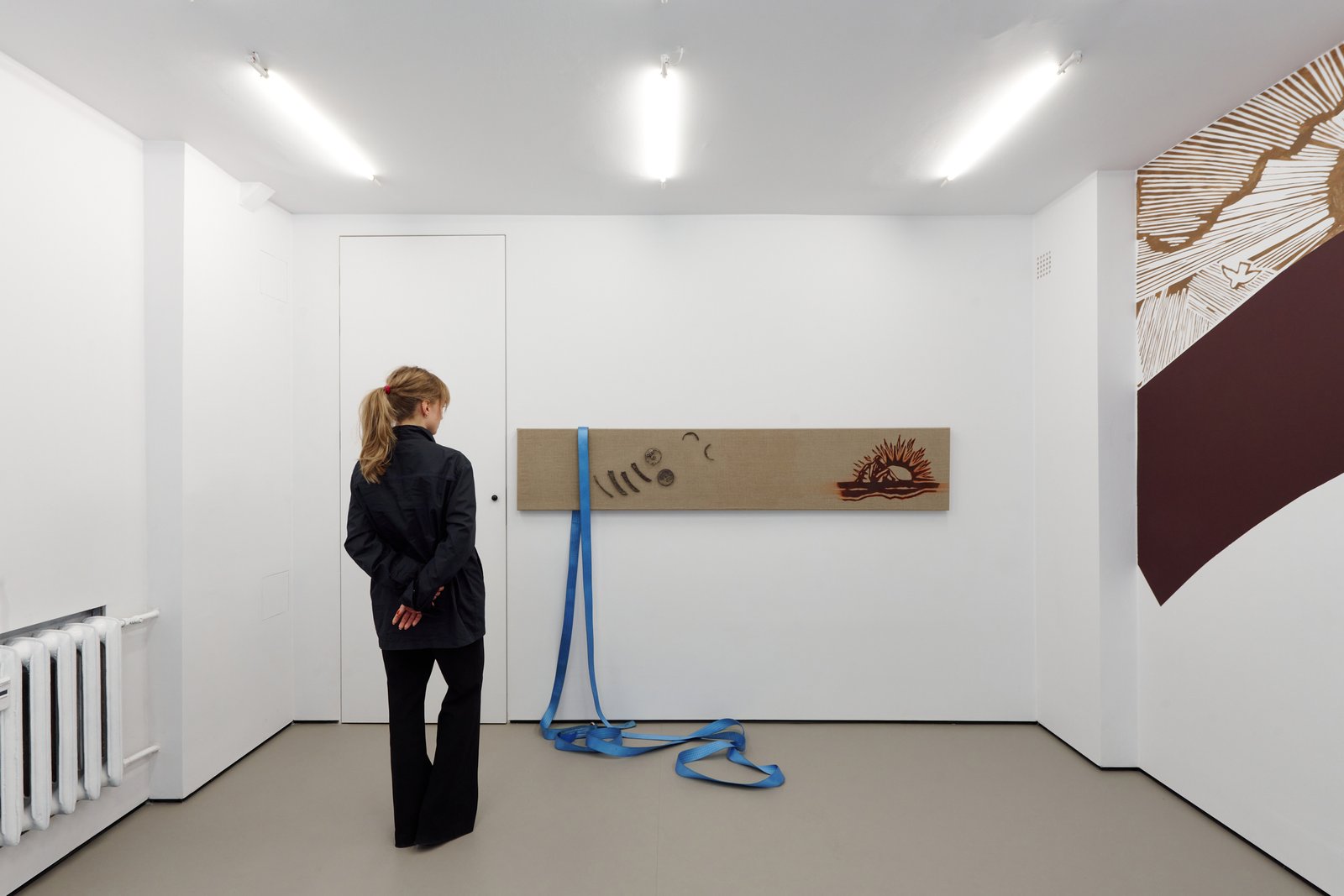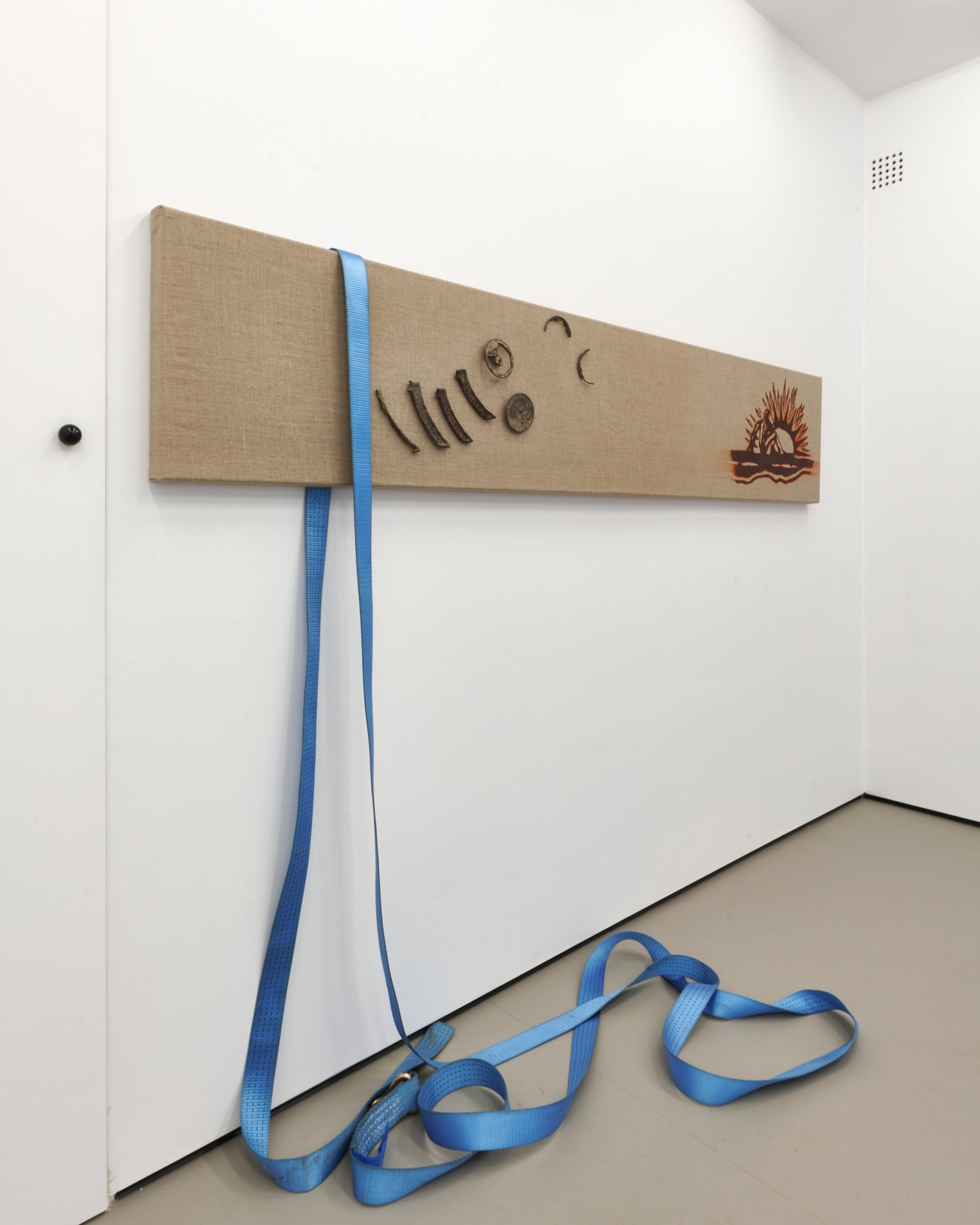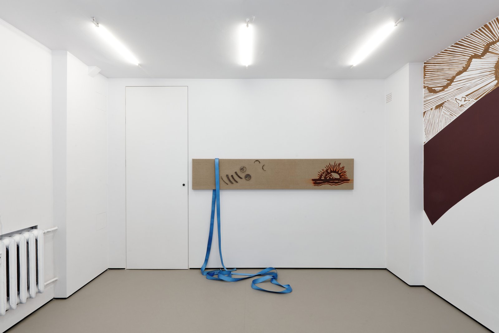 At the center of the exhibition is the fresco When the banner becomes a landscape, developed specifically for the space. It appears as if it had always been there uncovered rather than produced. Positioned between image and erasure, it presents a scene that is both familiar and unstable: a drifting banner without inscription and two suns suspended between reality and fiction. It is not a fixed narrative, but its trace something partially lost or never fully formed.