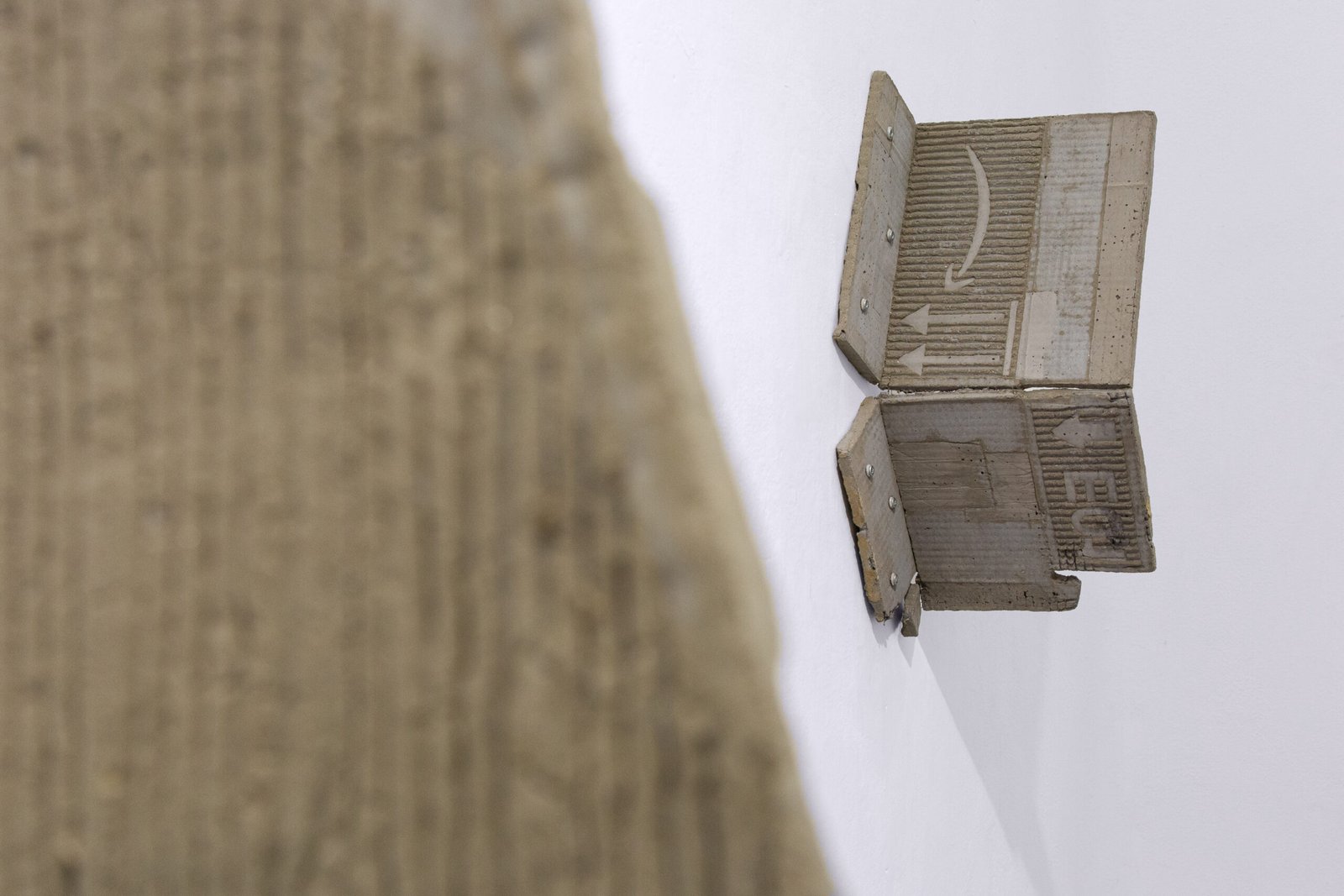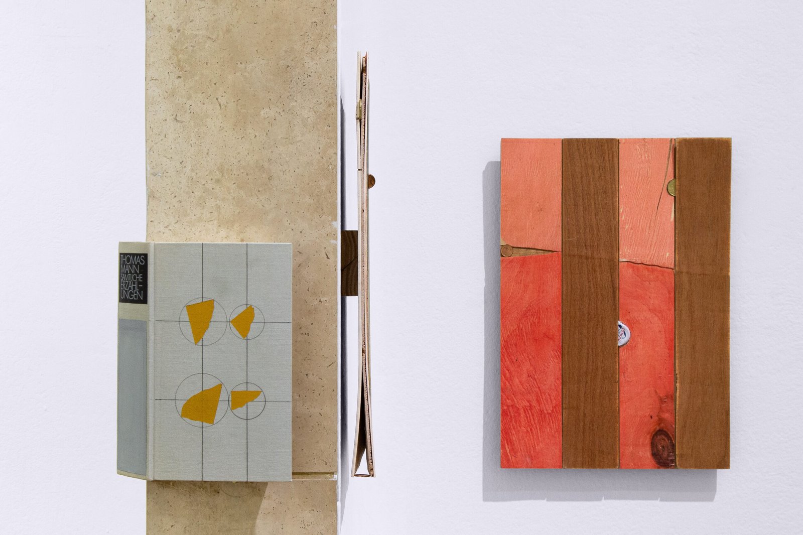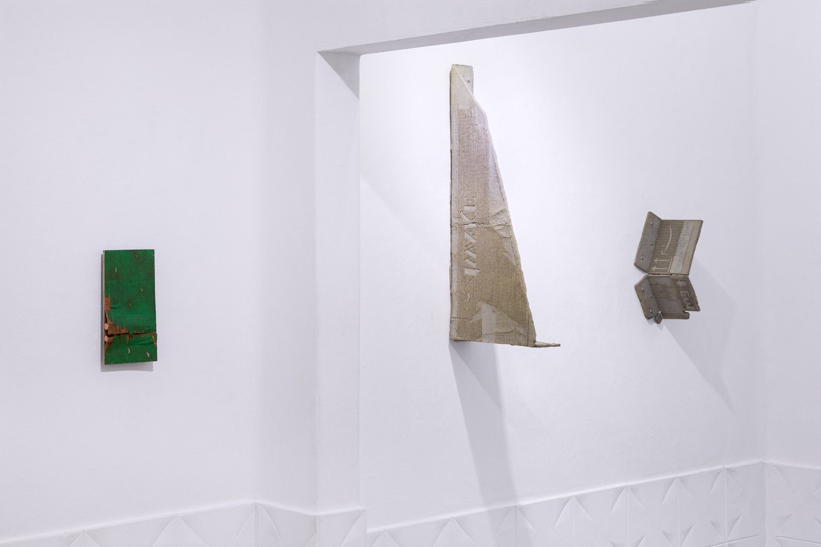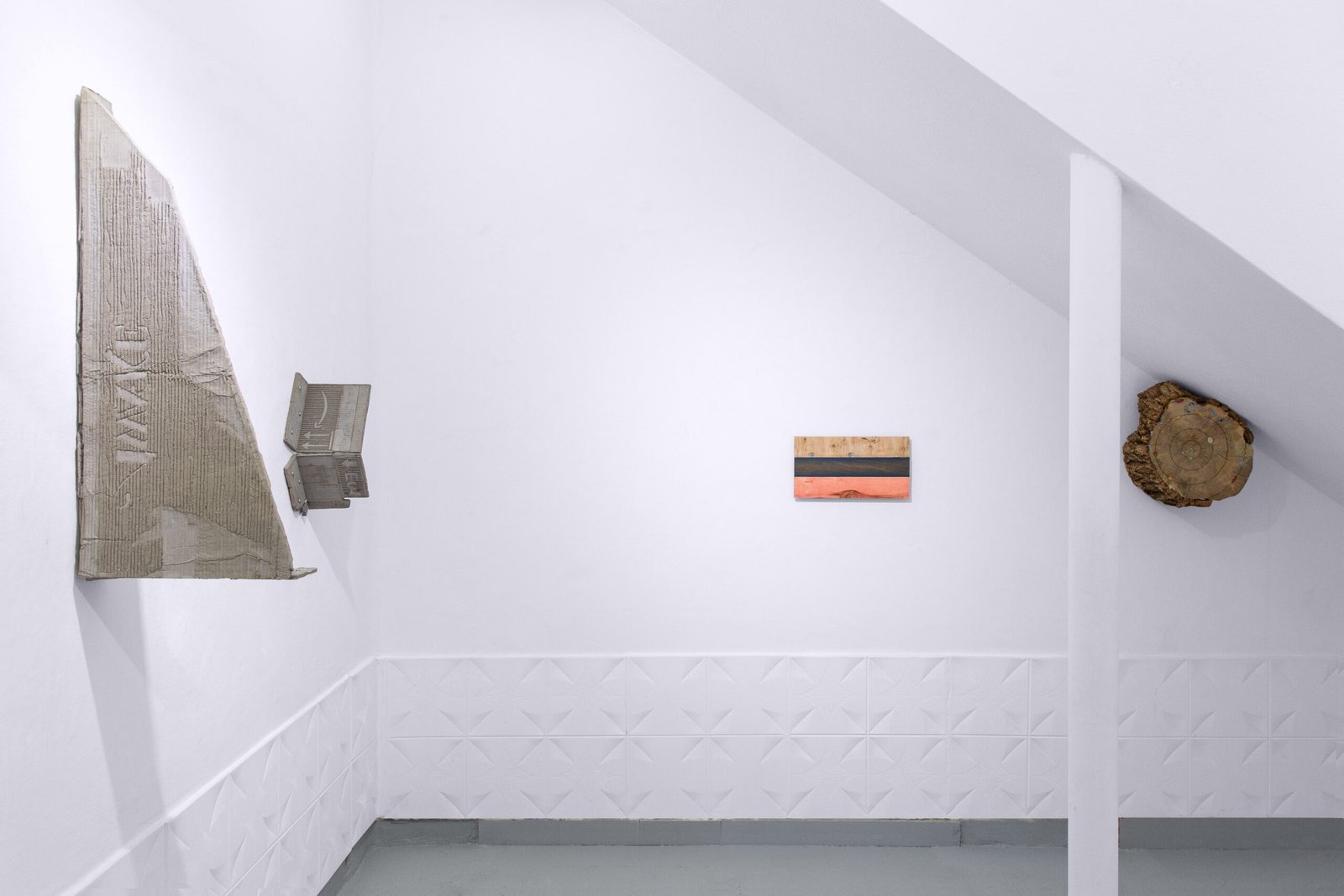 The exhibition at Satélite Gallery situates the works within a shared orbit. Close encounters with each piece reveal their past time, making it possible to perceive material memory: the trace of weathering in textures, former functions suggested by labels and graphic codes, or the intangible weight of words contained within a literary volume.