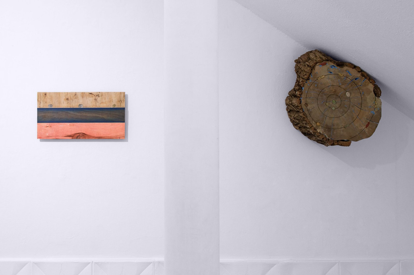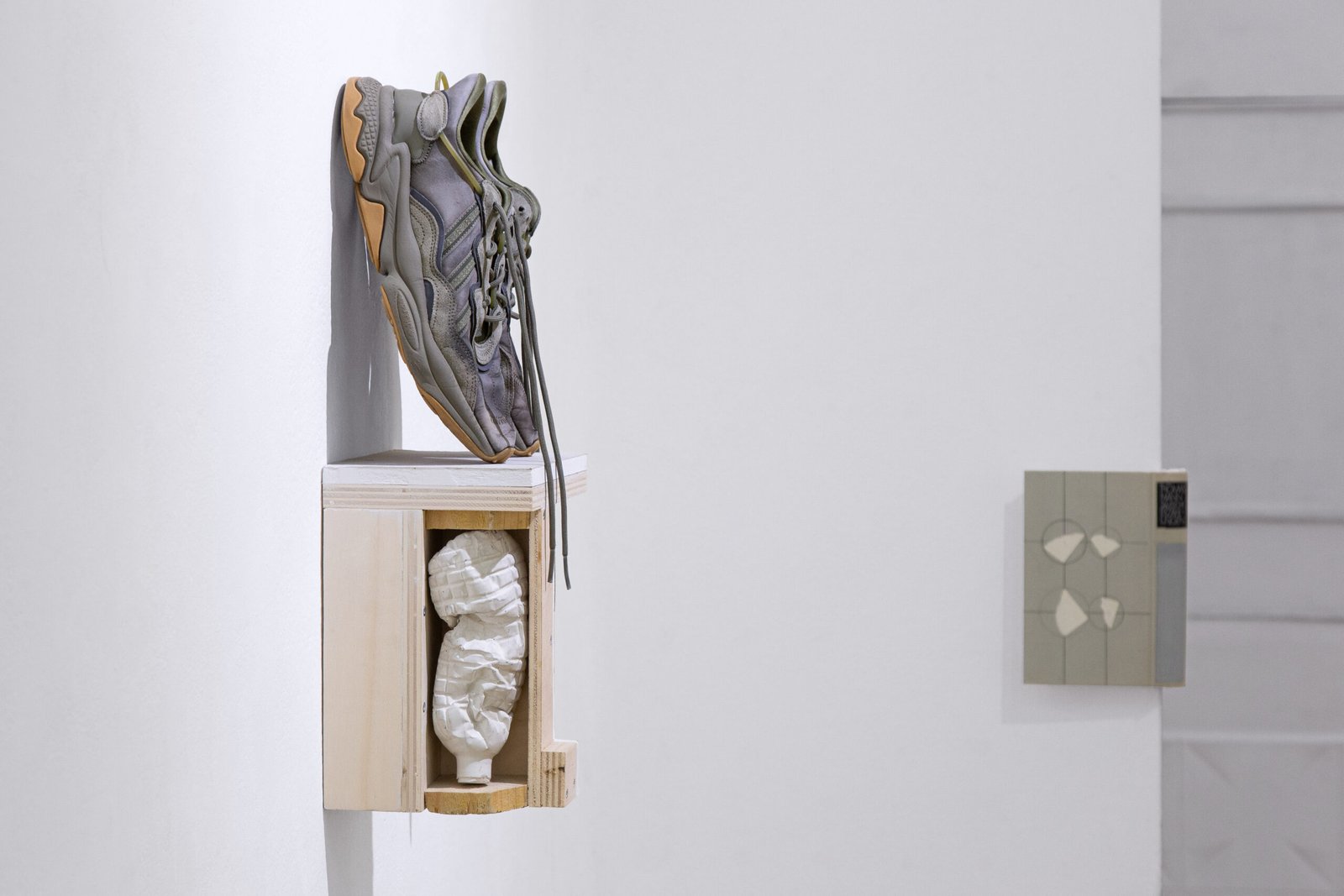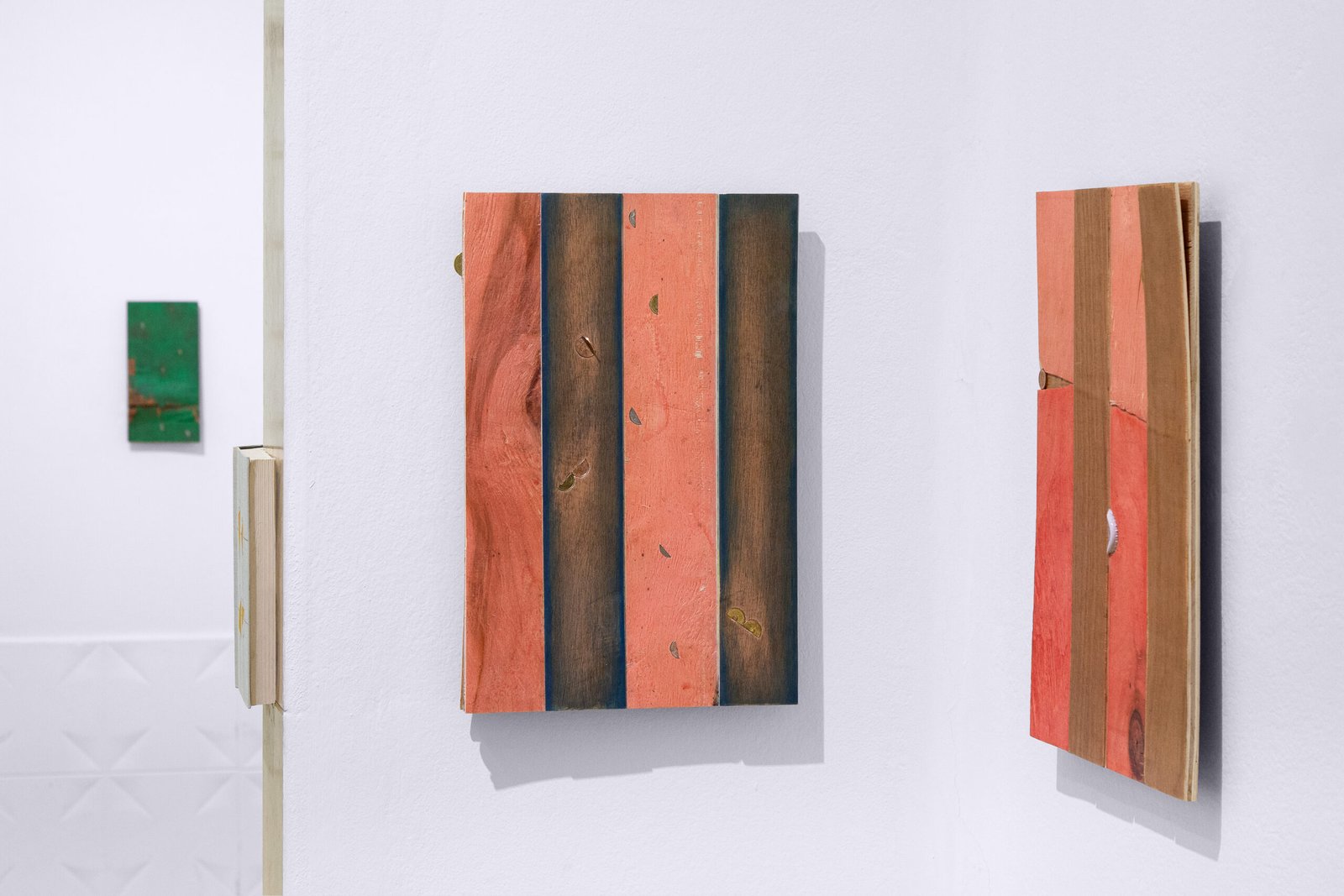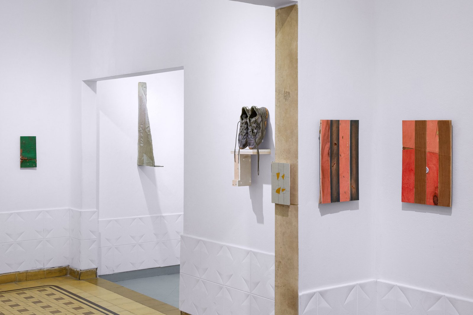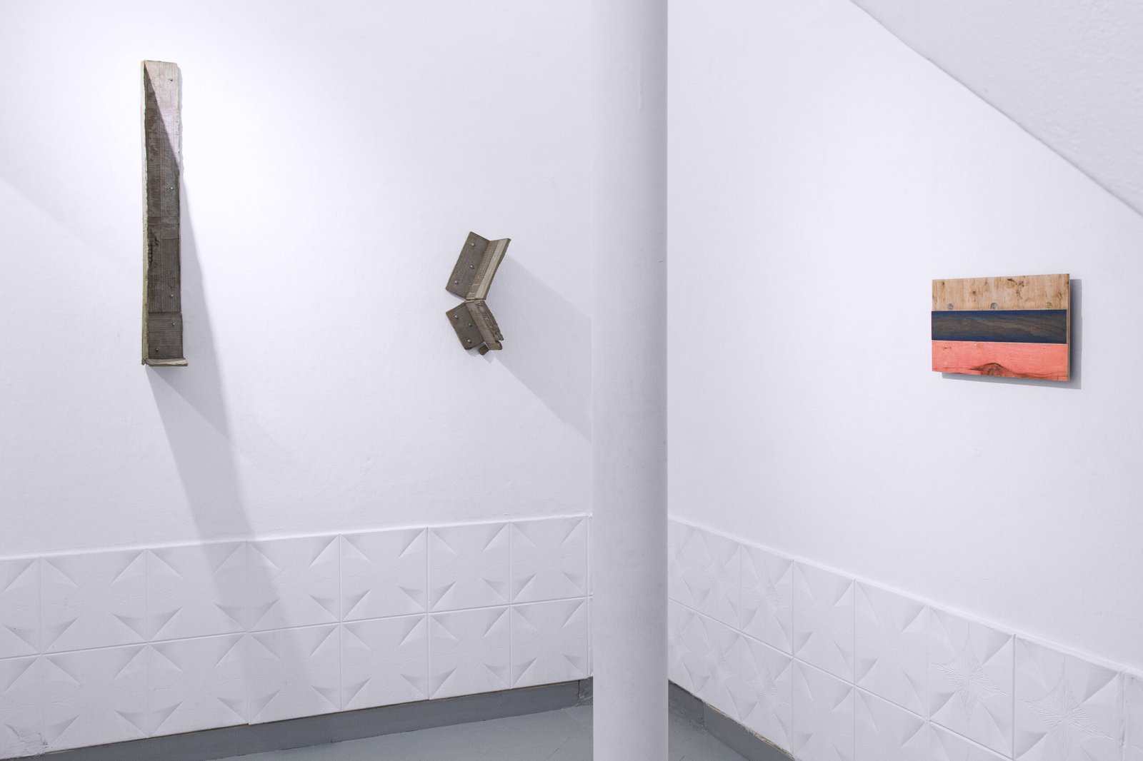 The exhibition at Satélite Gallery situates the works within a shared orbit. Close encounters with each piece reveal their past time, making it possible to perceive material memory: the trace of weathering in textures, former functions suggested by labels and graphic codes, or the intangible weight of words contained within a literary volume.