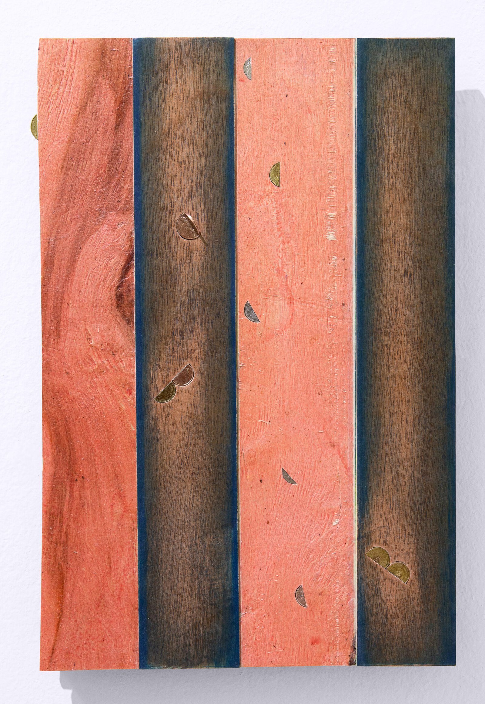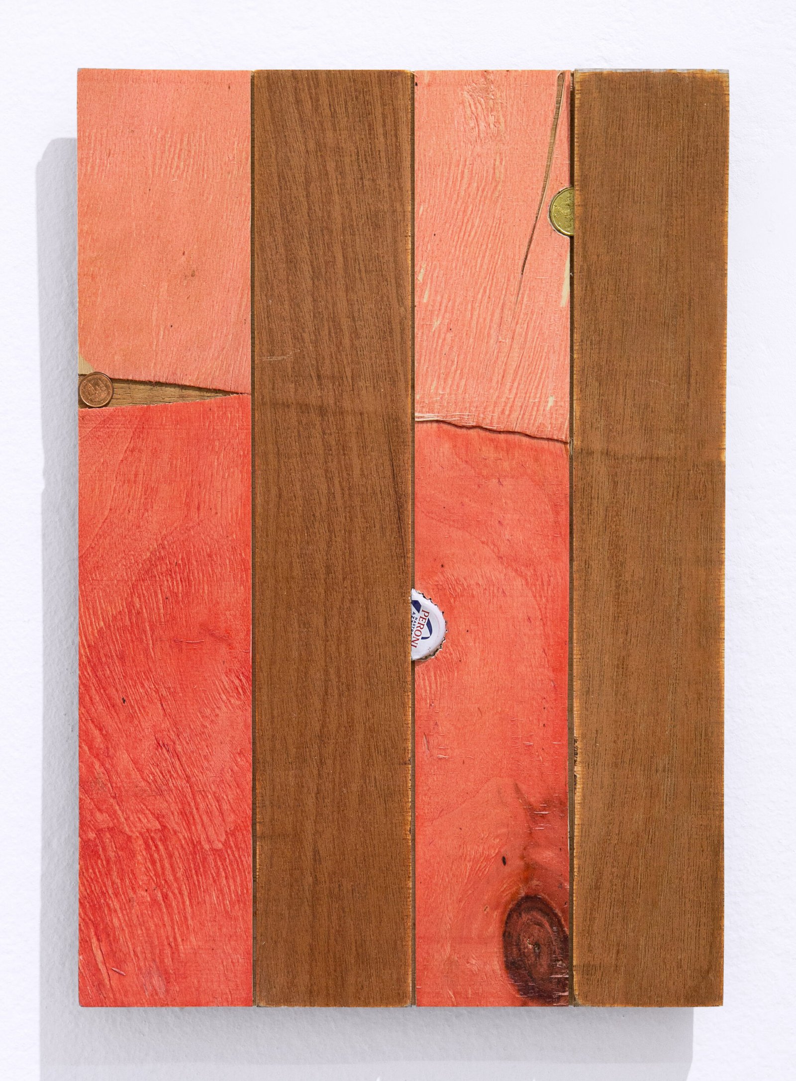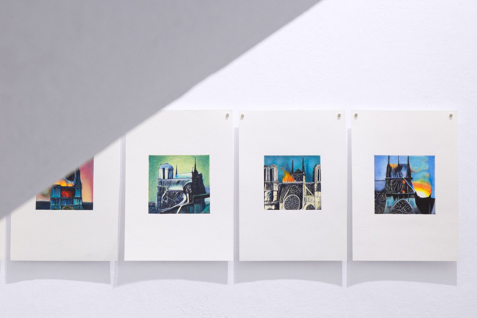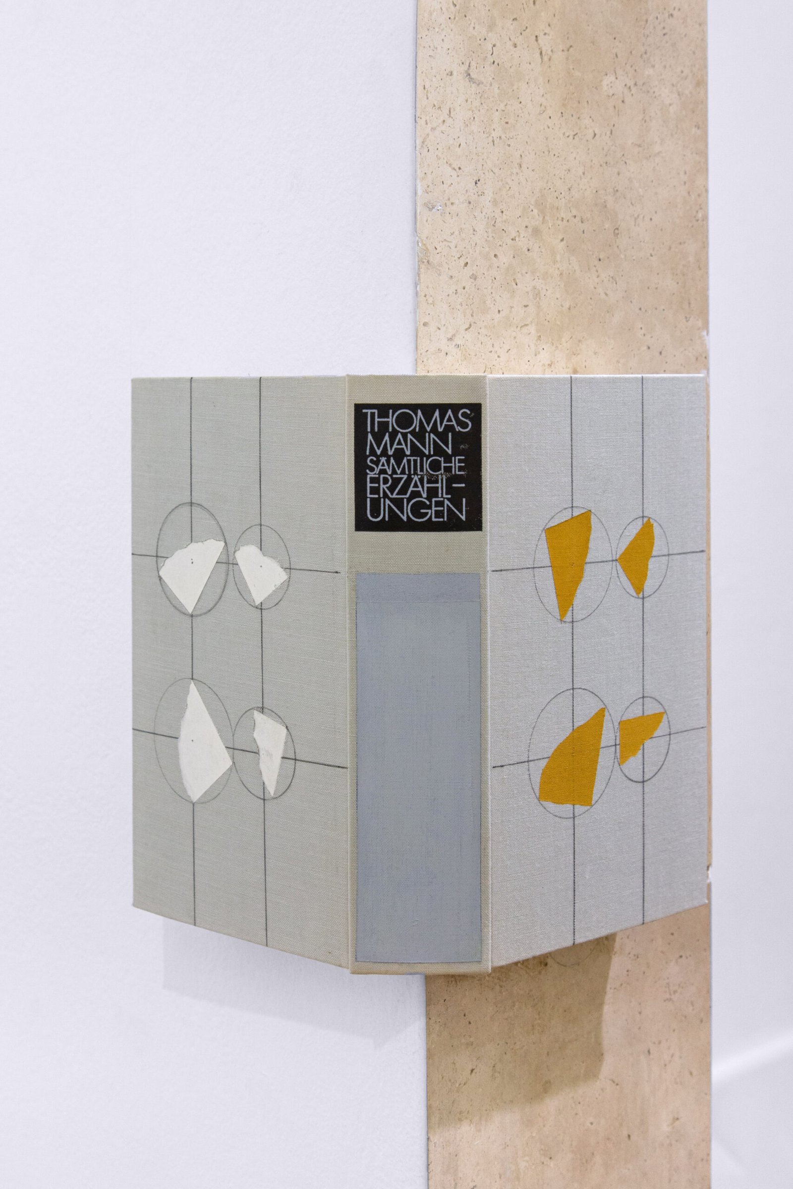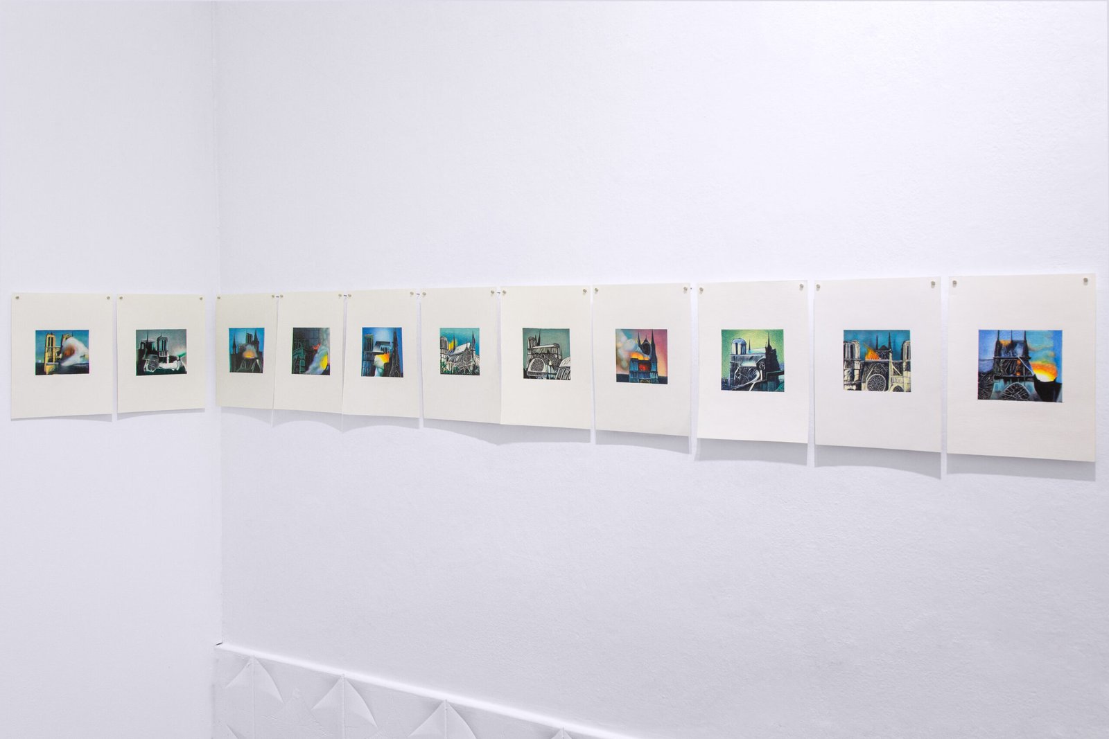 There are concrete casts of mass-distribution cardboard boxes; alterations to the covers of antique books by R. Louis Stevenson, Gustave Flaubert, and Thomas Mann; coins, bottle caps, and plastics assembled into various devices; a tree trunk embedded with chewing gum; and colored-pencil drawings that glimpse an enigmatic Notre Dame in flames, capturing the moment of transition between ruin and ash. Taken together, these works—drawn from different series—occupy the threshold of wear or material disintegration, a point that in this exhibition acquires a restrained and enduring dimension.