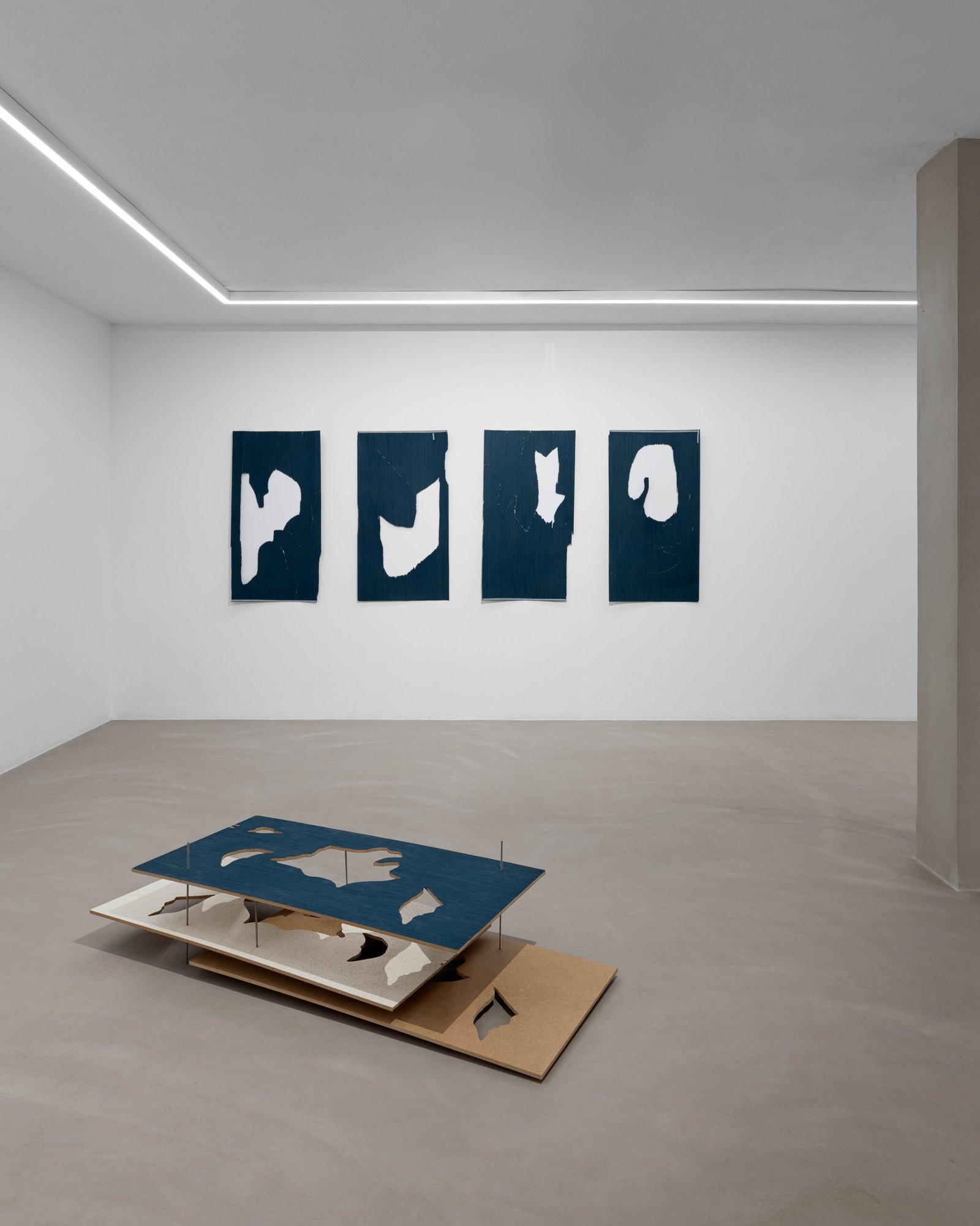 Sasha Saari expands painting by allowing it to shift state, interrogate its own language, and extend into space. Painting becomes an almost architectural construction that nonetheless appears fragile and vulnerable—as if it were a transitional stage rather than a definitive condition. Is anything ever definitive? Her series of watercolours and collages presents a layered blue landscape that slowly seems to dissolve.