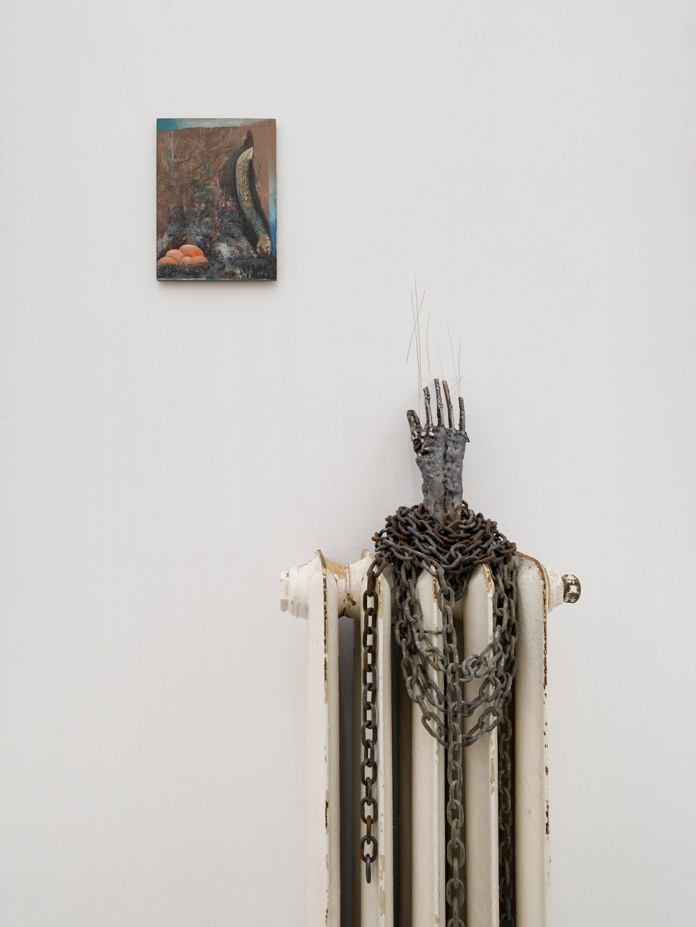 A taxidermied hoopoe (or dudek), suspended at the entrance, marks the passage into this charged interior. Echoing the artist’s family name, the bird introduces a logic of doubling and slippage that recurs throughout the installation. Within the apartment, a radiator bears a sculpted hand chained to its surface, while a small painting nearby depicts a snake poised above a clutch of eggs. Meaning circulates between these elements without settling into fixed allegory. Dudek treats memory as mutable and relational, subject to condensation, displacement, and recombination. Trauma is neither narrated nor resolved, but reworked through metaphor, material juxtaposition, and a deliberate openness that allows play and ambiguity to coexist with gravity.