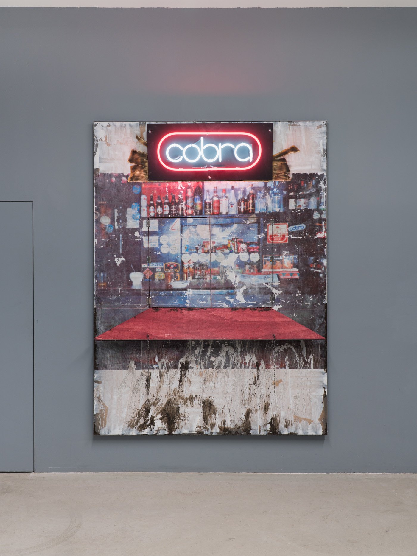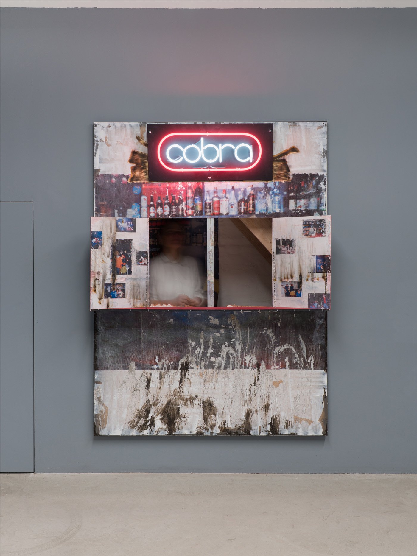 Exiting the apartment, visitors encounter a large painting depicting the surrounding housing estate as a single, looming form. The work is painted over a panel which carries almost three hundred thousand tiny cuts of medical tape, remnants of an abandoned attempt to tally each inhabitant individually, before the mass became too large to count. The painting’s surface remains animated by this buried labor, its marks suggesting bodies in motion and collective presence. From here, the exhibition extends into a reconstruction of Café Cobra, an underworld bar from Dudek’s former neighborhood. Like many such spaces embedded within social housing estates across different geographies, the bar operates as a site of informal community, social ritual, and cultural memory, even as it remains vulnerable to erasure.