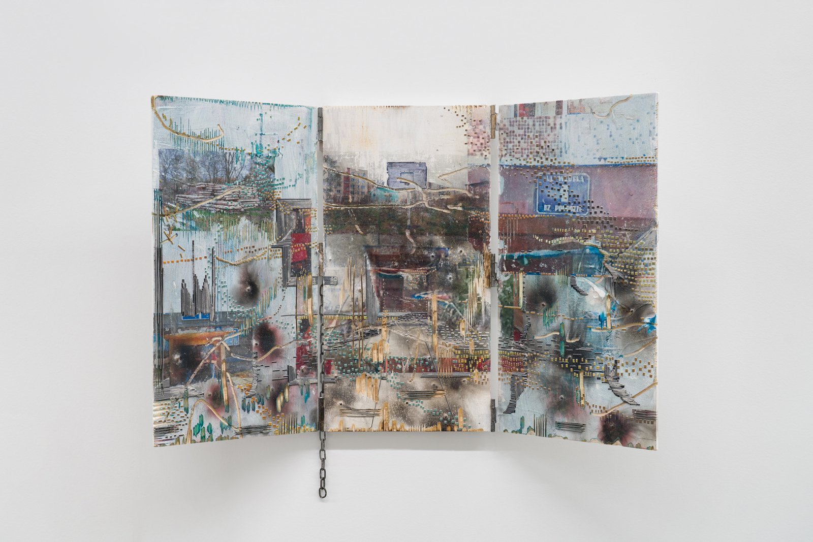 The installation preserves material traces of Dudek’s youth, including windows, curtains, photographs scorched into the walls, court documents, early sketches, and magazines that once offered a mental escape. These remnants are interwoven with gestures and artworks that summon lived moments rather than reconstruct them: the glow of a television, the repetitive training of a brother in the living room, parcels of dry goods and coins sent through international aid networks, an early oil painting that once hung in the kitchen, the low acoustic presence of hunger and failing infrastructure. Four works from the Klatka series appear as altar-like structures that fold open like manuscripts or journals, recording fragments of life on and around the housing estate. Together, these elements form an environment where memory and imagination overlap, and where the past persists as an affective, dreamlike presence rather than a closed narrative.