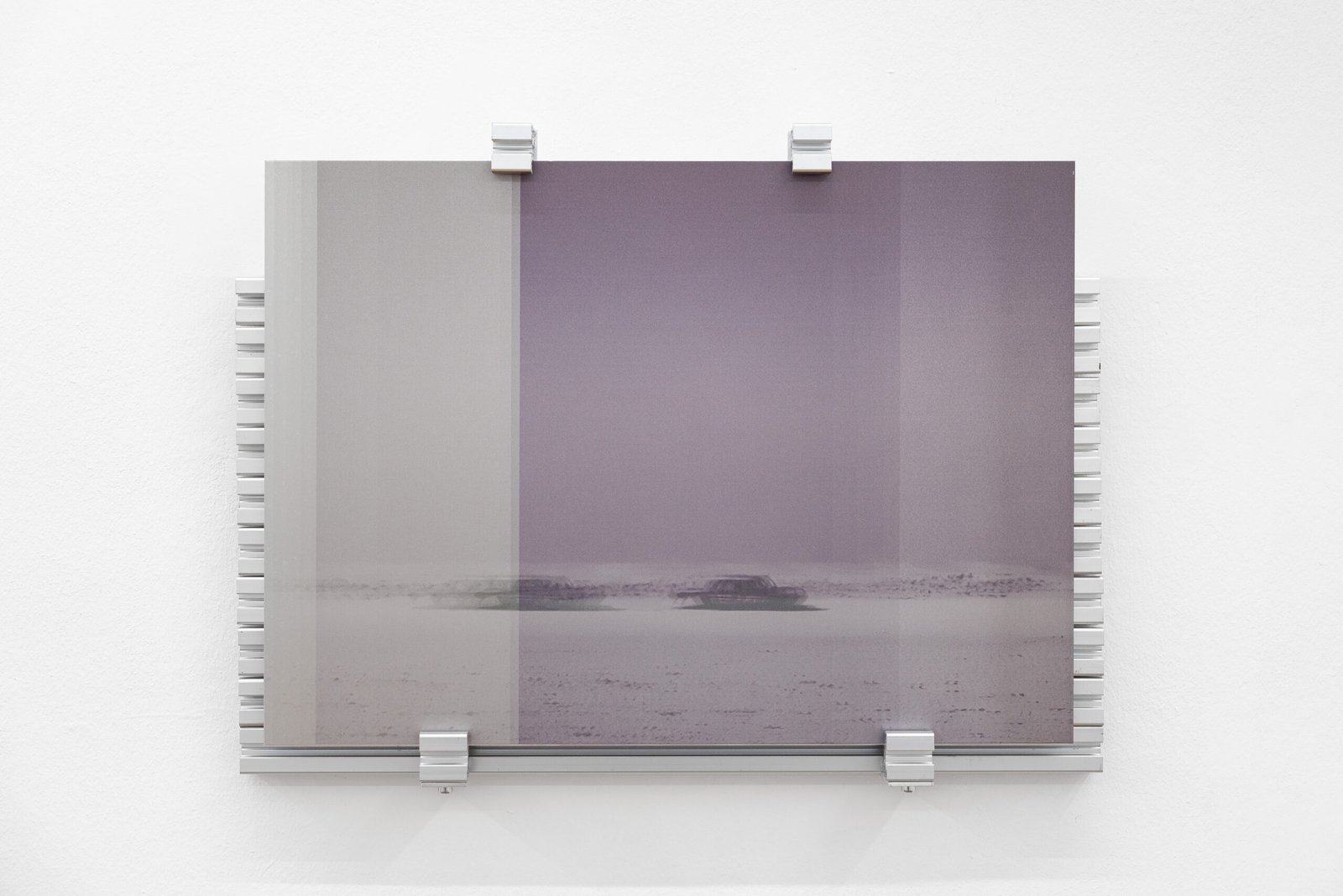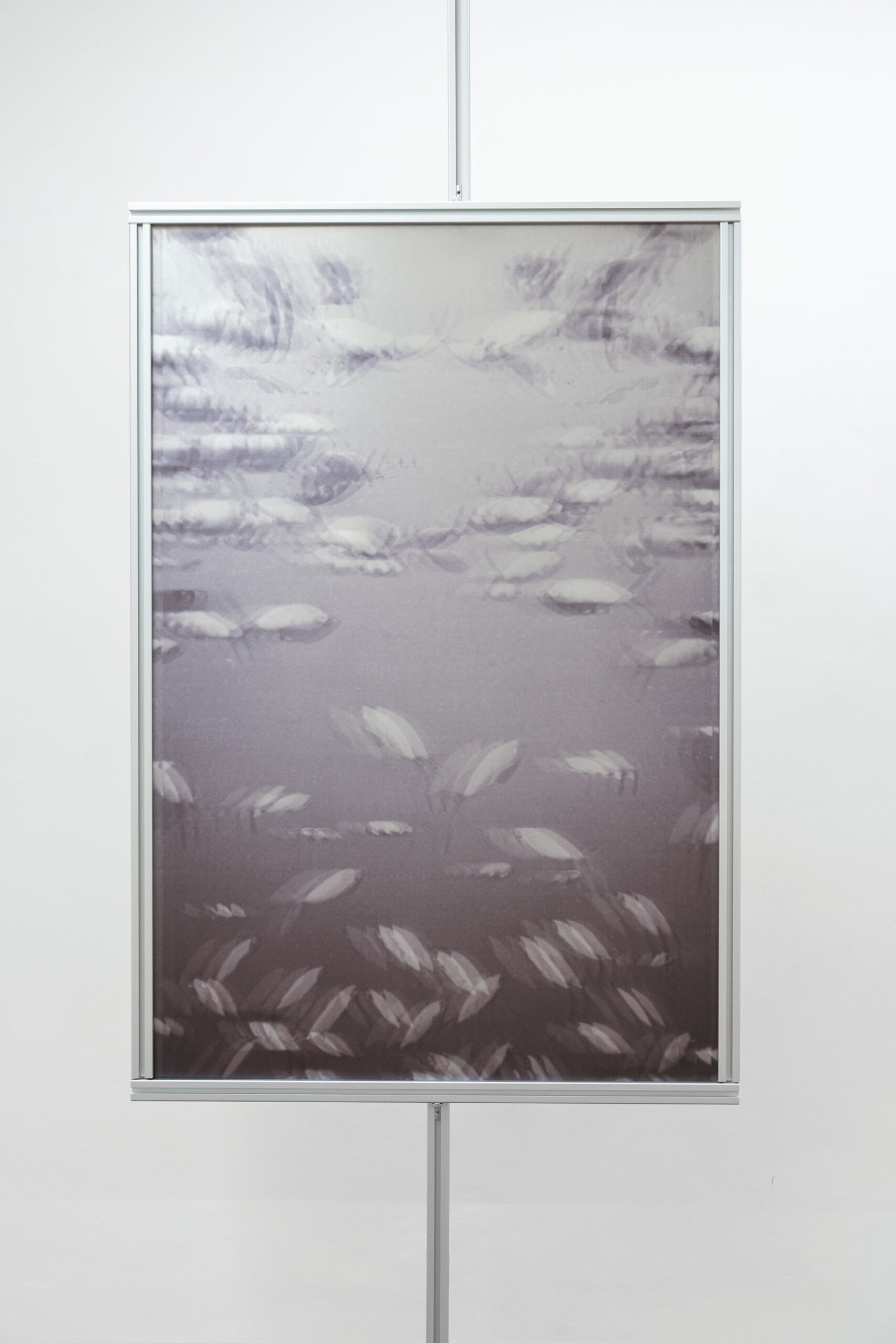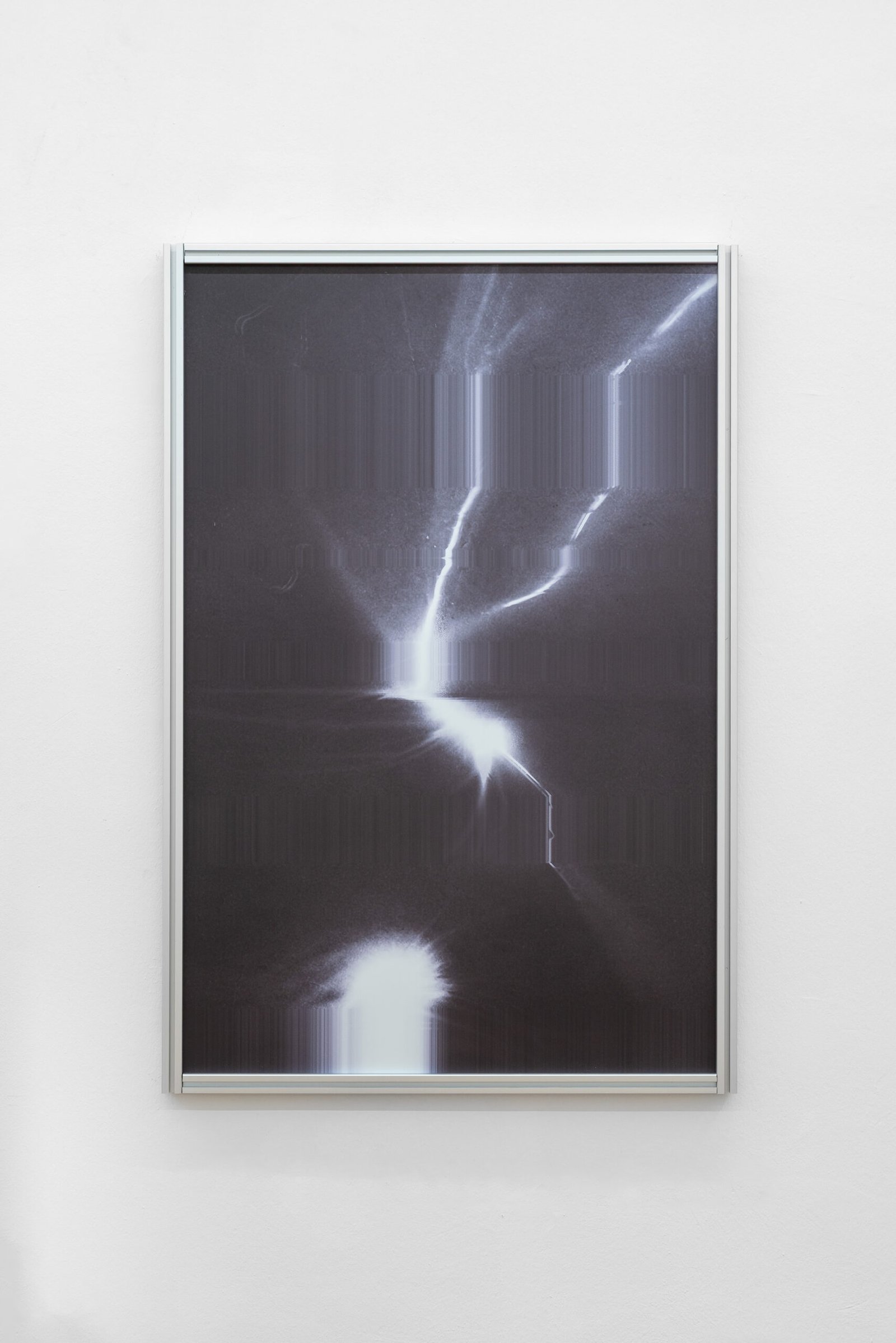 Multi-layered pigment prints on aluminum panels cite the materiality of the daguerreotype, that early photographic process of the 19th century in which light inscribes itself directly into metal. Yet in Vall’s digital image production, surfaces are not singularly marked by light—rather, digital processes simulate its trace. The basis of the works are motifs generated from found images and subsequently edited by hand. Evocative underwater worlds (“past tense”), natural phenomena (“brainwave dreampattern”), shadows of invented apparatuses (“gray dog (vibrant)”), or collections of knowledge (“future tense”) challenge established expectations of photographic image-making processes. At the same time, they embody photography’s progressive, often quasi-scientific urge to constantly test new techniques. It’s an appropriation through imitation that Vall consistently pursues in her work.