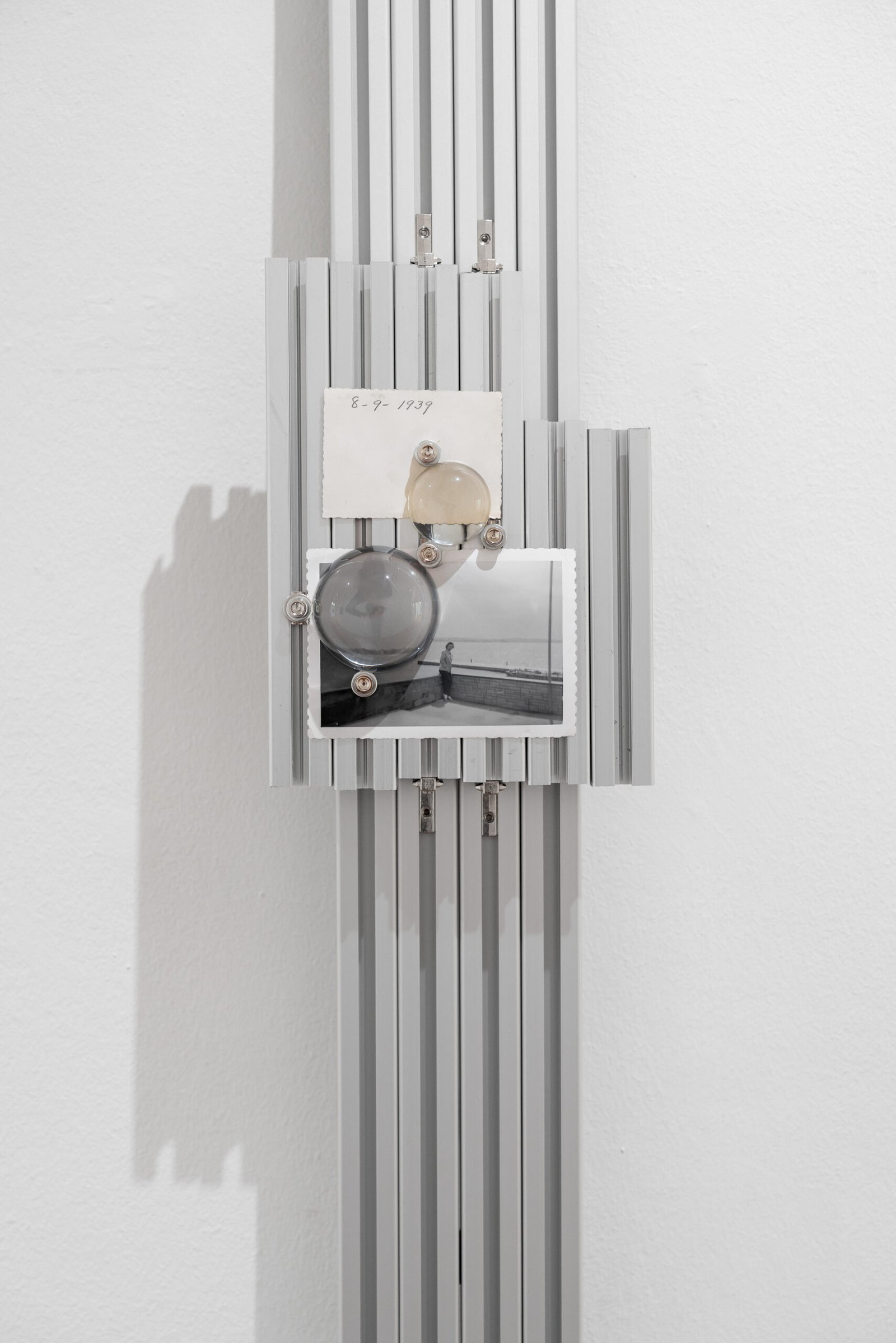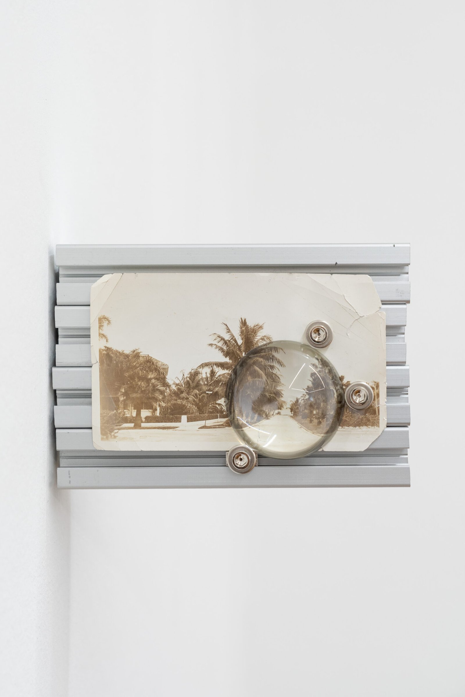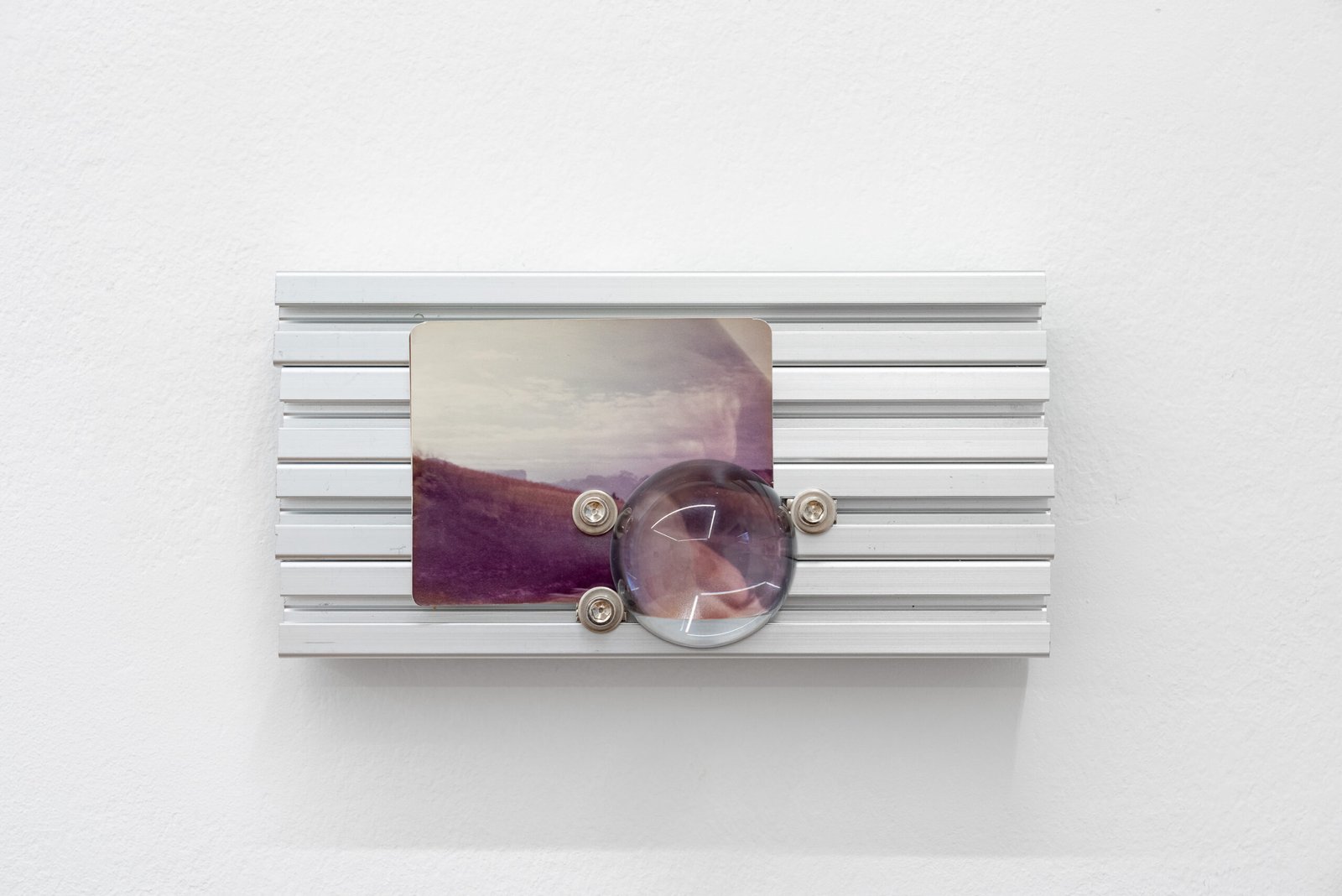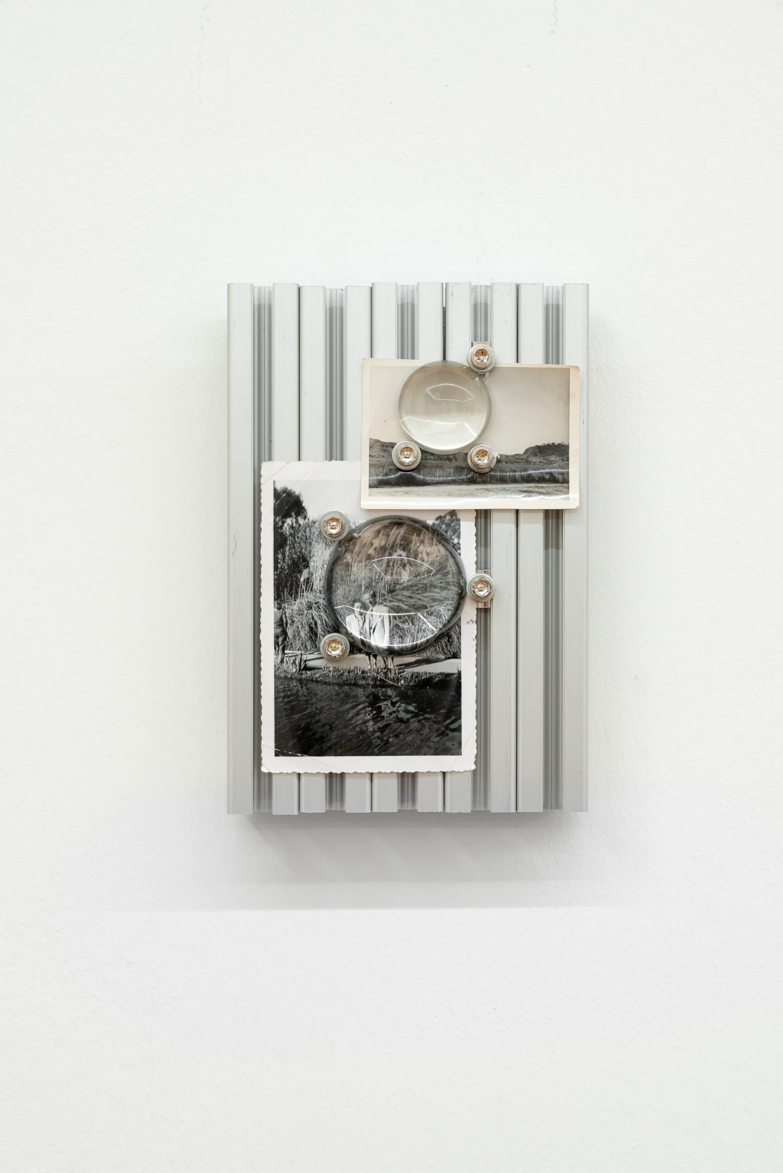 In the “capsule” works, Vall uses found photographs from a second-hand store in Williamsburg, which she samples, dissects, and restages. Private photographs without context, whose worlds we imagine, supplement, and project from gaps. Magnifying lenses enlarge and focus image sections while simultaneously distorting them and reflecting back the surrounding space. In “The Miracle of Analogy: or, The History of Photography” (2015), Kaja Silverman writes that “photography’s truth is disclosive, rather than evidentiary”—photography does not make visible what was, but is rather “development, instead of fixity.” The images are memory pieces of a fictional past that, according to Vall, “lie grammatically in the future perfect”—partial satirical crystal balls revealing something photography will have brought into being.