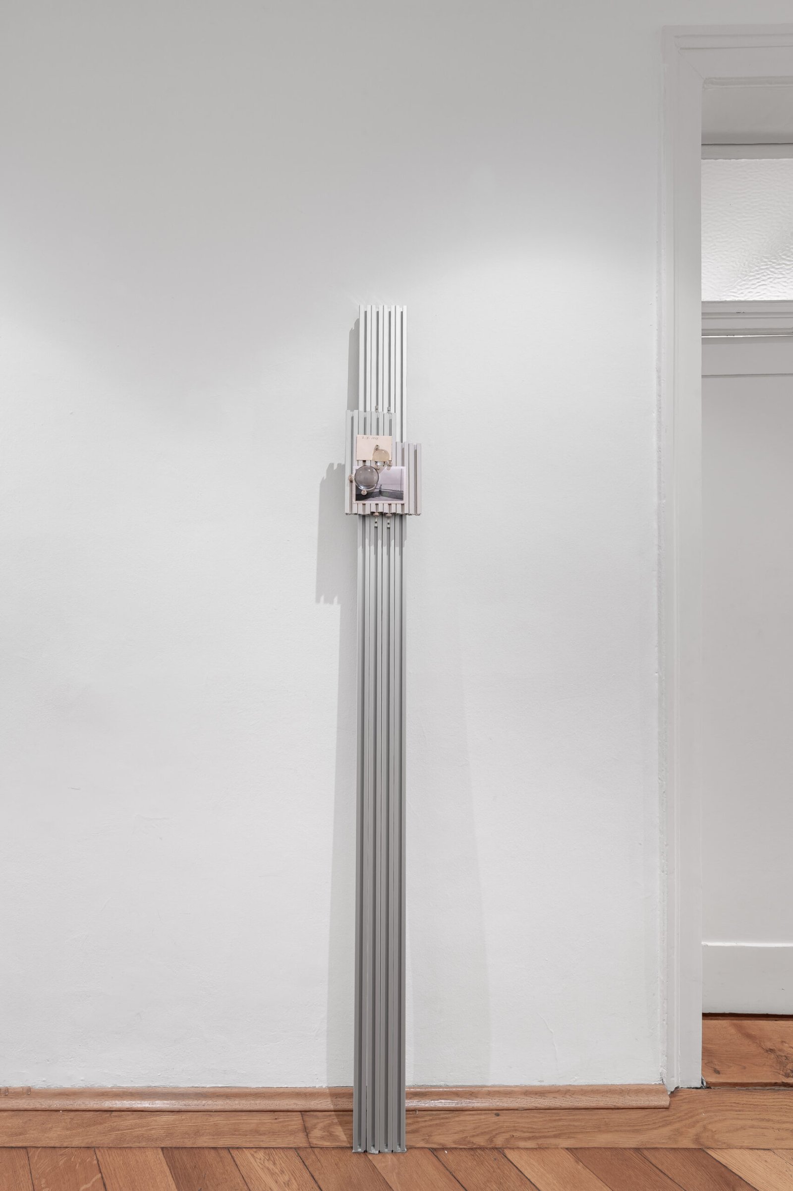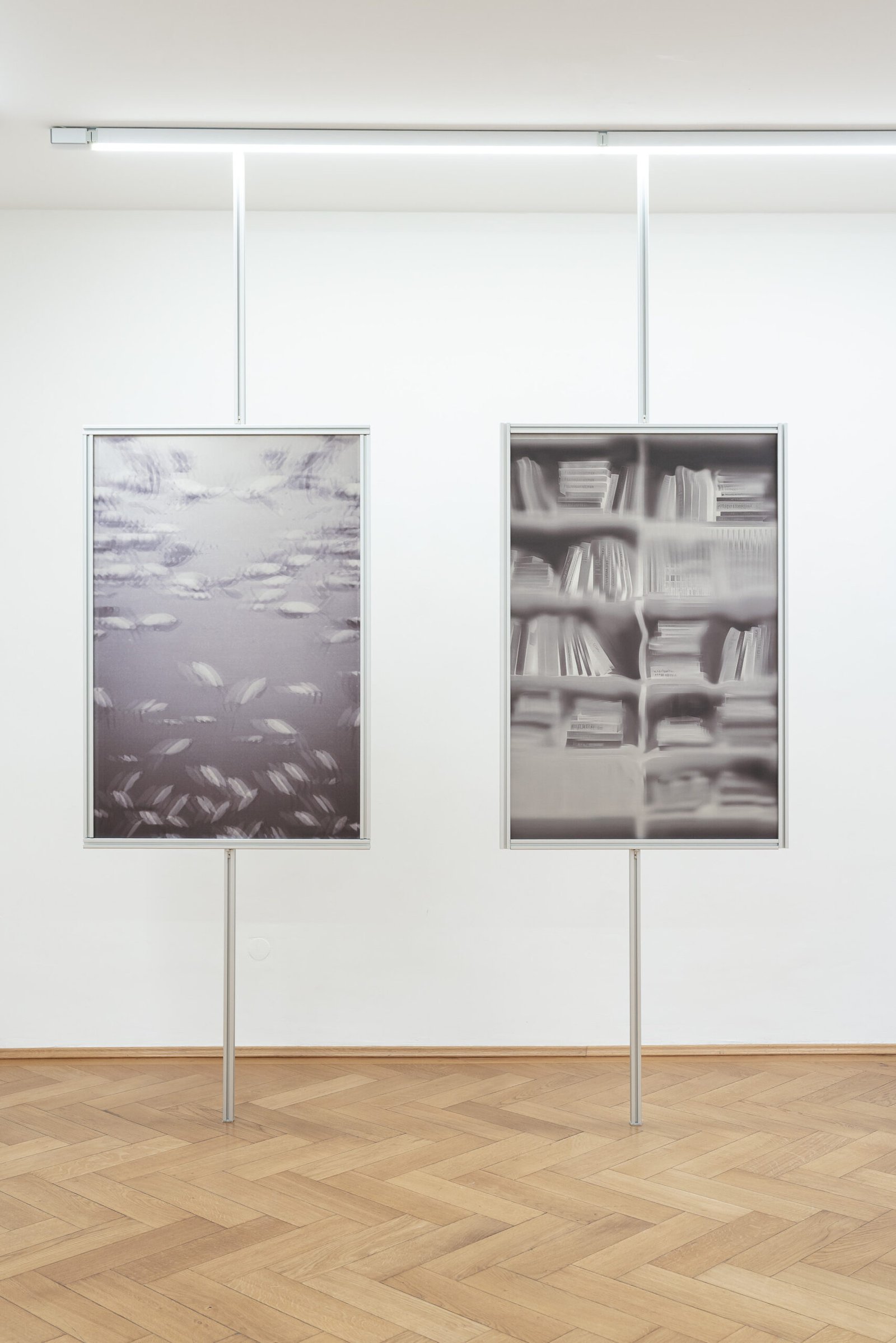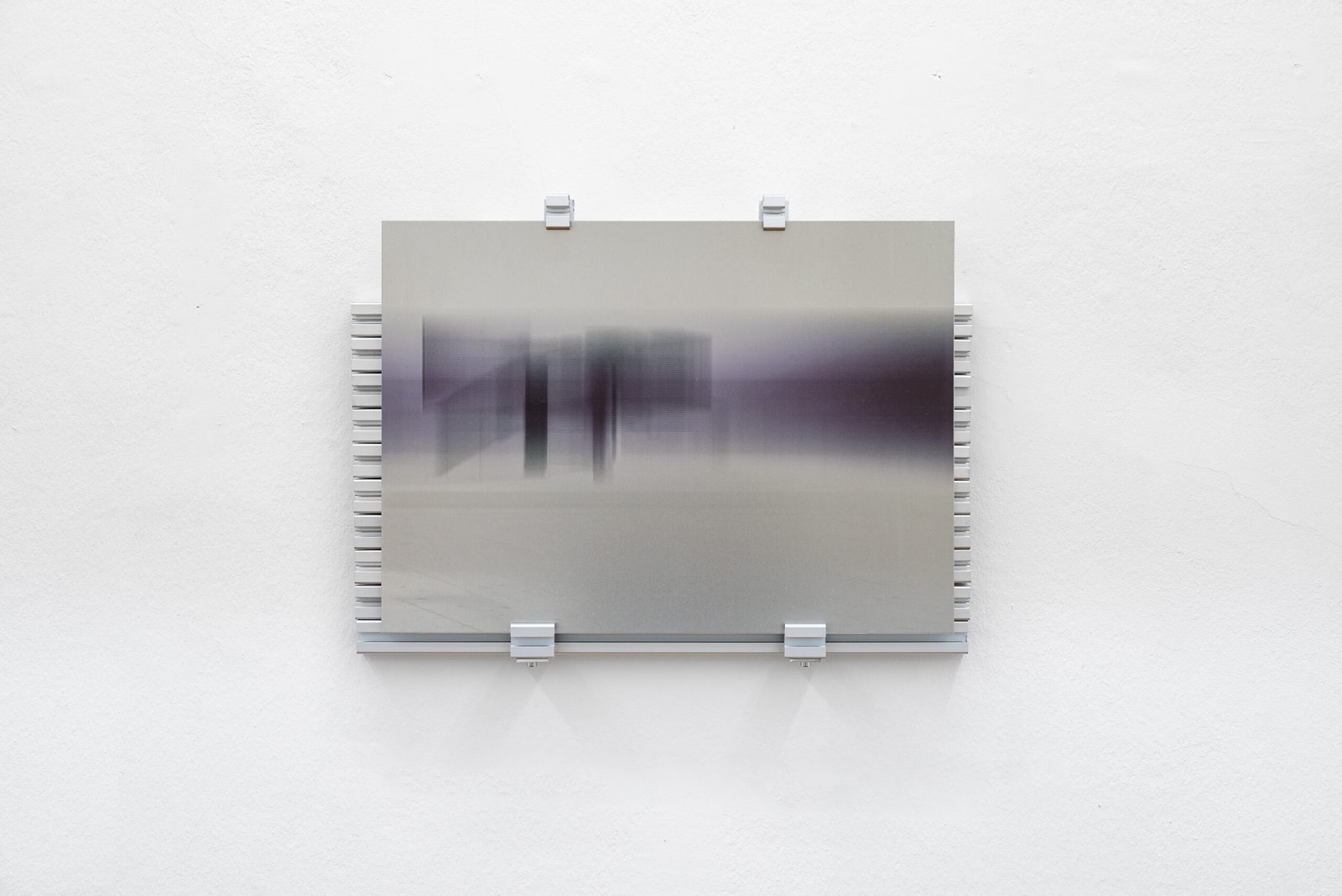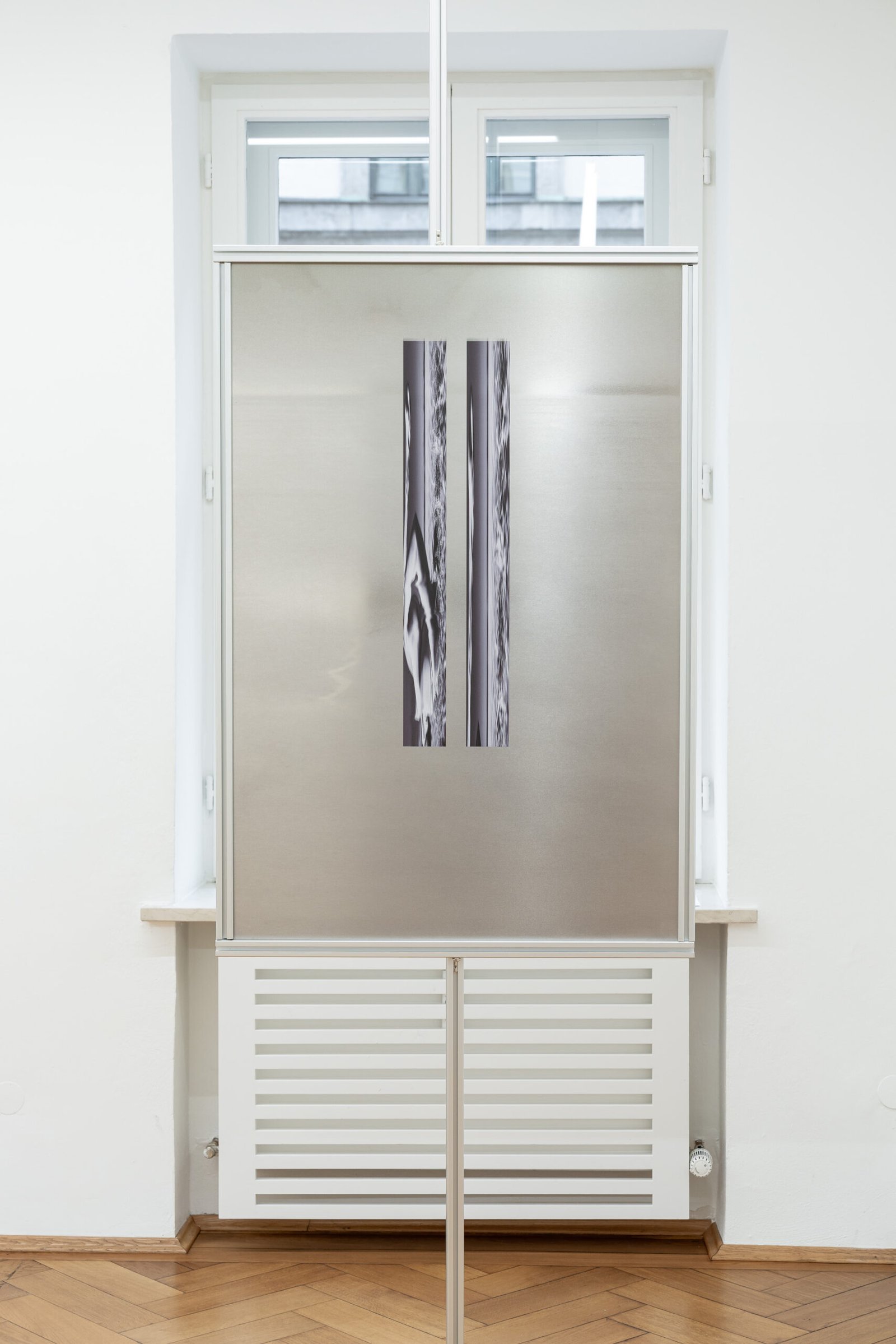 “new gravvvvity” is the title of the exhibition and becomes programmatic in its repetitions and intentional glitches: the interferences in these works—double exposures, fades, stamp patterns, irregularities and blurs—ask not what an image depicts, but rather what it generates—how it loads, renders, or prints. The works are not witnesses to the “having-been-there” (as Roland Barthes termed it); time manifests itself in the image process—as a construct between subjective experience and technical production. Many of the works are set in aluminum profiles, those standardized system components that remain recognizable as mass-produced industrial parts—and yet function in the exhibition as framing, as ornament, as space-occupying structure. This simultaneity of disclosure and auratization runs through the artist’s entire practice, including the modular sculptures “vvvvertigo,” “ssssensitivity,” and “blind eye (gray star)”; these works imitate optical effects and adopt the role of teaching objects in their demonstrative function.
