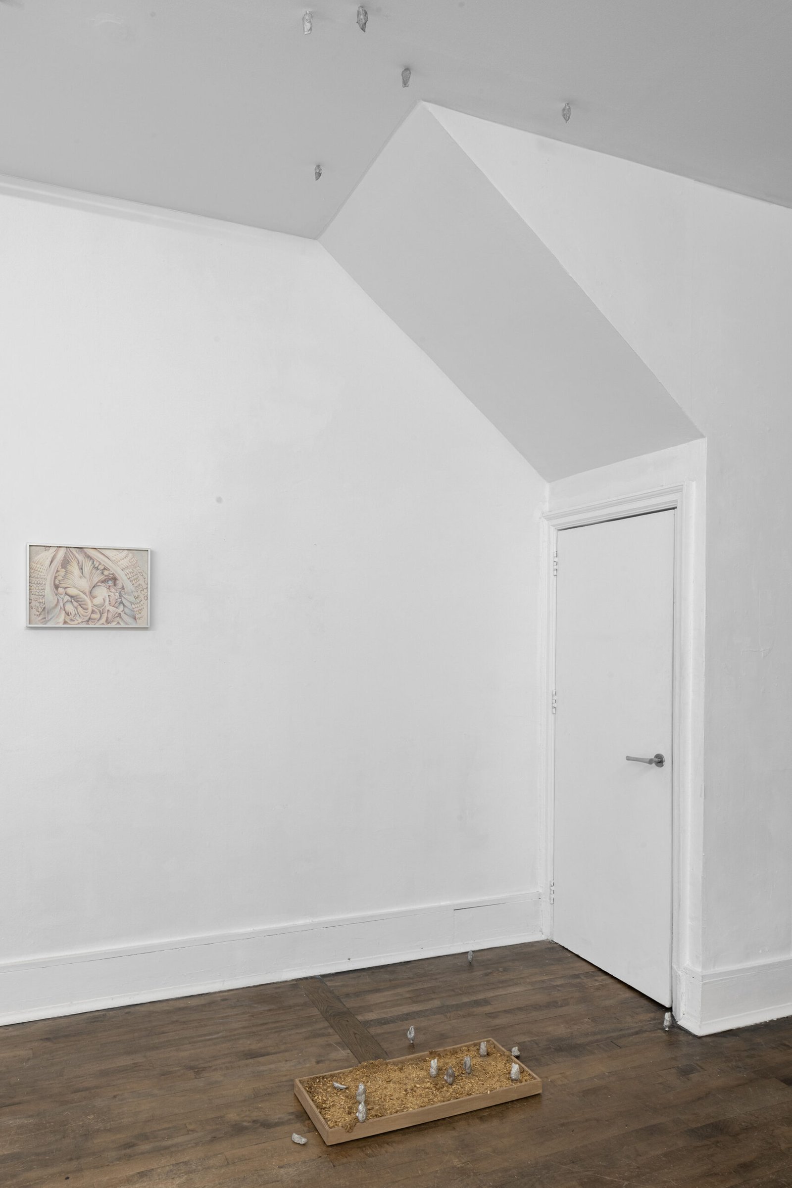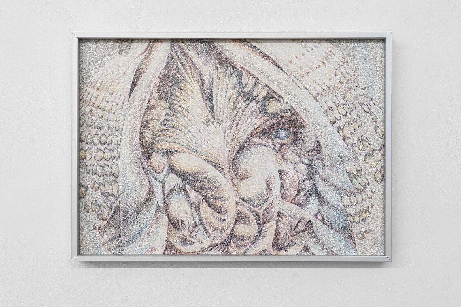 Pacelli engages this territory with precision rather than mysticism. The exhibition gathers five wall pieces and three sculptures, each one emerging from a different technical universe. Colored-pencil drawing, mark-making, wood engraving, metal casting, Raku ceramics, and hybrid material processes sit together without resolving into a single style. Their dissonance is intentional: each technique behaves like a separate hypothesis about what matter might do before it becomes matter-as-we-know-it.
