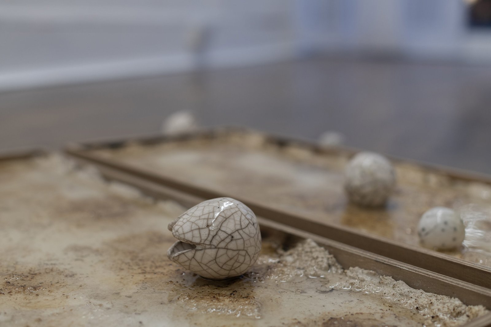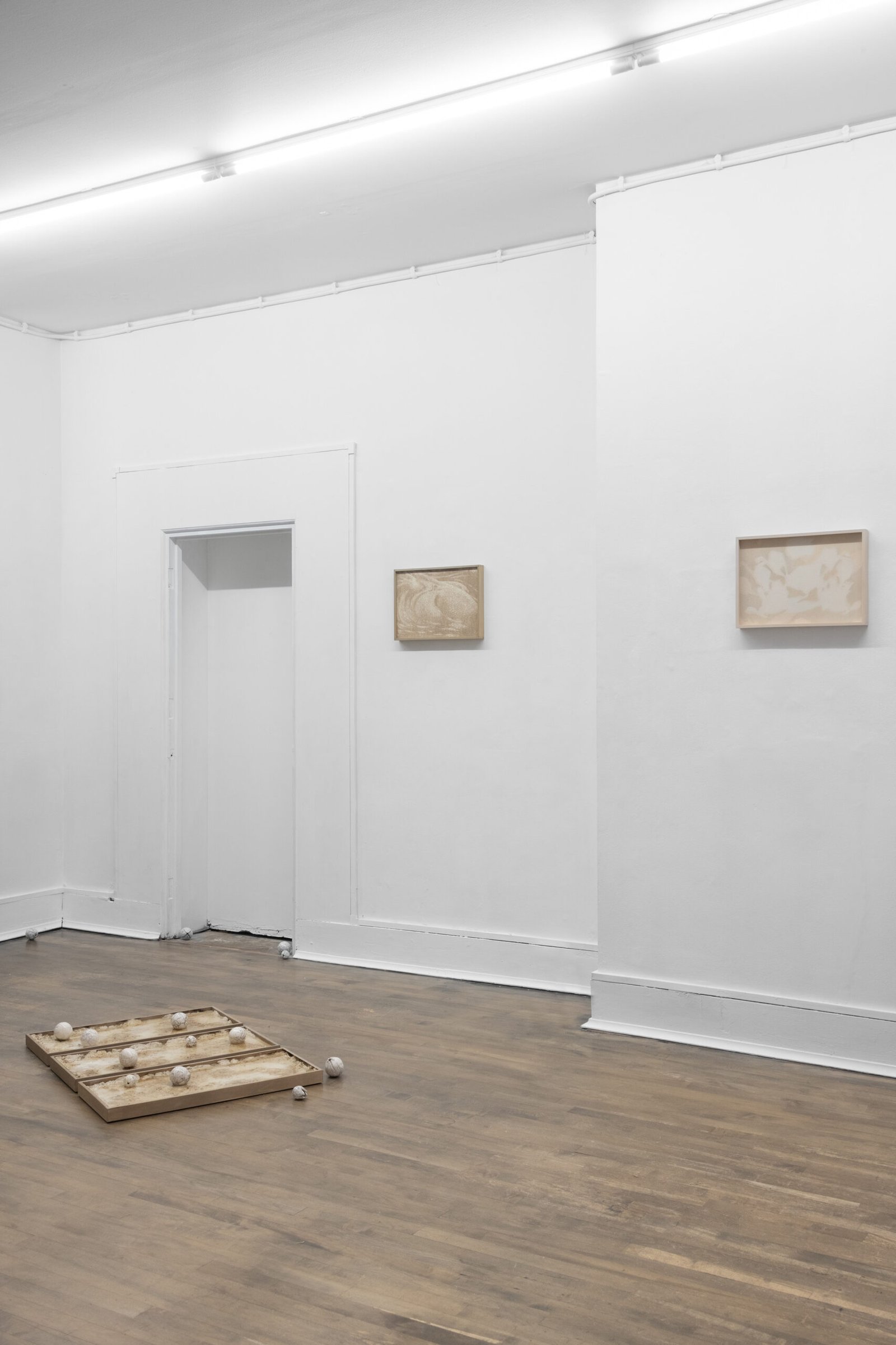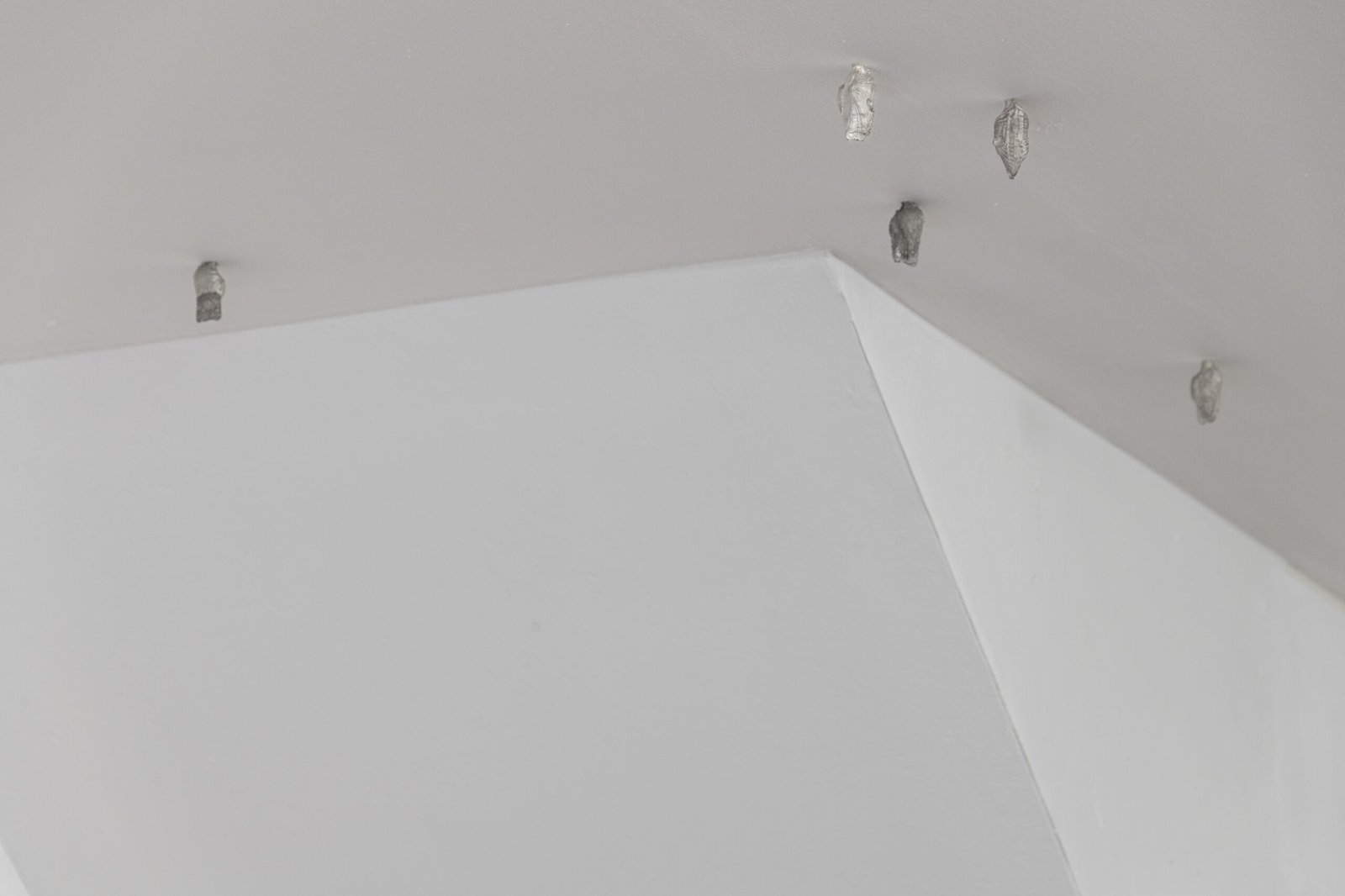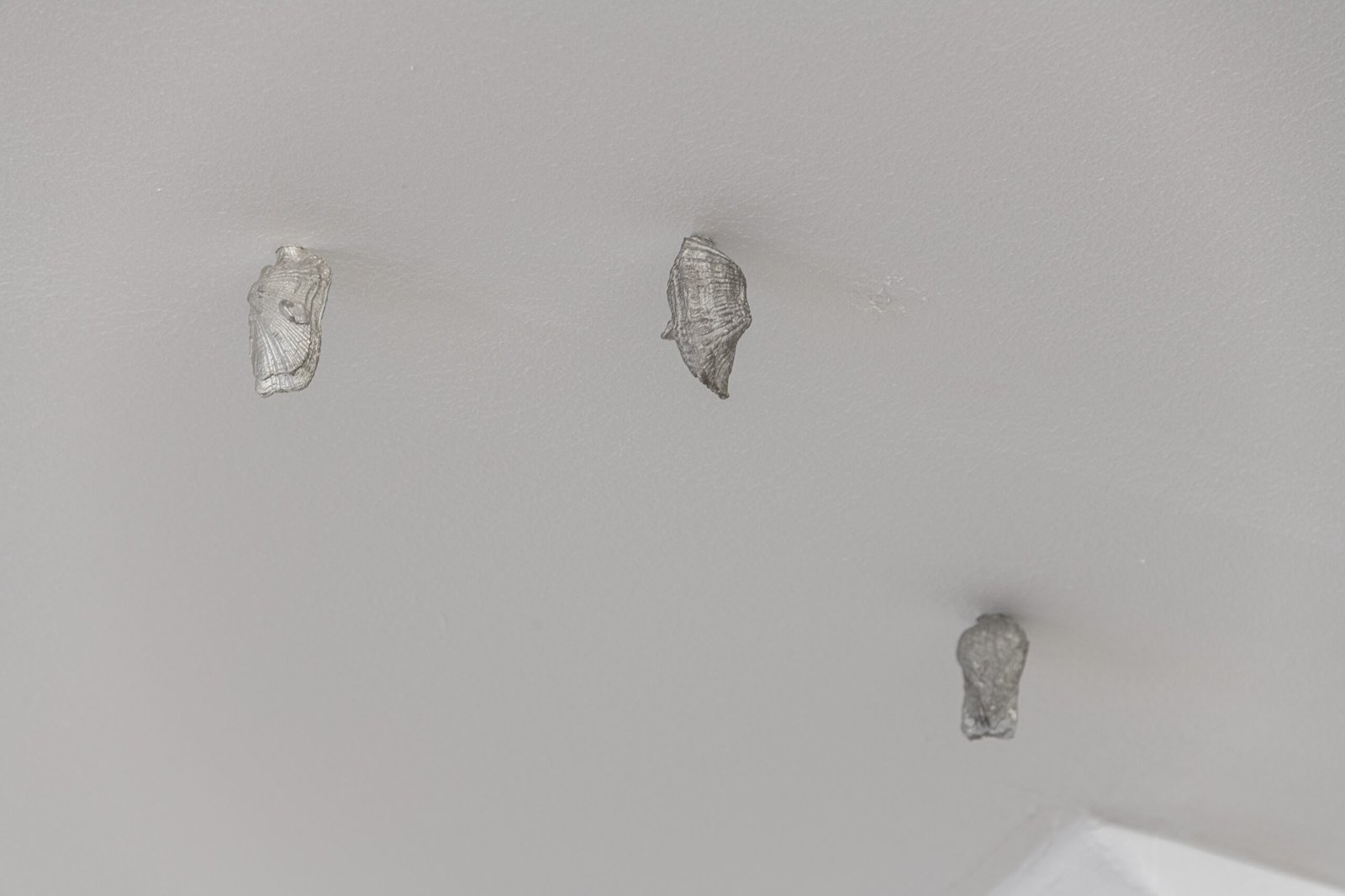 The three sculptures on the floor complicate the field further. They are not monumental, yet they exert a dense gravitational presence – objects that seem caught mid-transition, as if arrested between one state of being and another. Metal, clay, composite structures: all of them feel slightly unanchored, as though still testing the rules of their own formation.