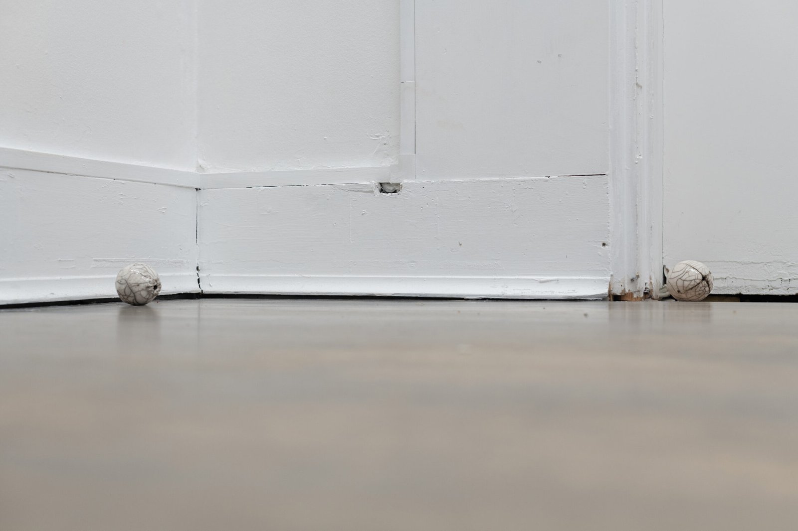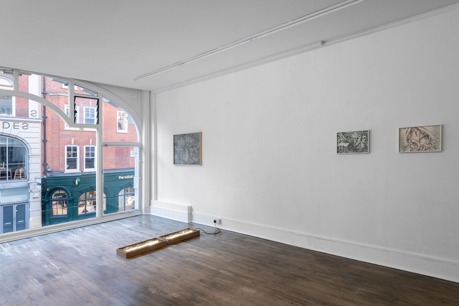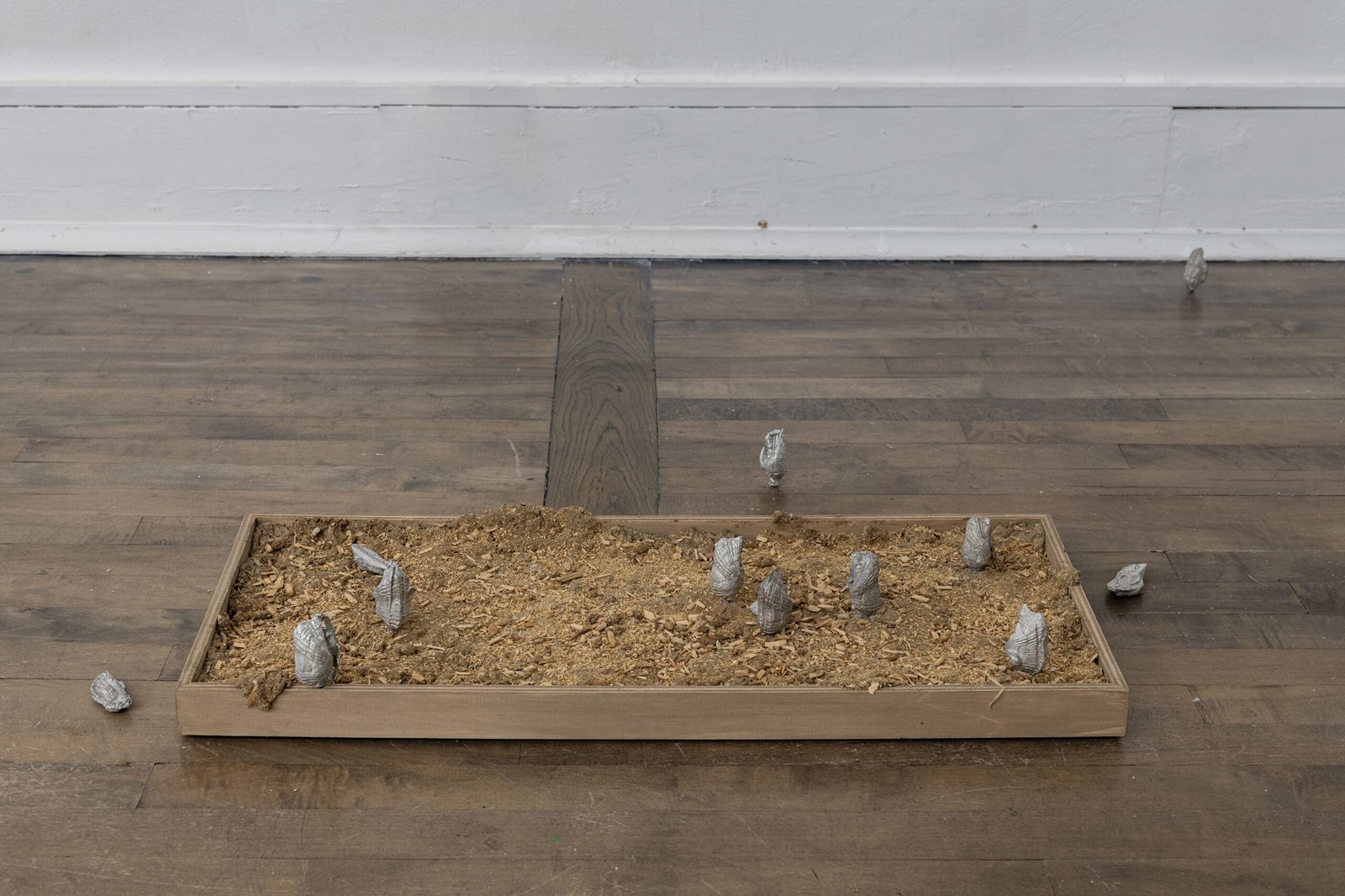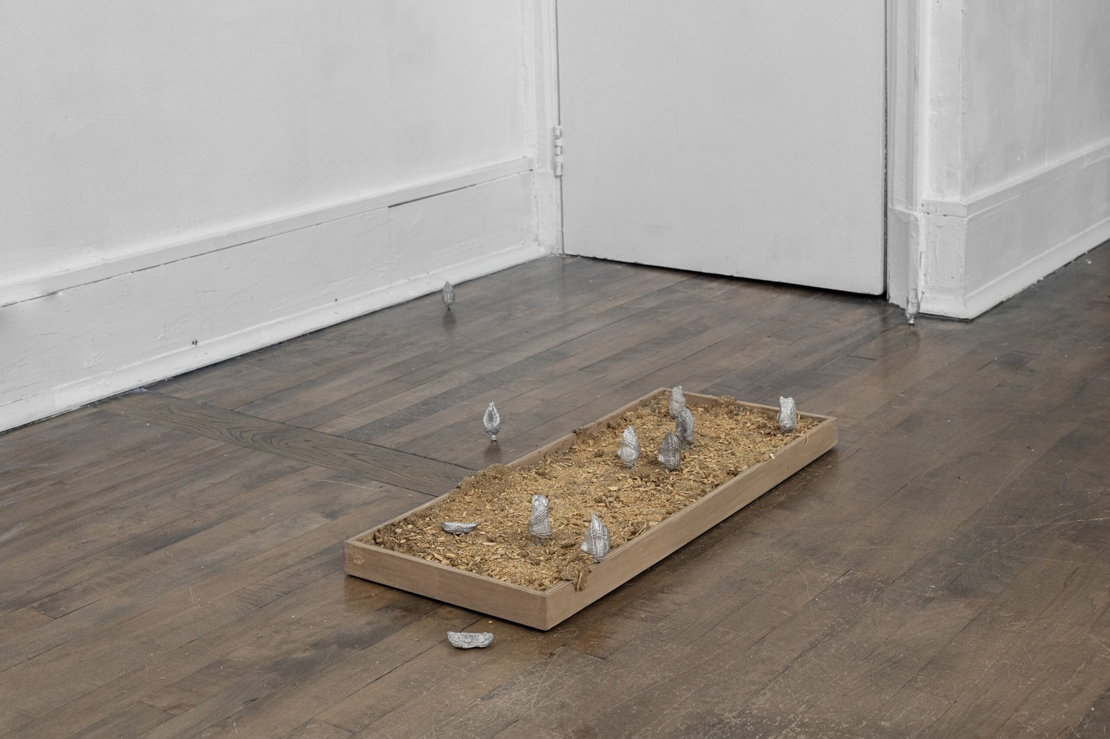 The three sculptures on the floor complicate the field further. They are not monumental, yet they exert a dense gravitational presence – objects that seem caught mid-transition, as if arrested between one state of being and another. Metal, clay, composite structures: all of them feel slightly unanchored, as though still testing the rules of their own formation.