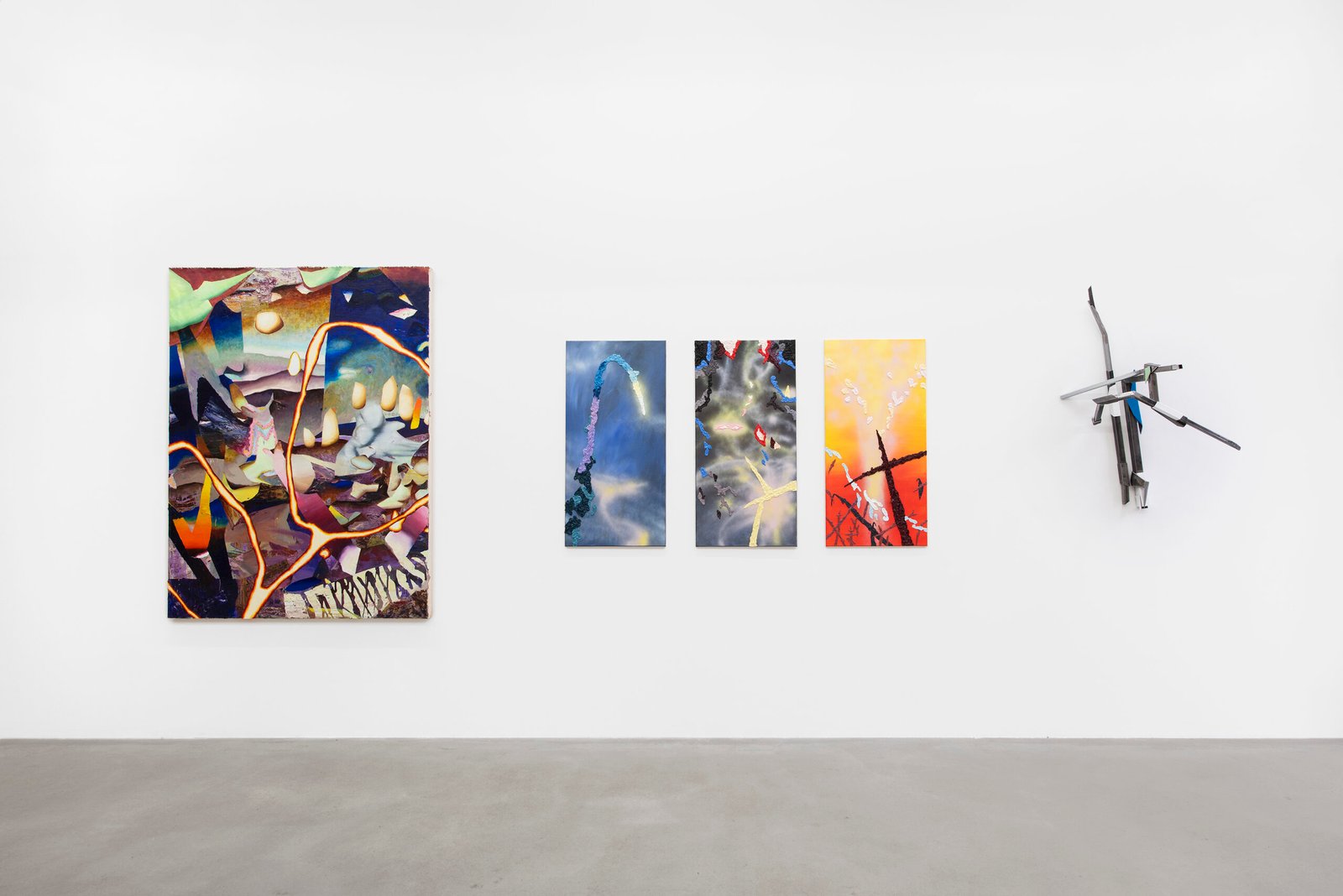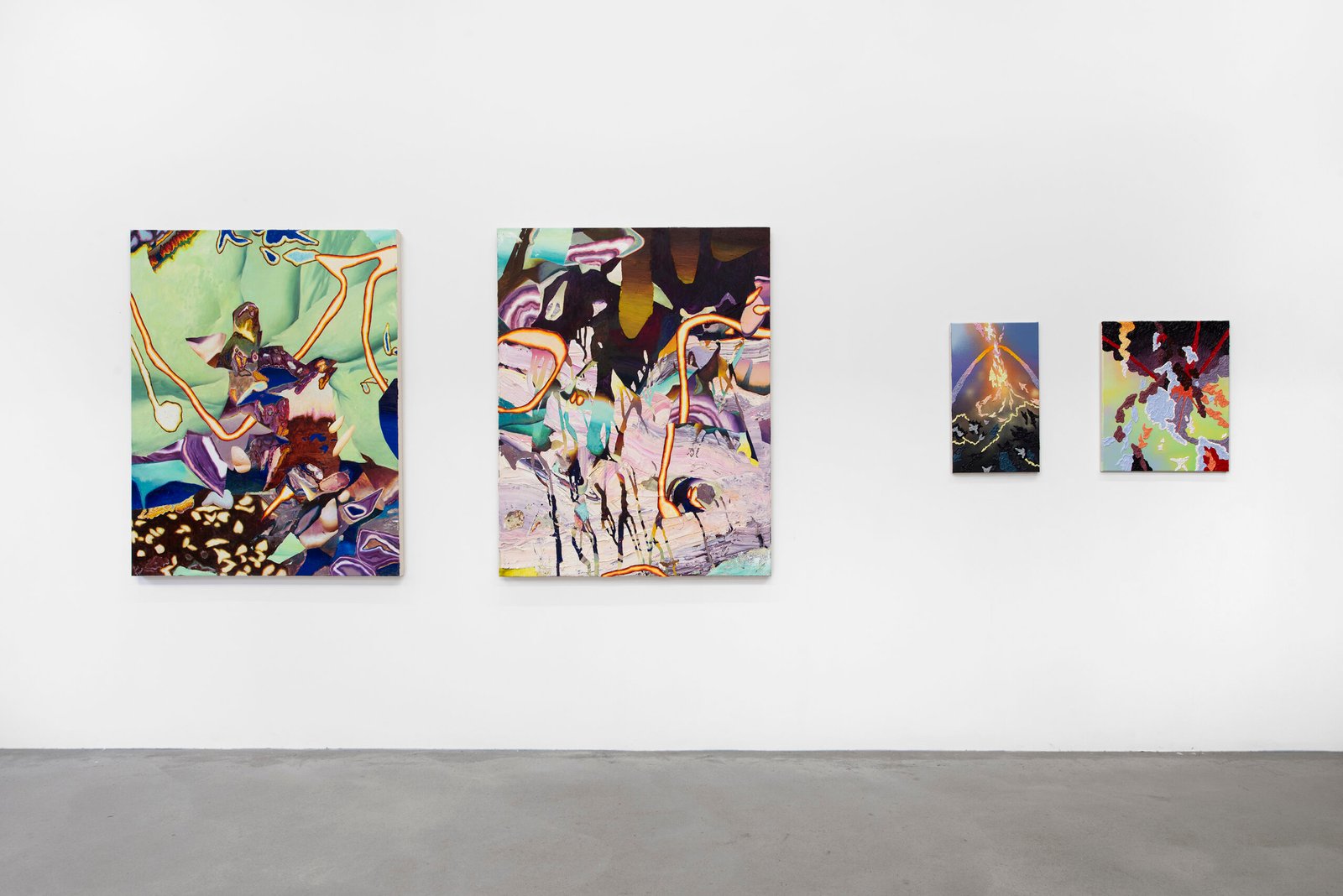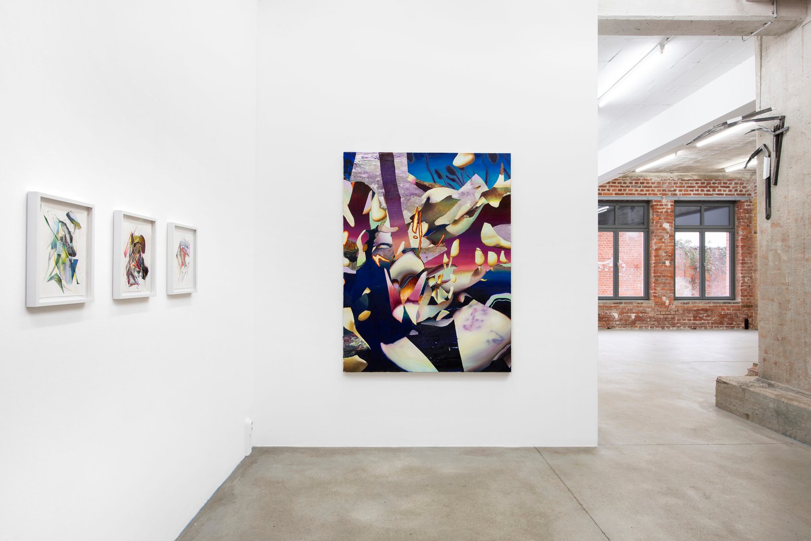The investigation of canonized pictorial structures and motifs takes place in their inner logic, whereby these are broken up and alienated in a process-oriented approach. Through the use of spray paints, spatula techniques, latex Through the use of spray paints, palette knife techniques, latex masking, and glued-on pieces of canvas, a biomorphic, multi-layered formal vocabulary emerges that eludes unambiguous interpretations and remains deliberately fragmented. In this context, perception manifests itself as an unstable process that oscillates between historical reference and contemporary image production.