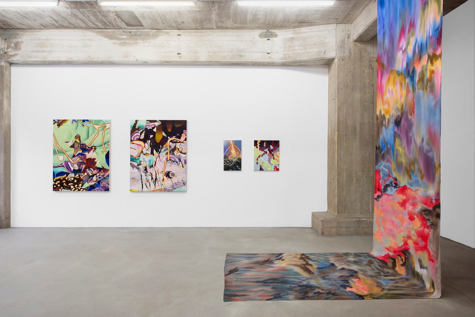 She has also realized numerous art-in-architecture projects. Justyna Jenetzek lives and works in Düsseldorf. In addition, she realizes numerous art-in-architecture projects. Maria Bayer’s expansive textile works and paintings dominate the exhibition with their striking physical and atmospheric presence. The fabrics overlap and condense into complex, landscape-like structures,
