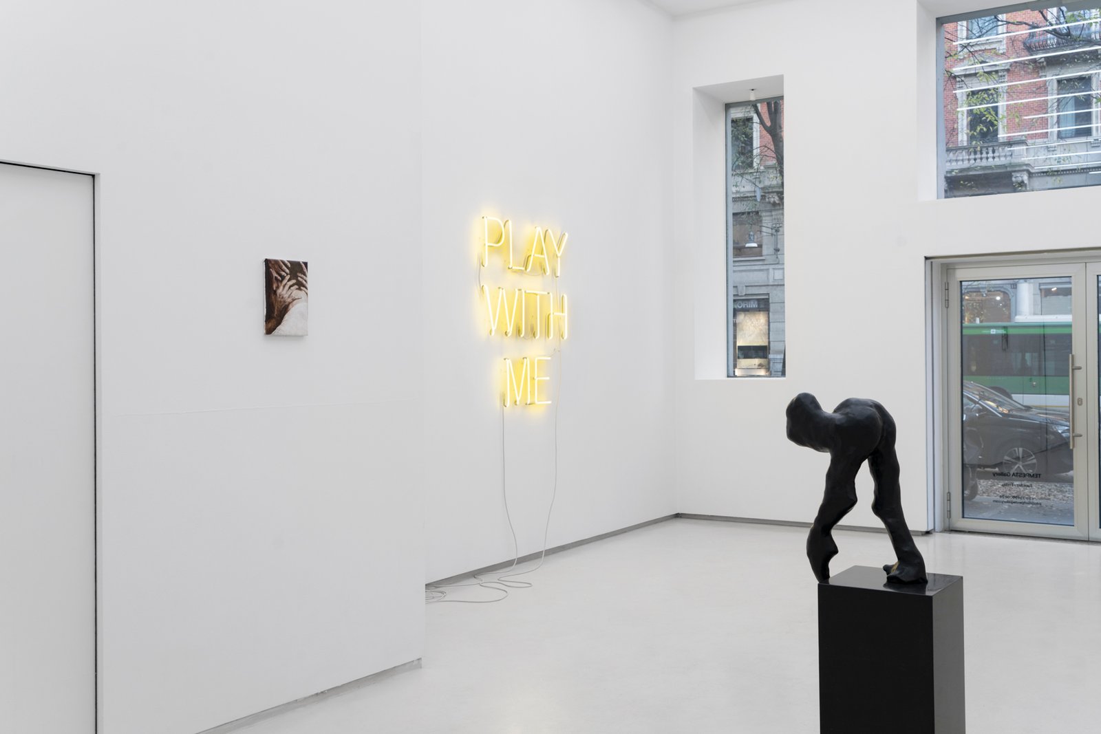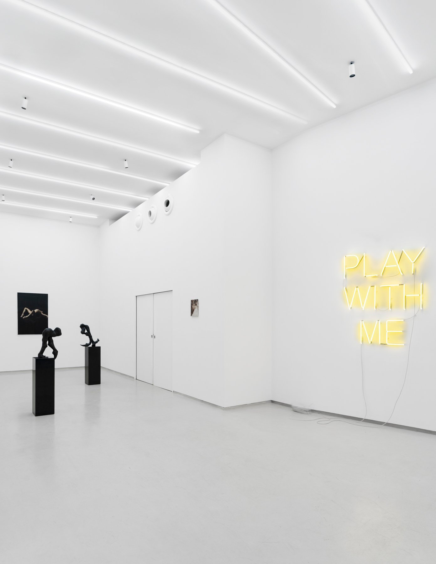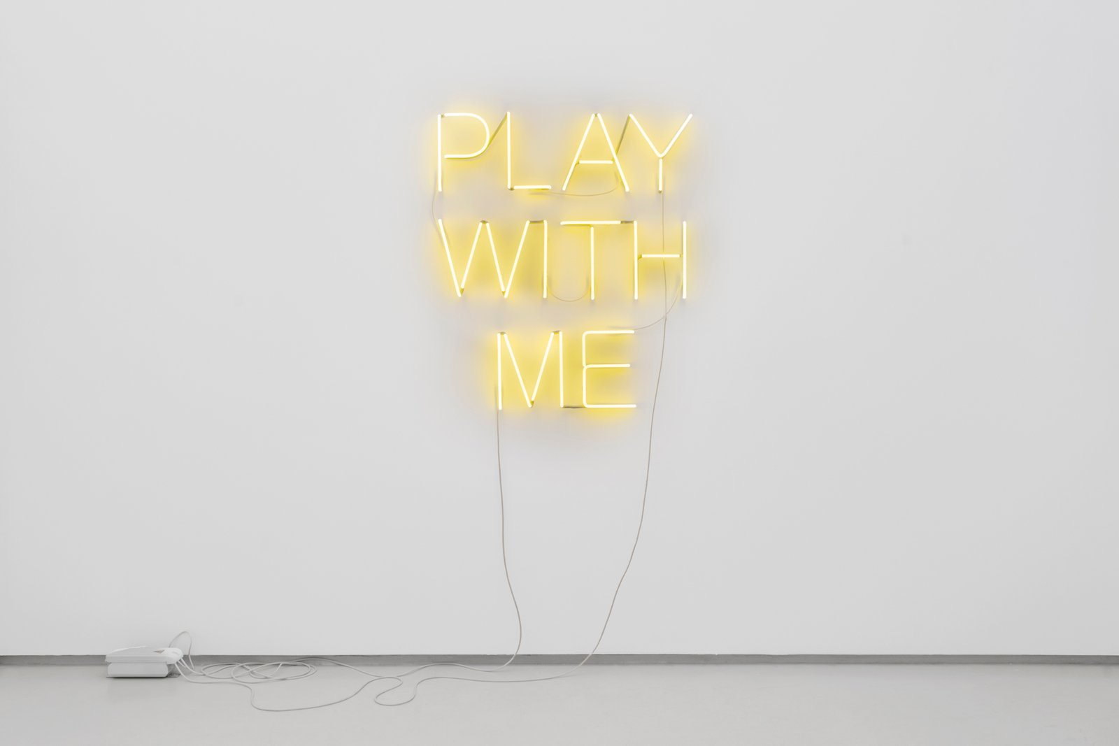 Meanwhile, the neon piece PLAY WITH ME — a pop quotation and distinctly perverse mantra — exposes the ambiguity of a mediated eroticism that confuses seduction and submission, power and vulnerability.