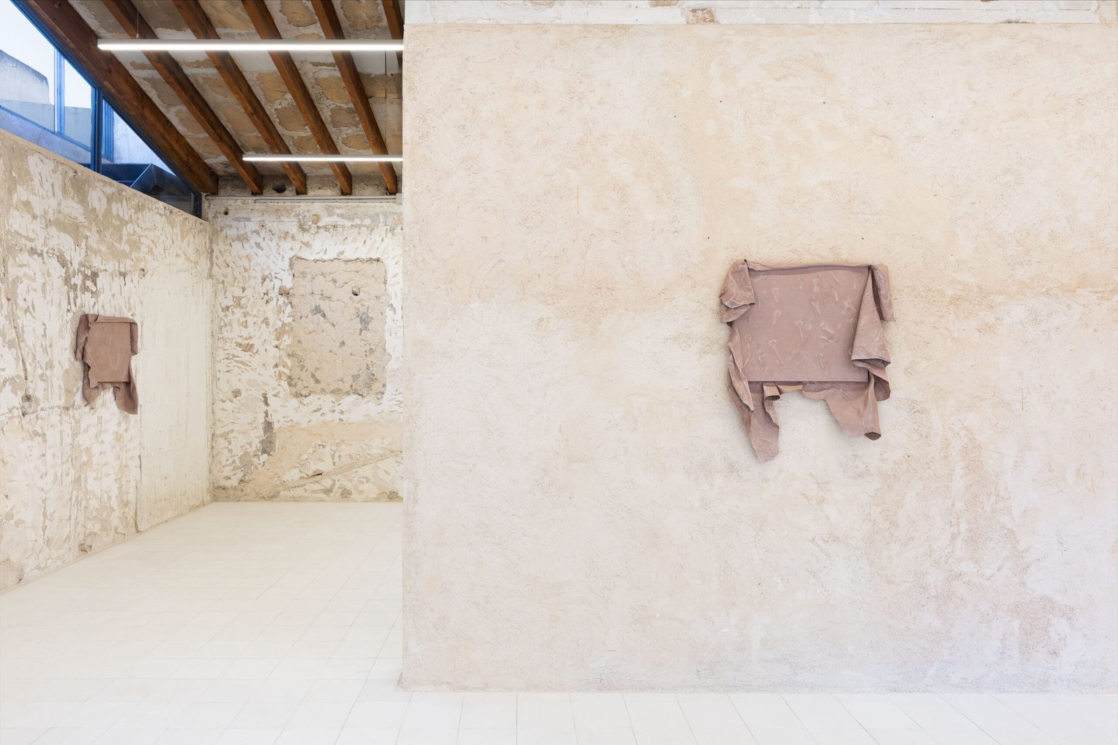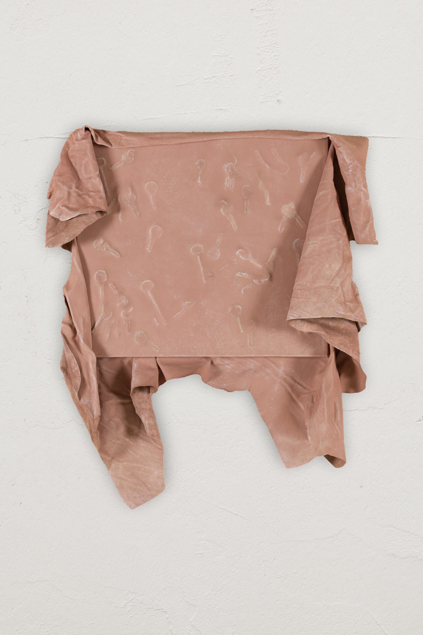 Faces can be understood not as literal portraits, but as ways of invoking people through relationships and absence. Through these figures, home is found in relation to another person rather than in its architectural form. Father’s Room frames home as a bond grounded in proximity and lived relation. The vacuum-formed leather reliefs approach this differently: functioning as skins, they register contact with hands, wrists and everyday personal objects, while pointing to the body through its absence. Body and house are treated alike, both understood as envelopes that hold trace and define a threshold between inside and outside.
