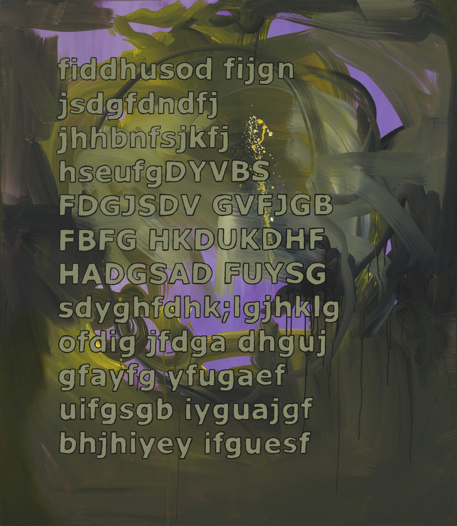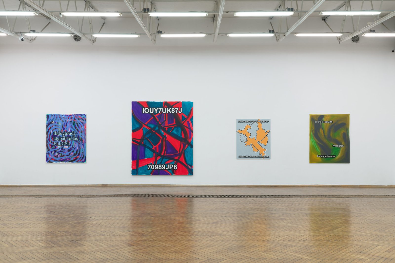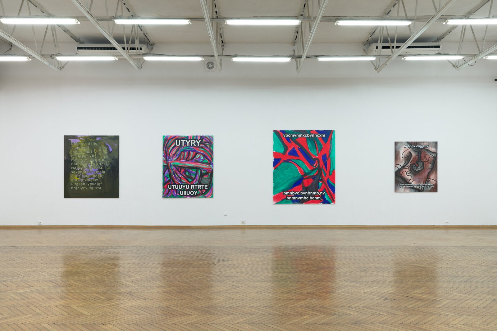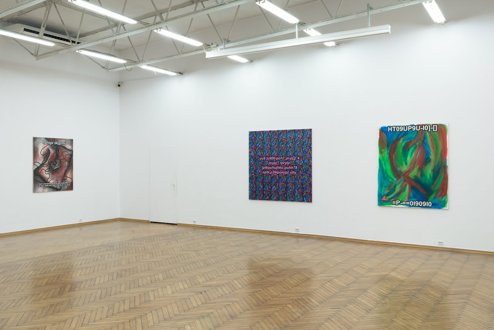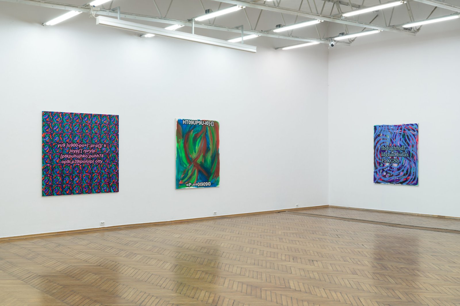 The exhibition presents the latest paintings by Tymek Borowski, from 2023–2025. Their principale theme is scattered inscriptions, words, sentences, and also longer passages of incomprehensible text resulting from the rapid, mindless typing of a sequence of arbitrary characters on the keyboard. They may call to mind automatically generated passwords, randomly invented file names, or encrypted data. They may also visualize the rush of thoughts that happen when we can’t express ourselves clearly.