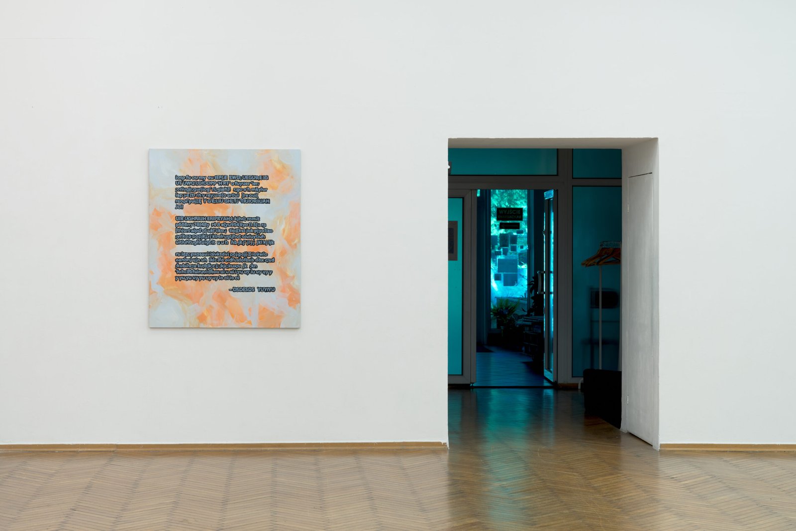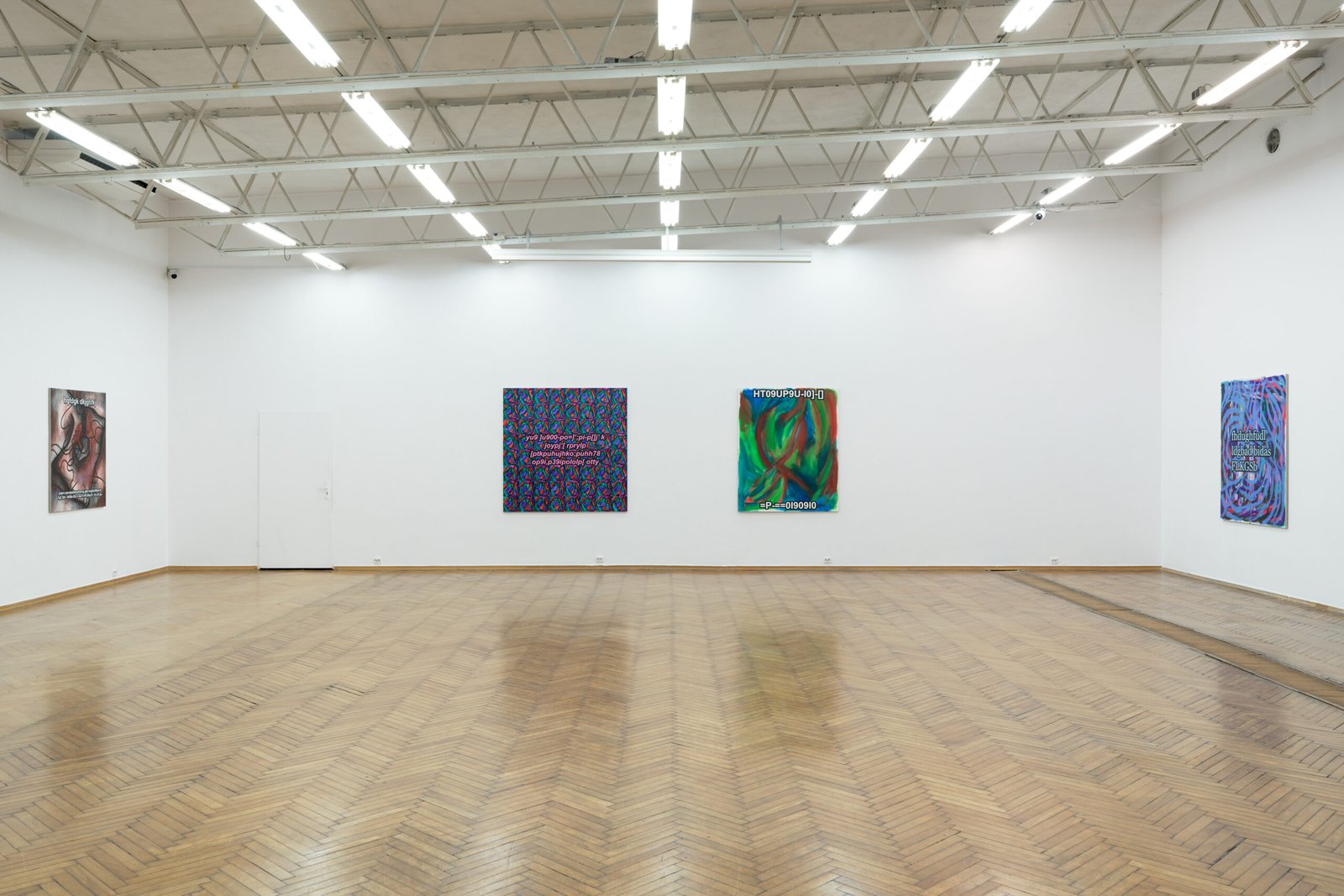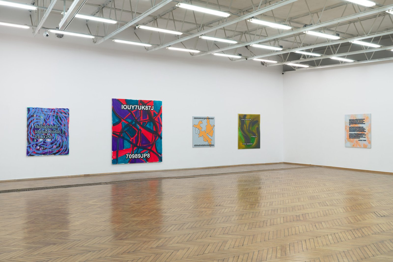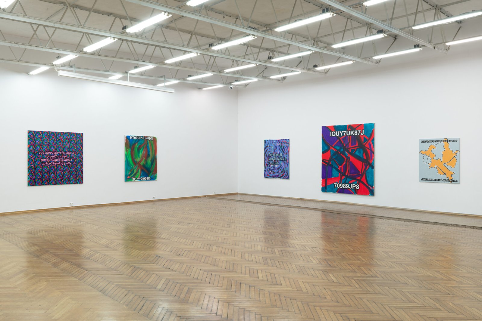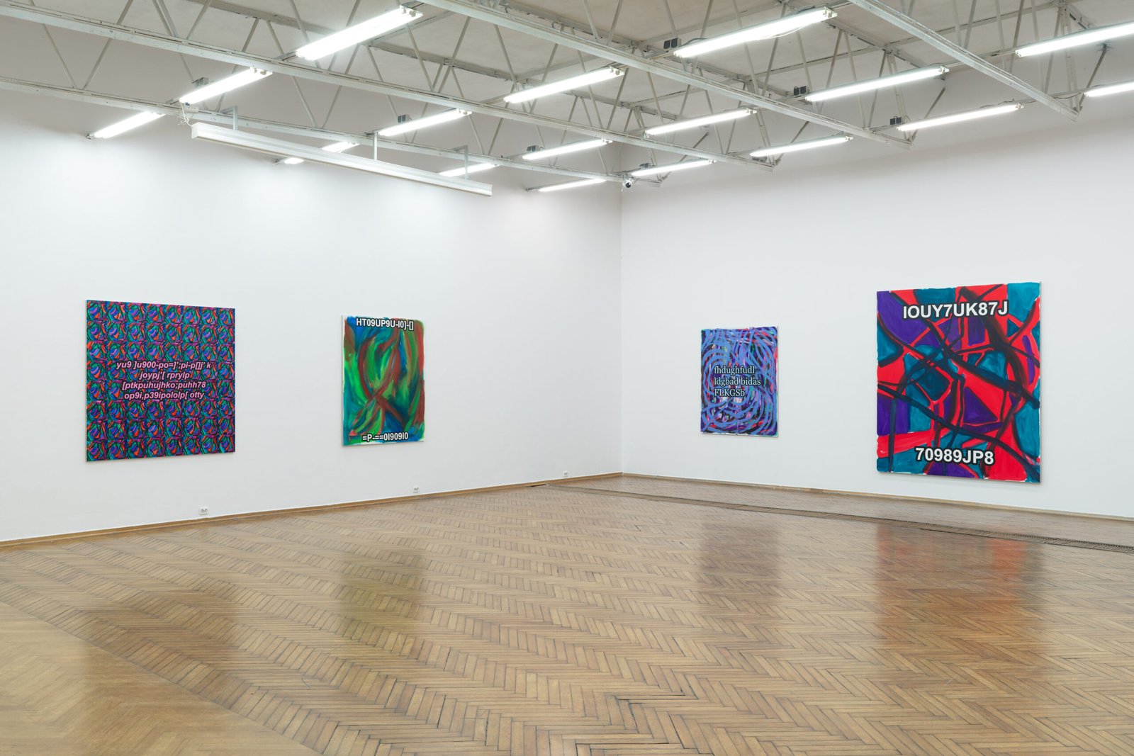 The exhibition presents the latest paintings by Tymek Borowski, from 2023–2025. Their principale theme is scattered inscriptions, words, sentences, and also longer passages of incomprehensible text resulting from the rapid, mindless typing of a sequence of arbitrary characters on the keyboard. They may call to mind automatically generated passwords, randomly invented file names, or encrypted data. They may also visualize the rush of thoughts that happen when we can’t express ourselves clearly.