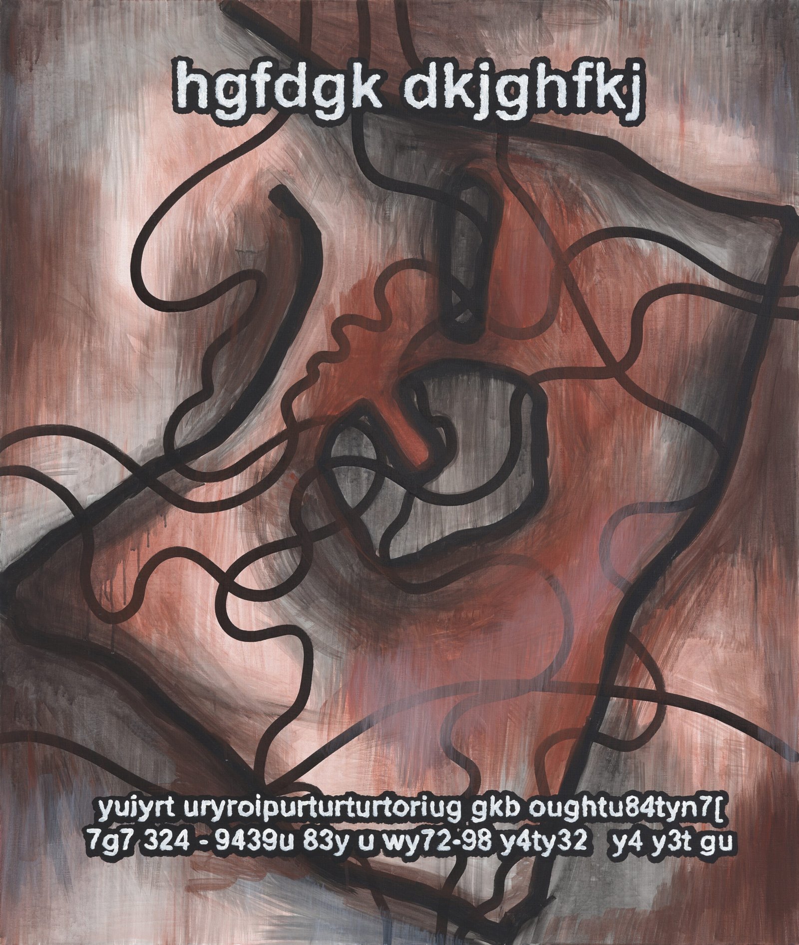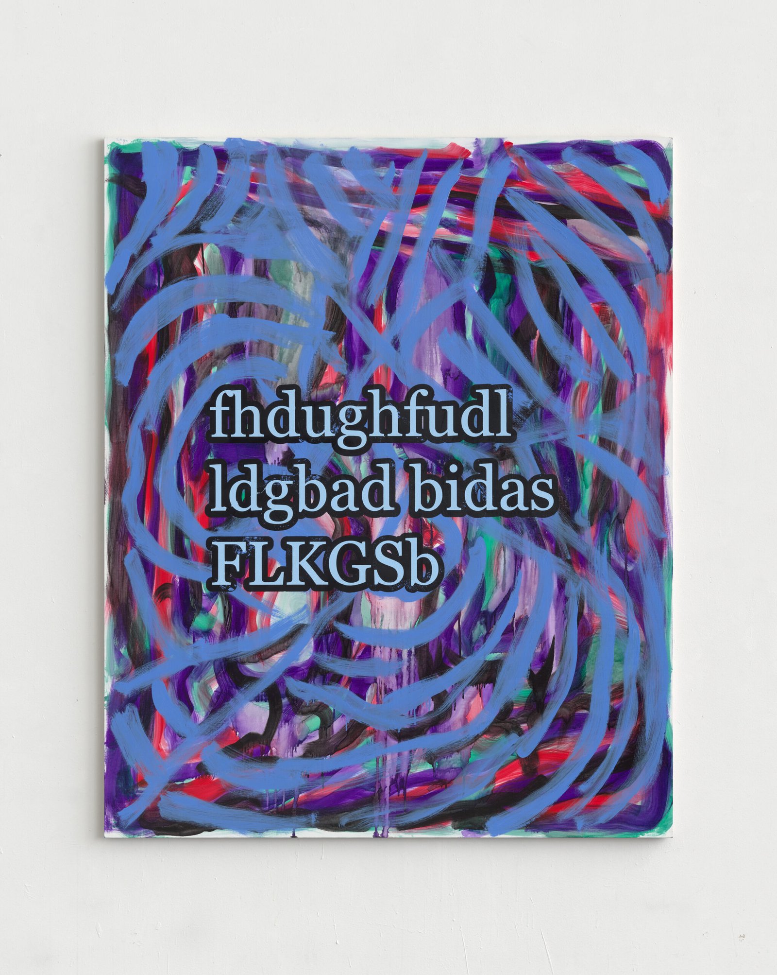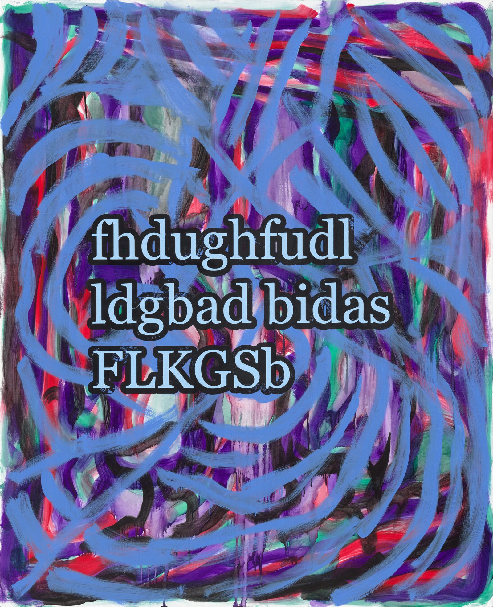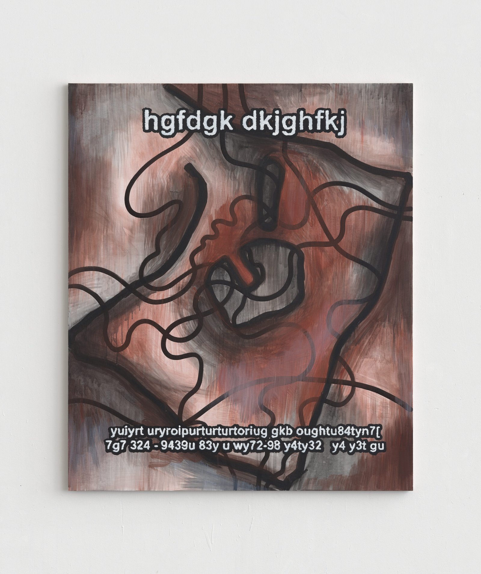 The exhibition presents the latest paintings by Tymek Borowski, from 2023–2025. Their principale theme is scattered inscriptions, words, sentences, and also longer passages of incomprehensible text resulting from the rapid, mindless typing of a sequence of arbitrary characters on the keyboard. They may call to mind automatically generated passwords, randomly invented file names, or encrypted data. They may also visualize the rush of thoughts that happen when we can’t express ourselves clearly.