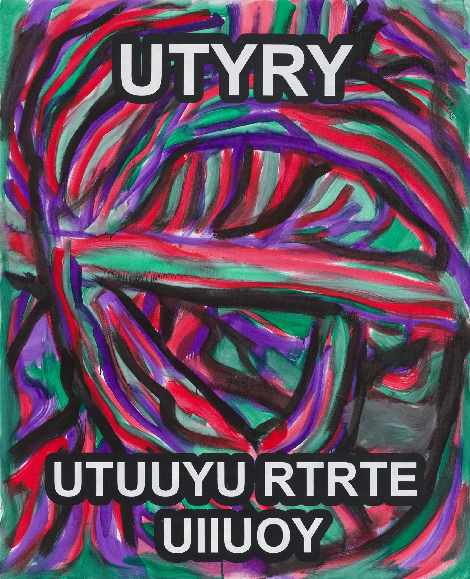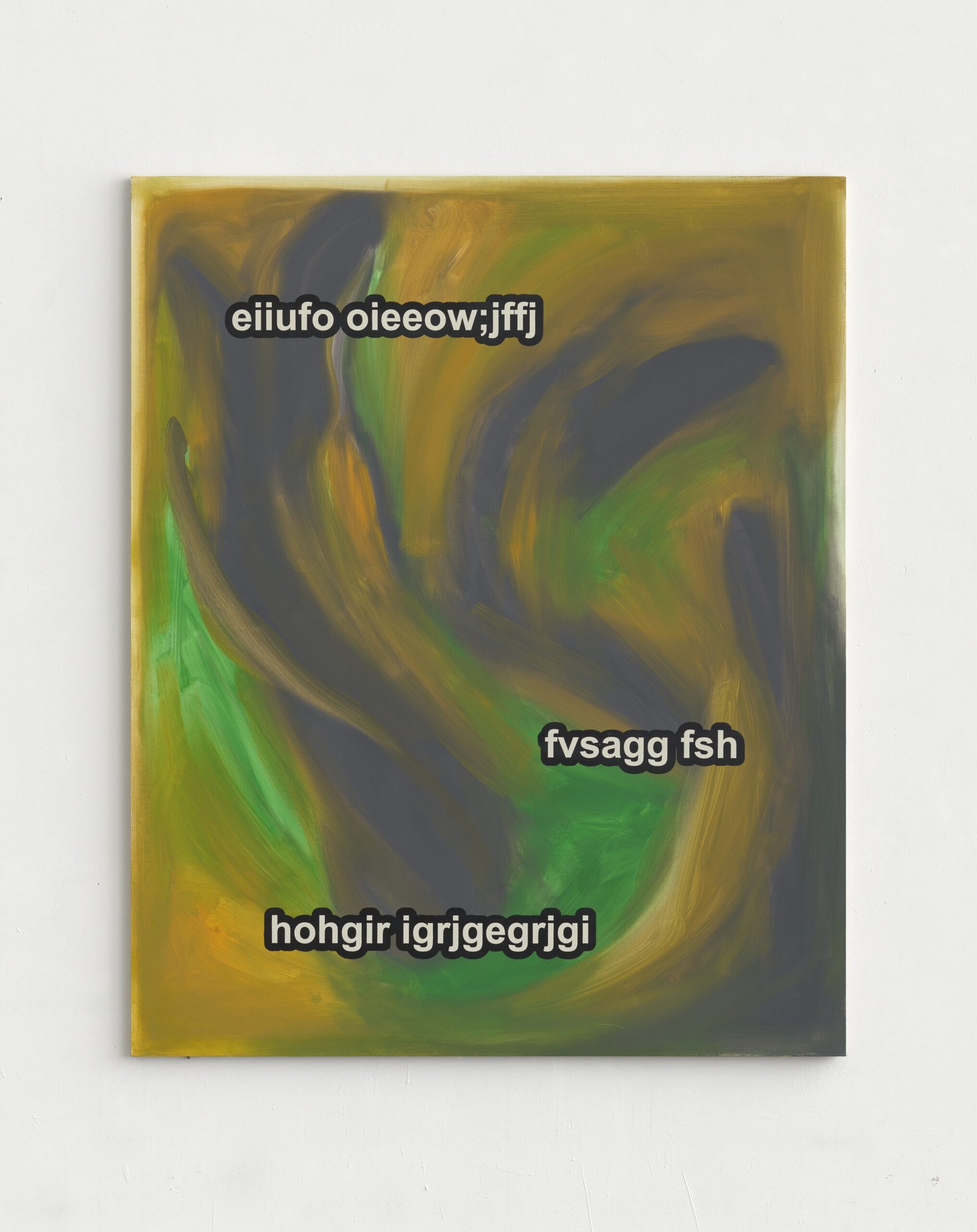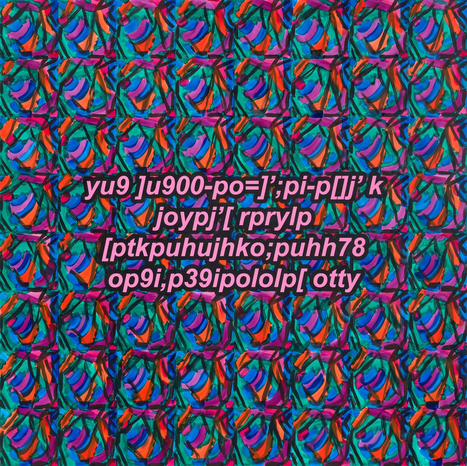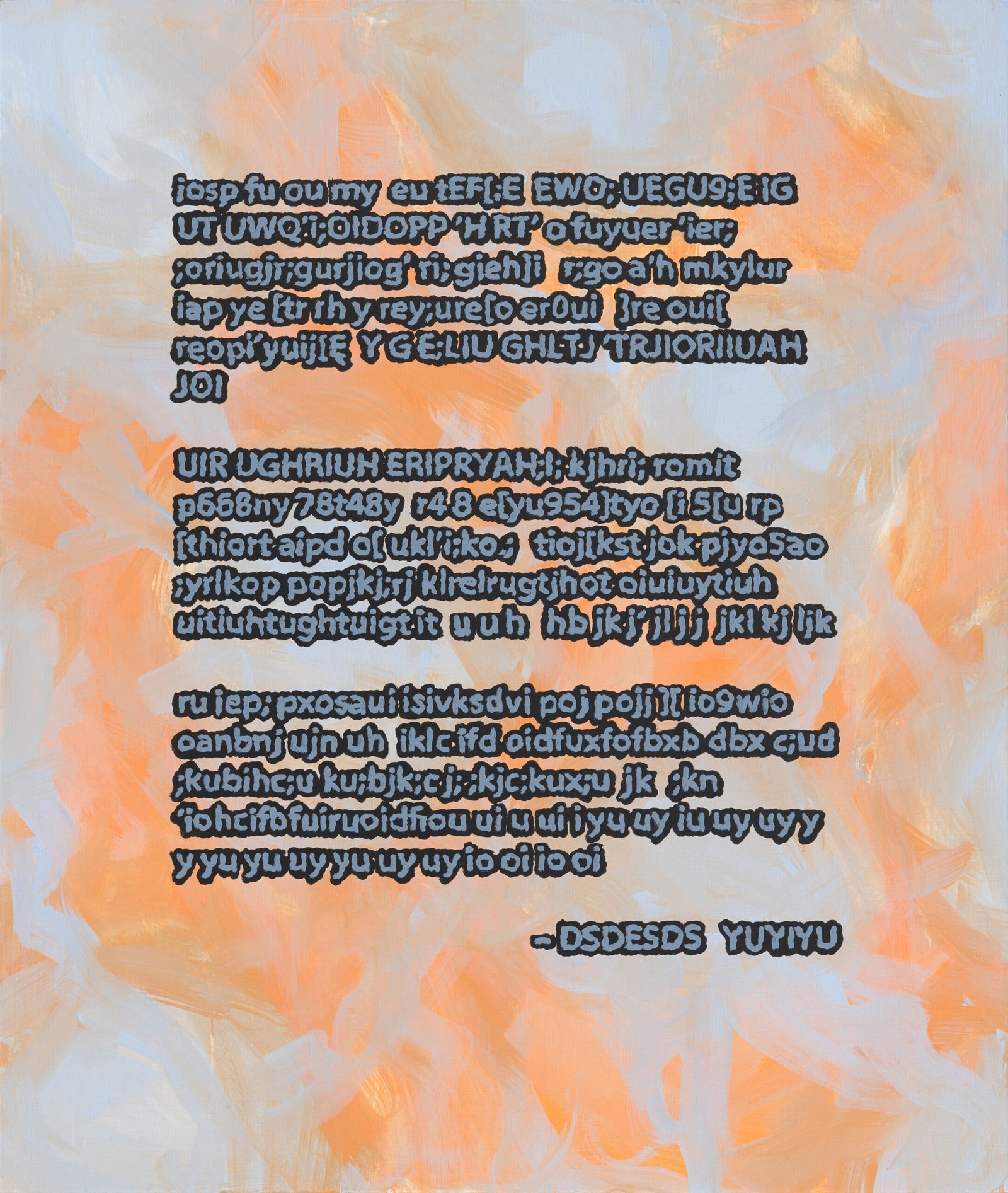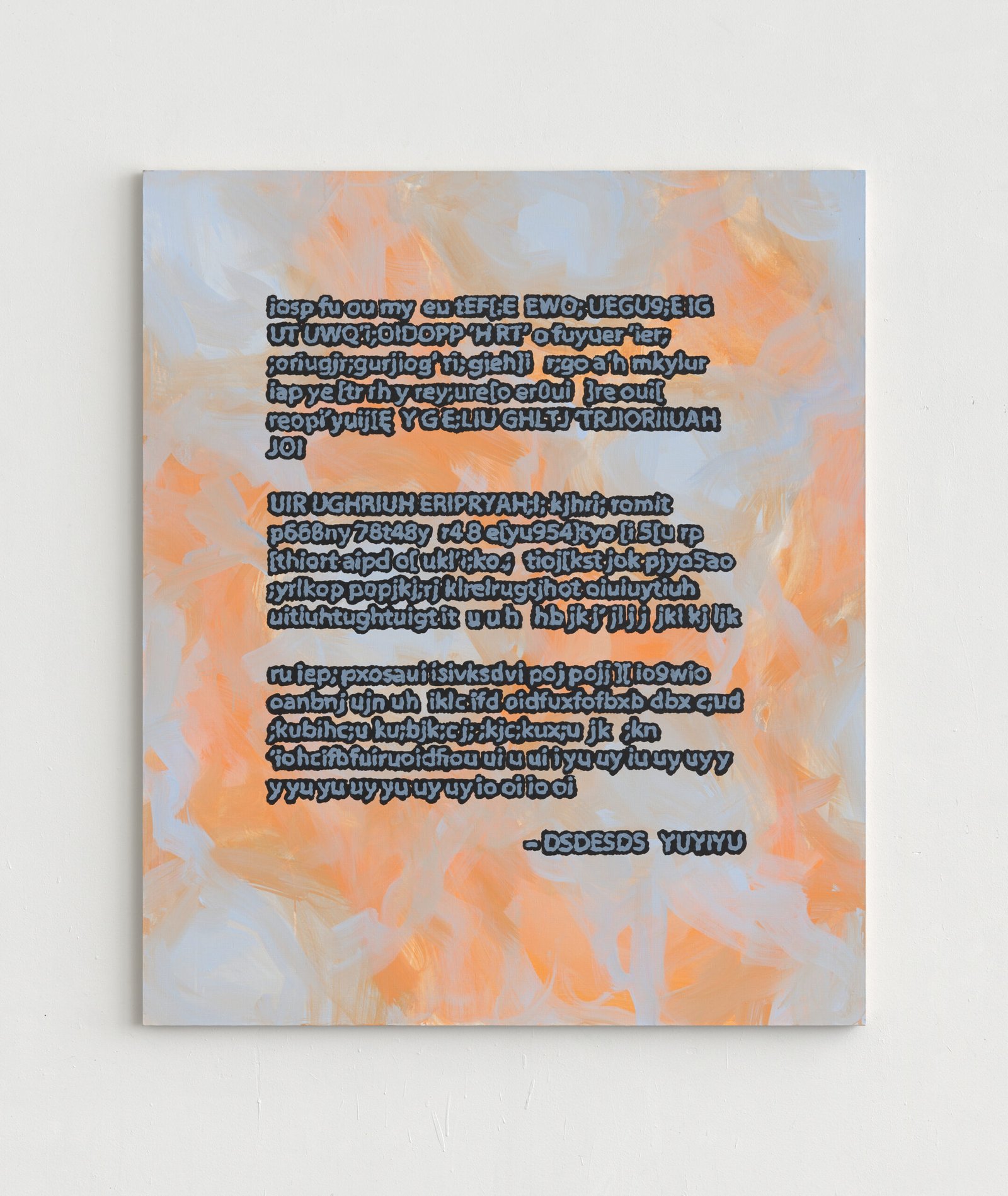 The exhibition presents the latest paintings by Tymek Borowski, from 2023–2025. Their principale theme is scattered inscriptions, words, sentences, and also longer passages of incomprehensible text resulting from the rapid, mindless typing of a sequence of arbitrary characters on the keyboard. They may call to mind automatically generated passwords, randomly invented file names, or encrypted data. They may also visualize the rush of thoughts that happen when we can’t express ourselves clearly.