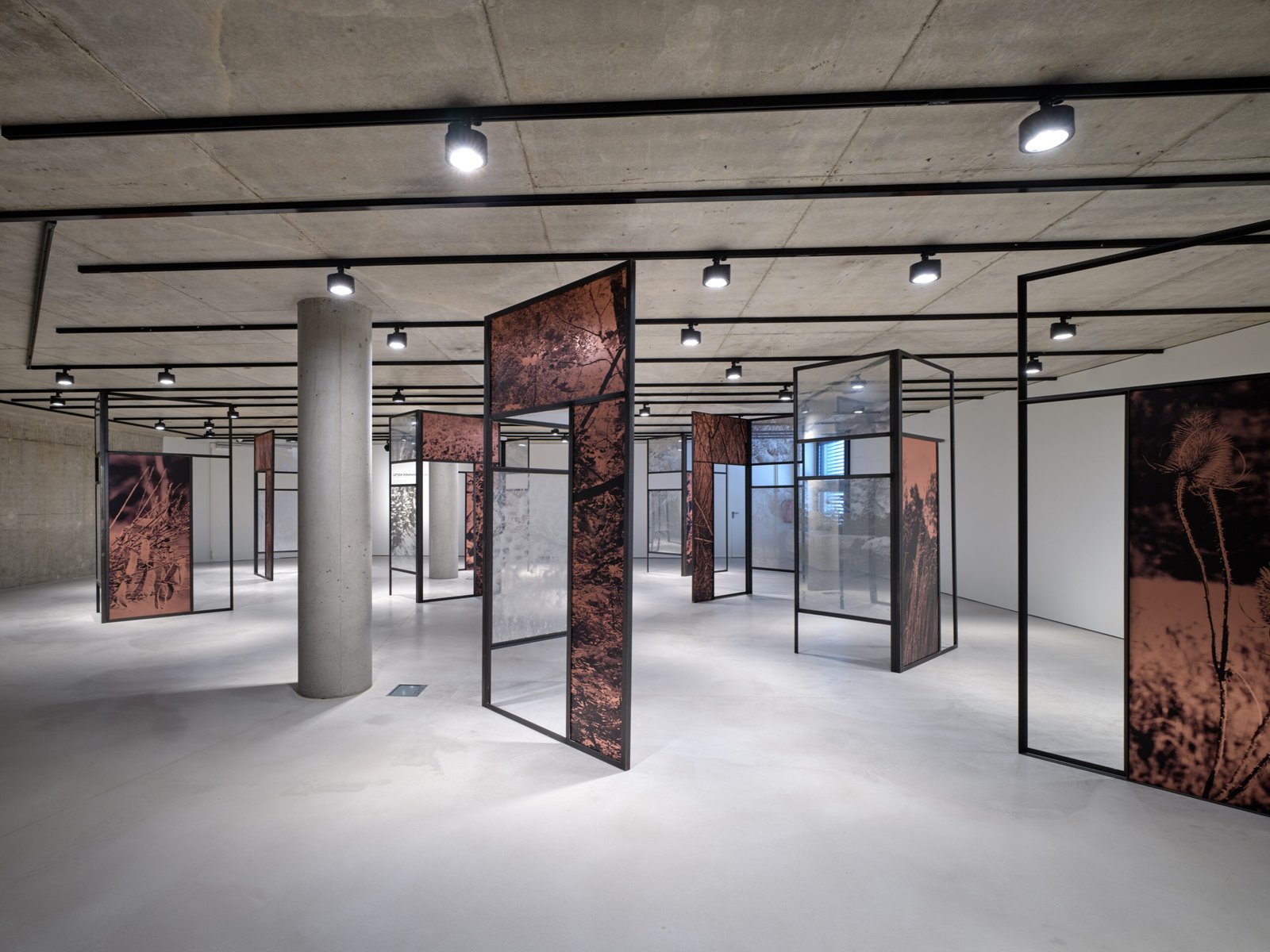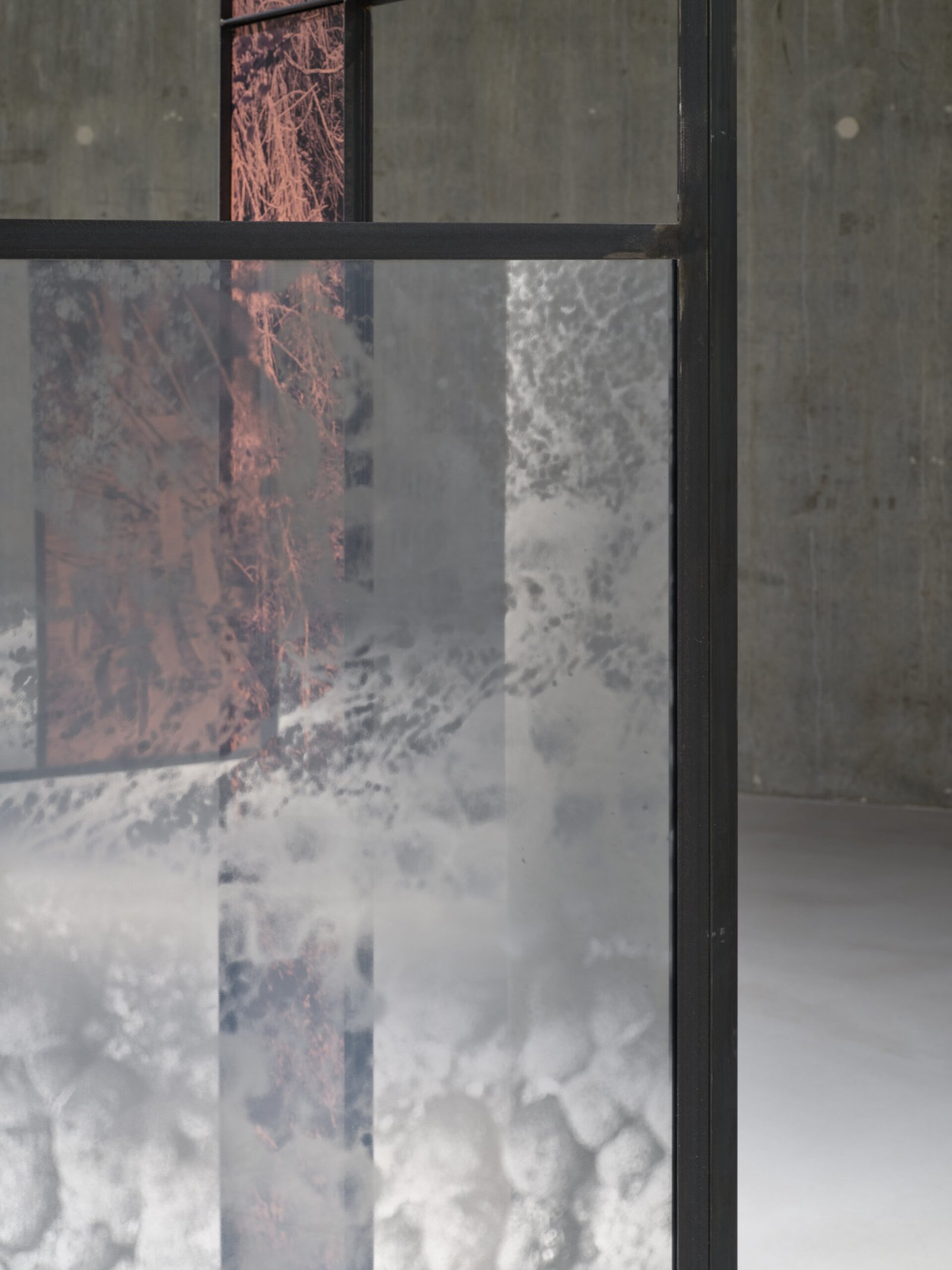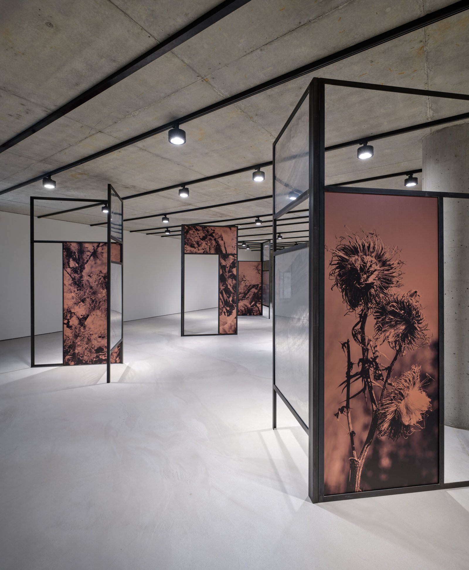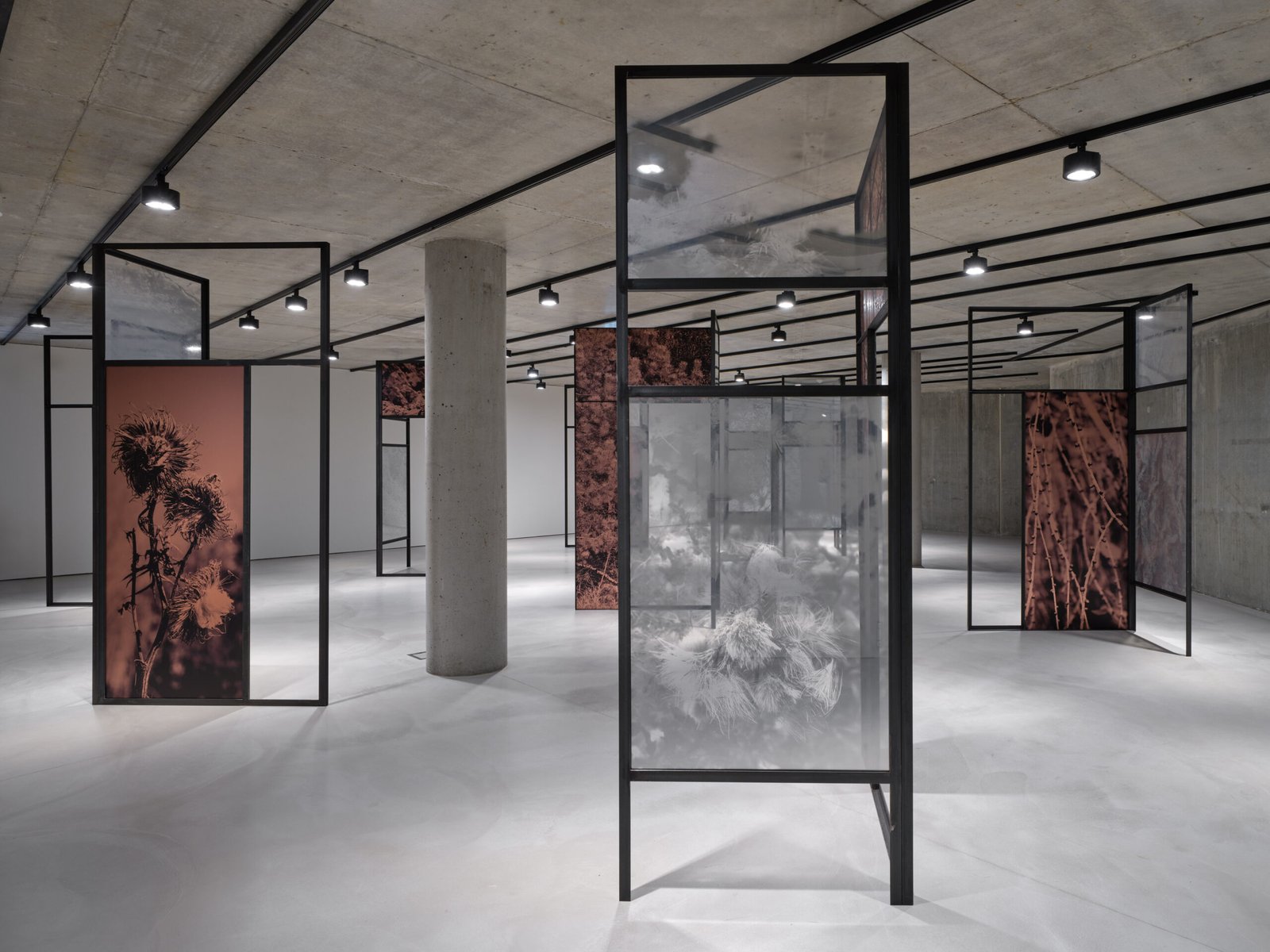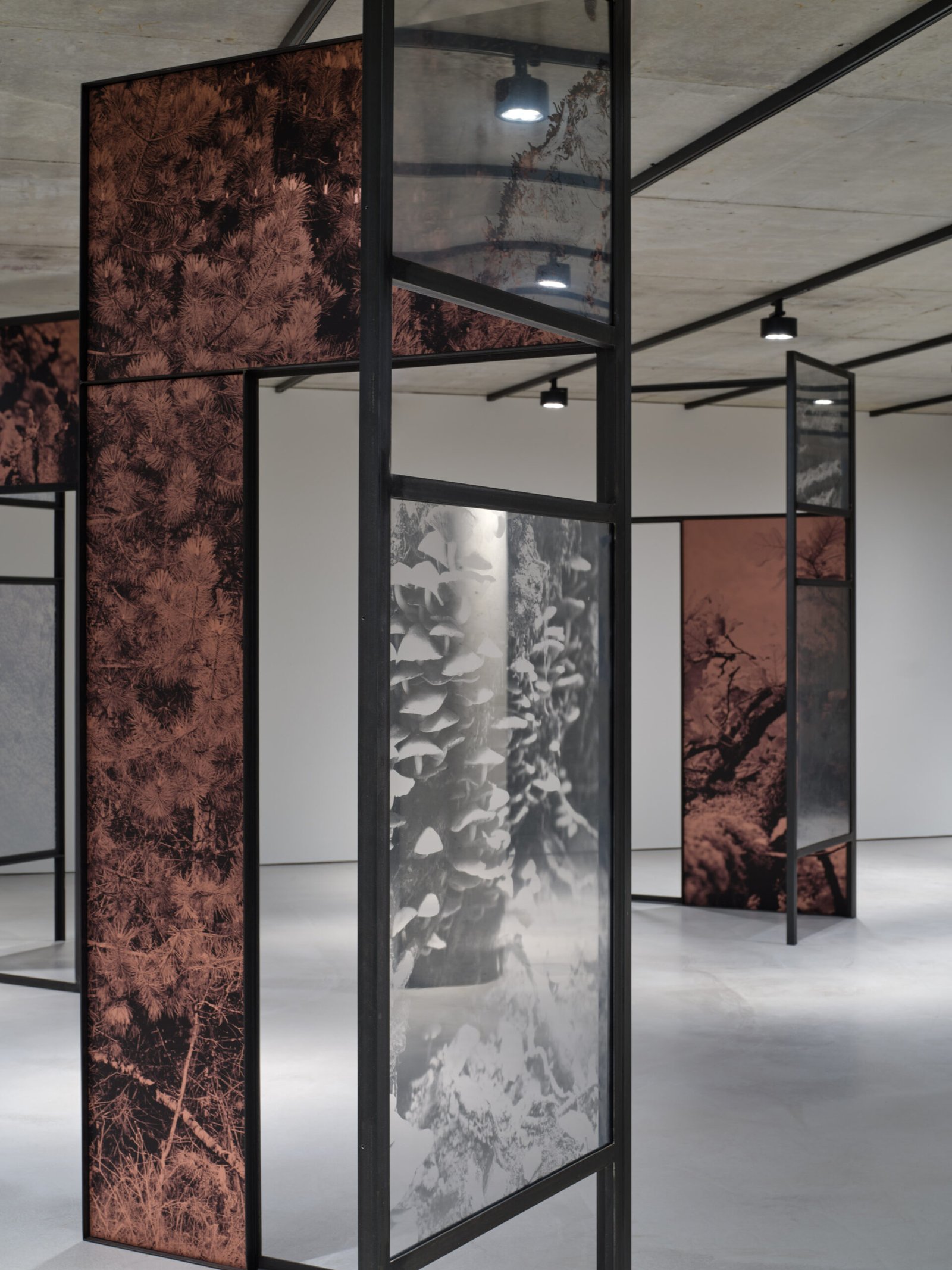 A l’instar d’une forme d’étude sur le bassin minier du sud du Luxembourg, Letizia Romanini fonde ses inspirations pour ce Project Room sur les spécificités géologiques et sur les espèces endémiques de la région. Il s’agit d’imbriquer l’évocation du passé liée à la sidérurgie et l’écoulement du temps rendant visible la vigueur écologique et de la résilience de la nature. Il est question de créer un répertoire, un état des lieux, de saisir à travers la photographie des plantes adventices – plus communément appelées “mauvaises herbes” – pour faire apparaître la fragilité de tout un écosystème. Composée de neuf grandes structures associées à des surfaces translucides accueillant des images de végétations, d’arbres et de roches, Regno Amicale (2025) est une installation renversant les rapports d’échelle et de point de vue. Son agencement dans l’espace est propice à une déambulation lente, immersive, destinée à éveiller notre sensibilité à l’environnement, à la cohabitation inter-espèce et à nous questionner sur nos pratiques, notre engagement à son égard et notre propre existence.