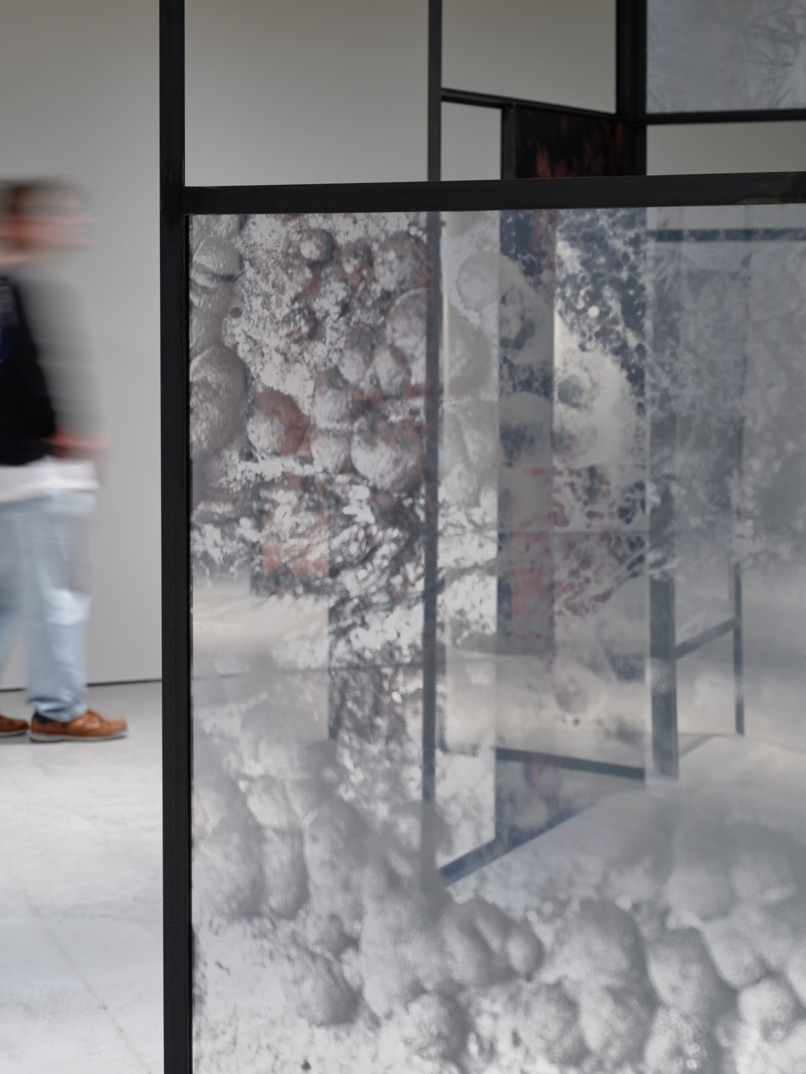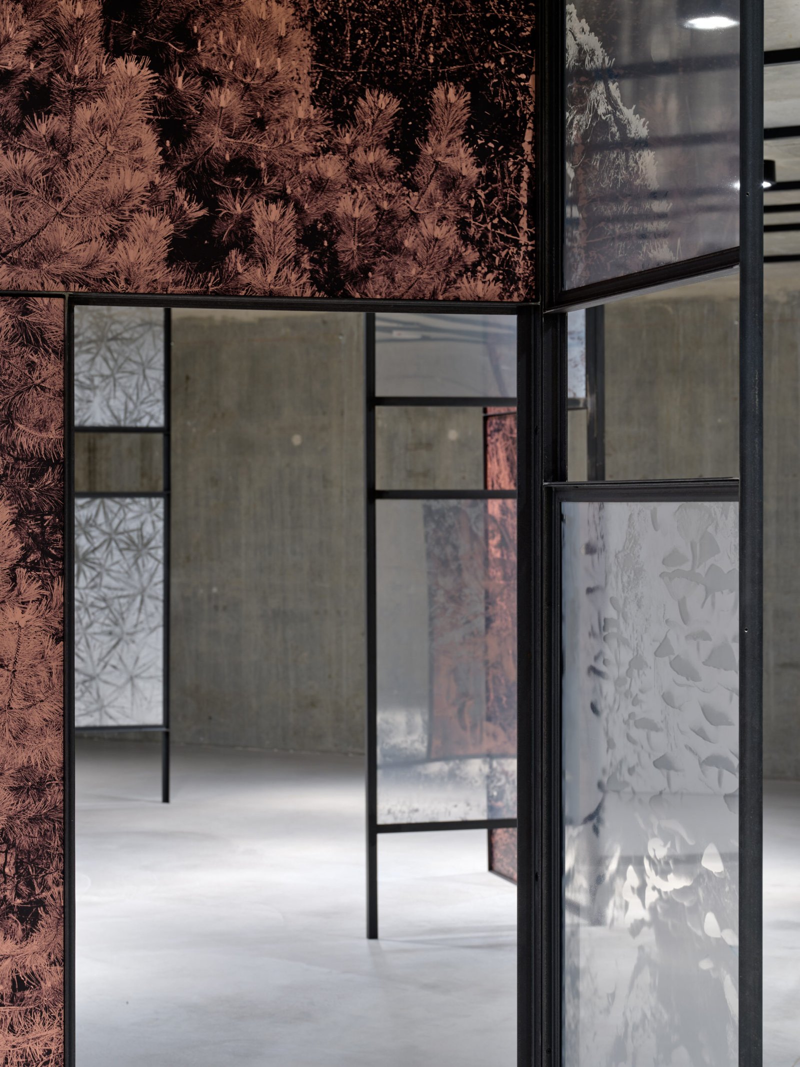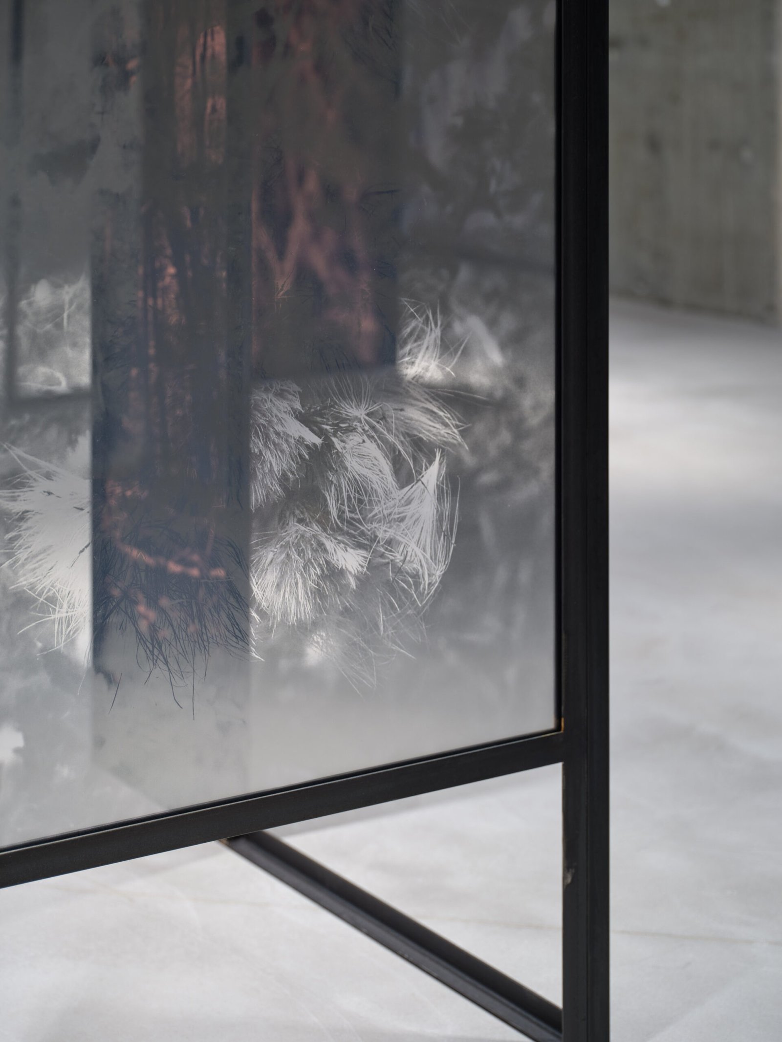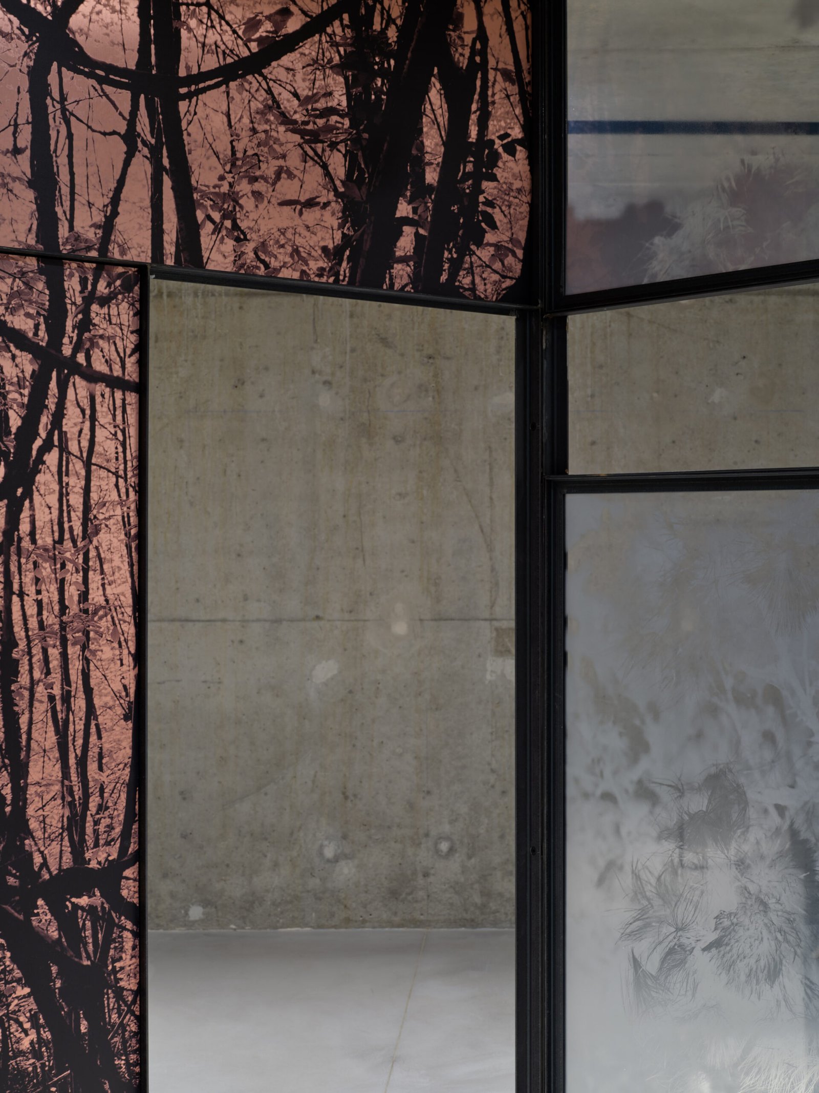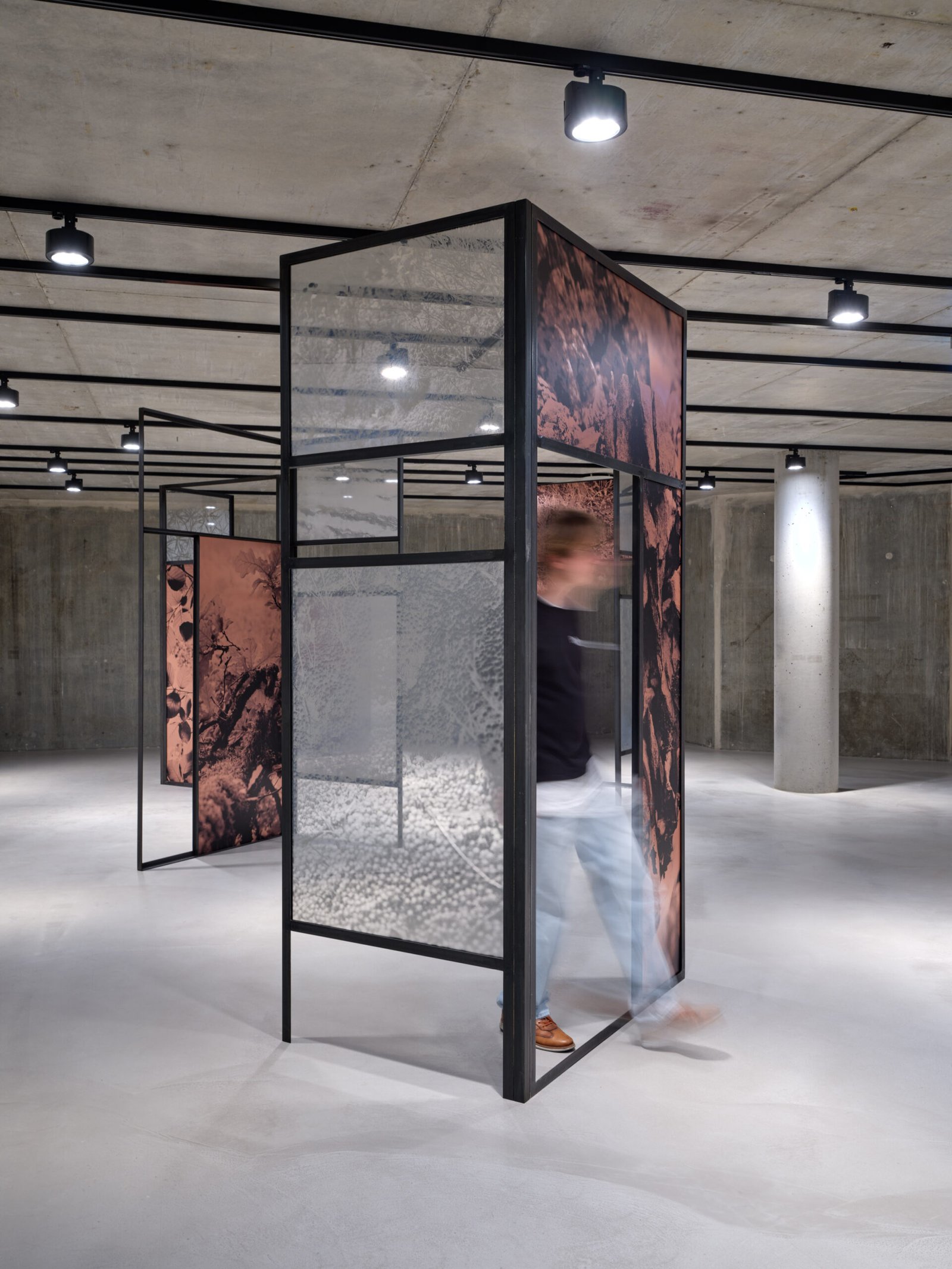 A l’instar d’une forme d’étude sur le bassin minier du sud du Luxembourg, Letizia Romanini fonde ses inspirations pour ce Project Room sur les spécificités géologiques et sur les espèces endémiques de la région. Il s’agit d’imbriquer l’évocation du passé liée à la sidérurgie et l’écoulement du temps rendant visible la vigueur écologique et de la résilience de la nature. Il est question de créer un répertoire, un état des lieux, de saisir à travers la photographie des plantes adventices – plus communément appelées “mauvaises herbes” – pour faire apparaître la fragilité de tout un écosystème. Composée de neuf grandes structures associées à des surfaces translucides accueillant des images de végétations, d’arbres et de roches, Regno Amicale (2025) est une installation renversant les rapports d’échelle et de point de vue. Son agencement dans l’espace est propice à une déambulation lente, immersive, destinée à éveiller notre sensibilité à l’environnement, à la cohabitation inter-espèce et à nous questionner sur nos pratiques, notre engagement à son égard et notre propre existence.