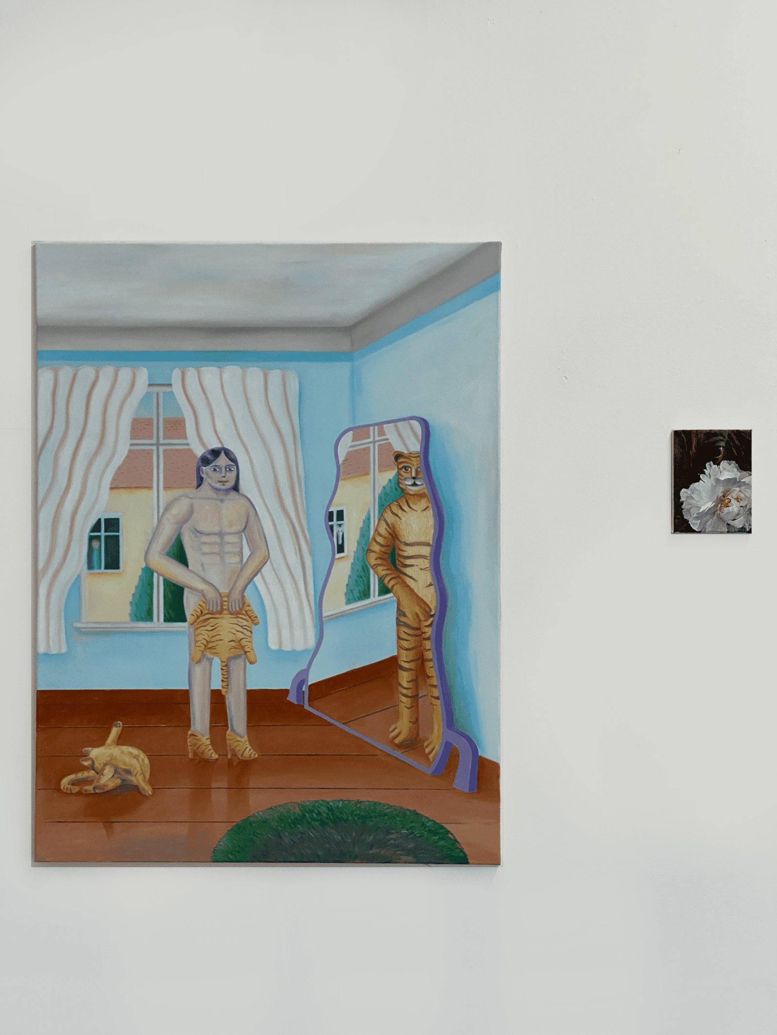 Leonie Gemsjäger situates her works in a threshold space between reality and memory, between the visible and the invisible, between life and absence. Her paintings resist clear classification and open an emotional space in which the uncanny unfolds as atmosphere. Where what has been repressed rises to the surface, the familiar shifts into something unsettling: a comfortable, almost childlike world transforms into a zone of eeriness. Here animals appear as silent witnesses of inner states and mark thresholds between the psychological interior and external appearance.