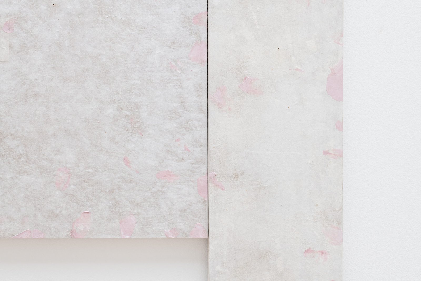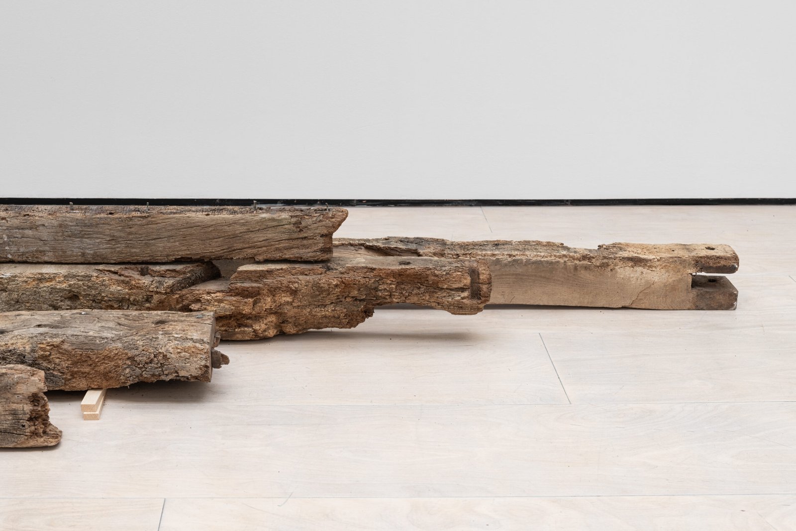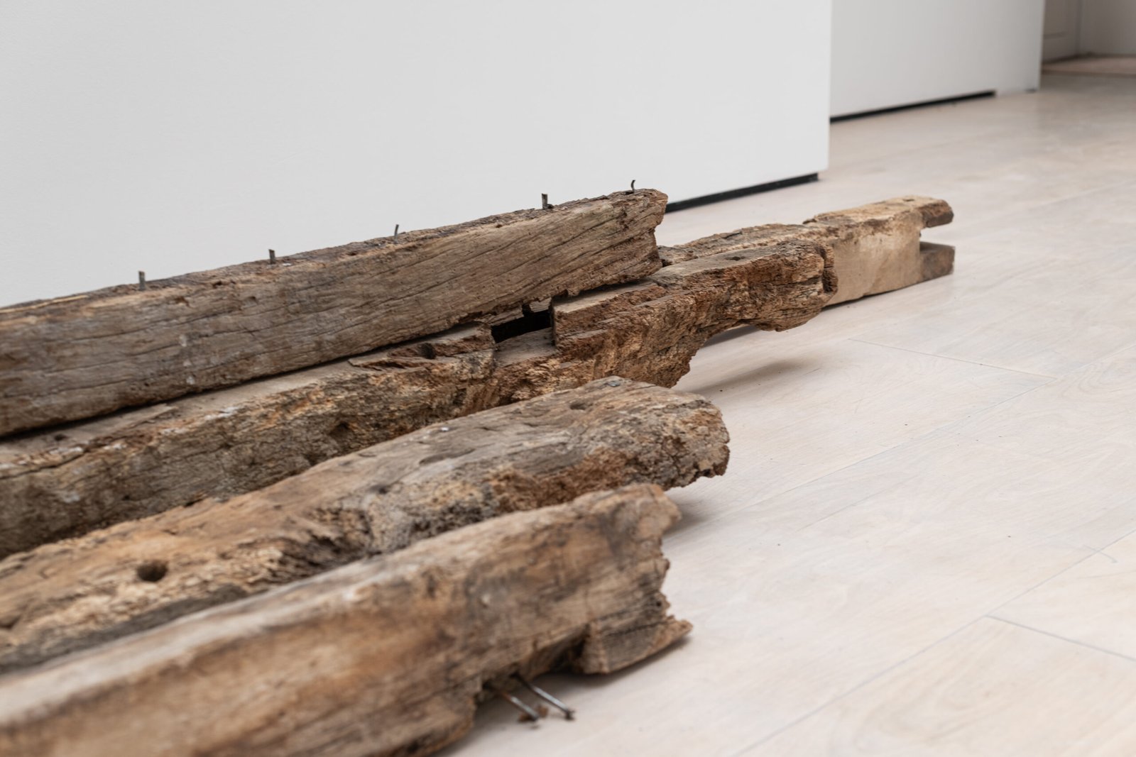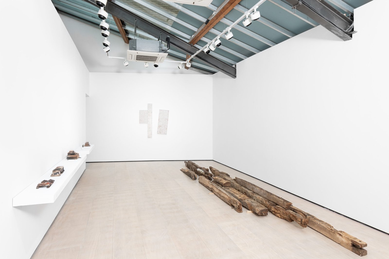 The wooden beams in the middle of the gallery, in contraposition, have been removed from an actual architectural site elsewhere. They have been stripped of their functional purpose, and now they lie in the centre of the gallery, catching the light leisurely. The site of collection is the same as that used in a previous exhibition, elongating the continuity that distils into the works’ desire for permanence and utility. The wall pieces suggest an abstract translation that combines some of the same colouring used in the ceramics on a traditional Korean paper used in architecture.