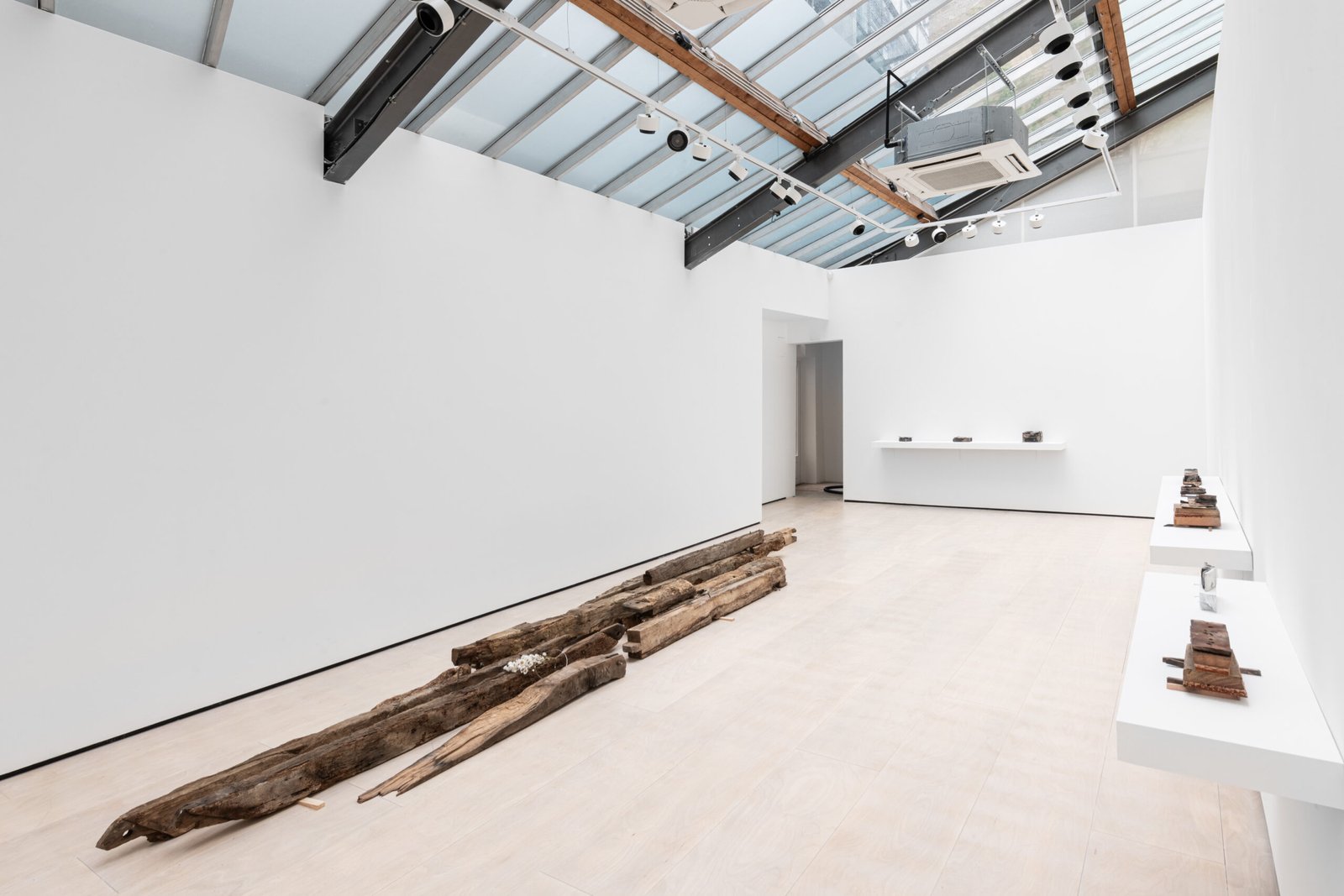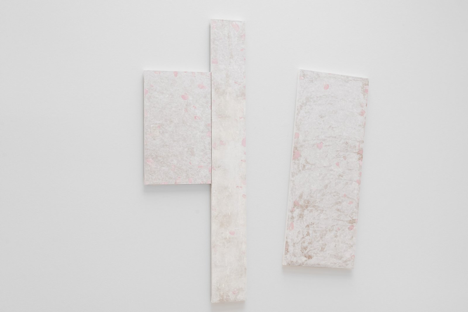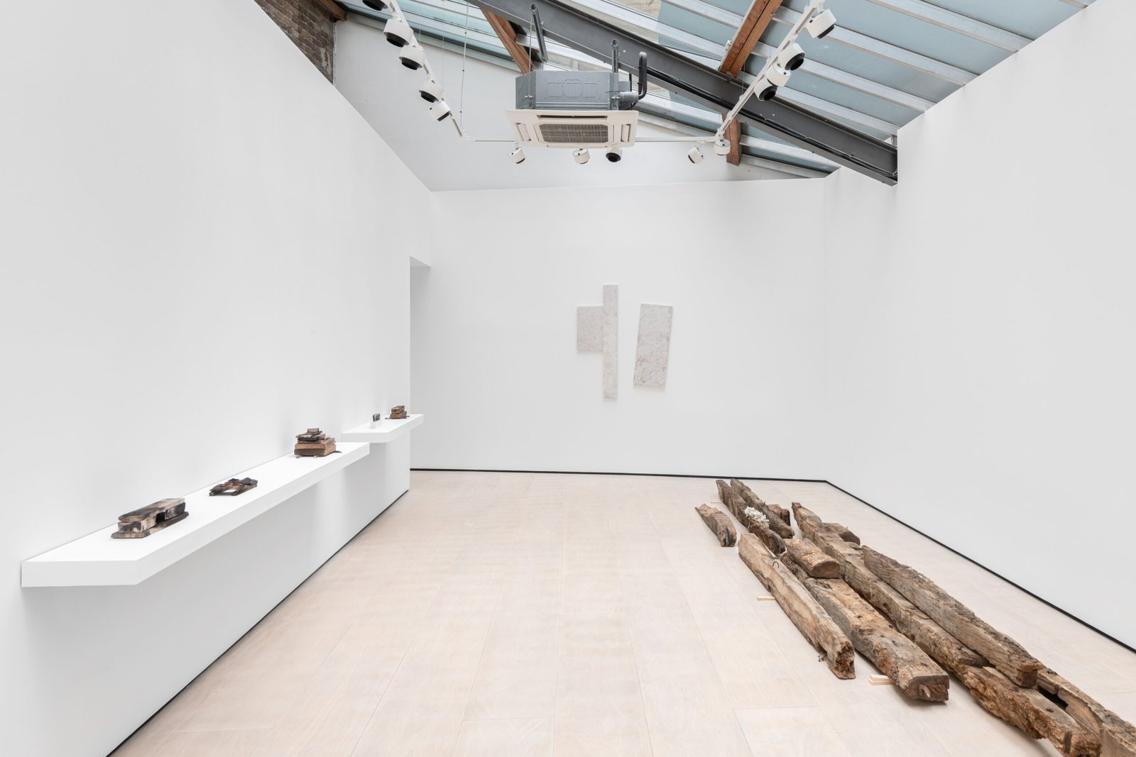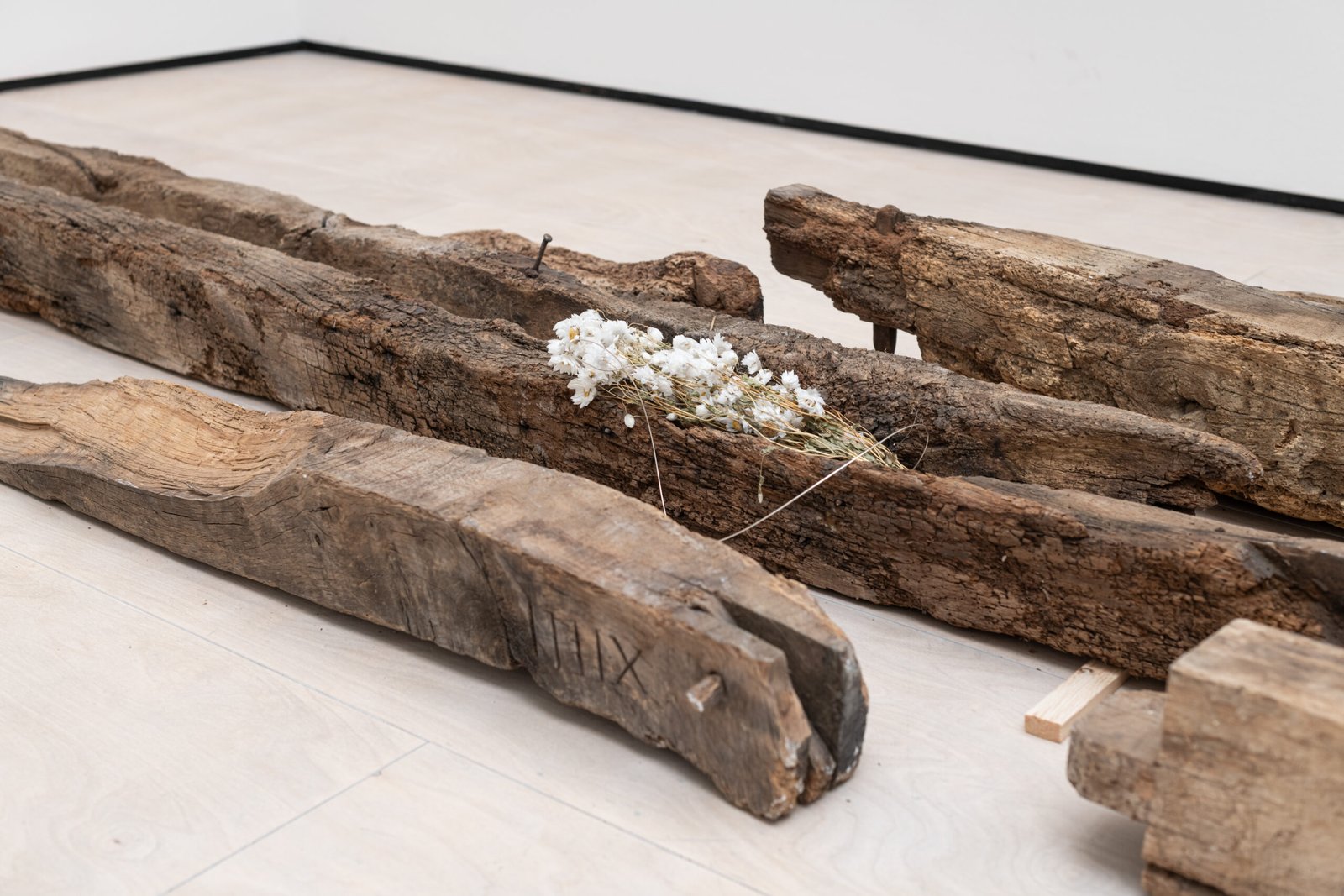 The wooden beams in the middle of the gallery, in contraposition, have been removed from an actual architectural site elsewhere. They have been stripped of their functional purpose, and now they lie in the centre of the gallery, catching the light leisurely. The site of collection is the same as that used in a previous exhibition, elongating the continuity that distils into the works’ desire for permanence and utility. The wall pieces suggest an abstract translation that combines some of the same colouring used in the ceramics on a traditional Korean paper used in architecture.