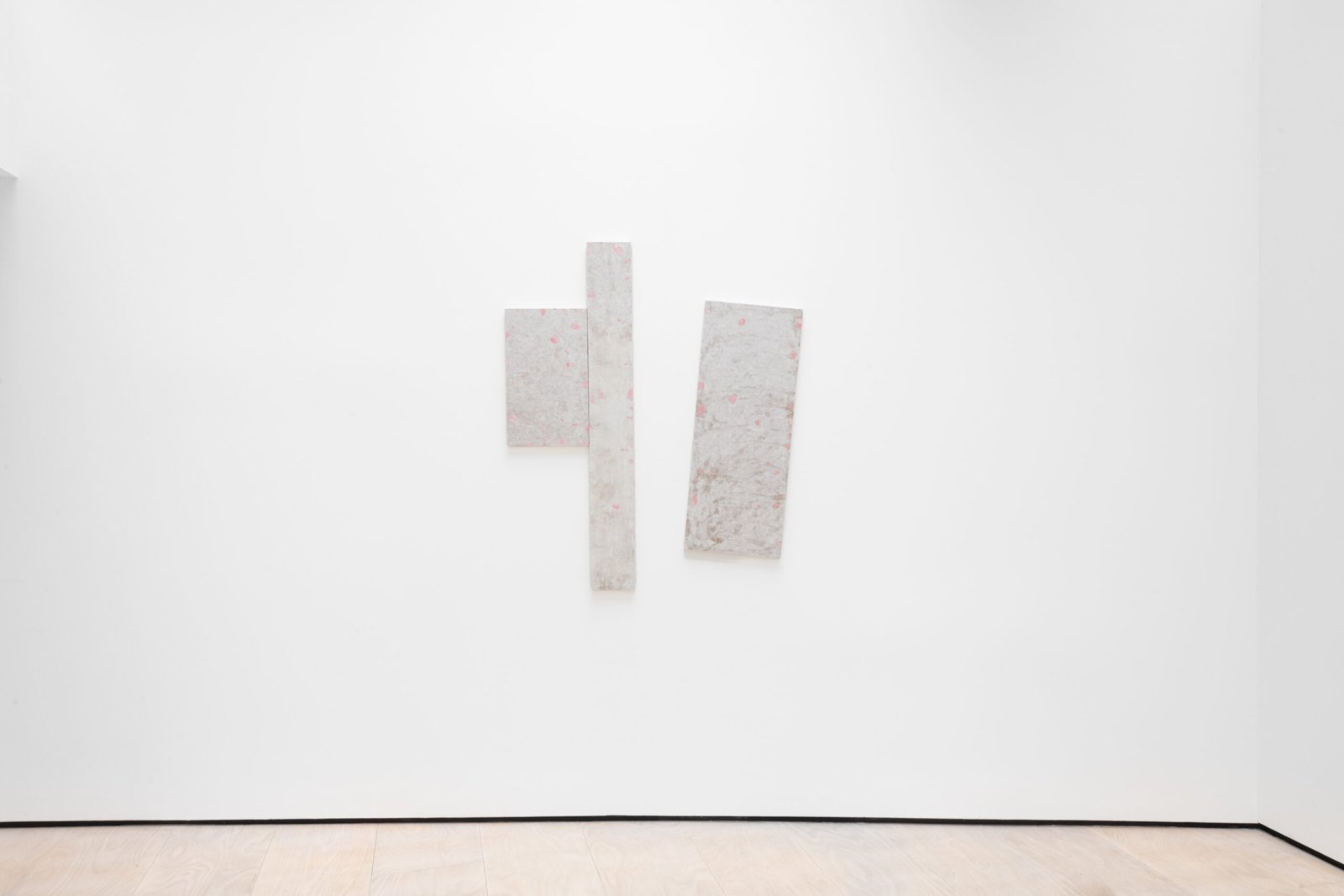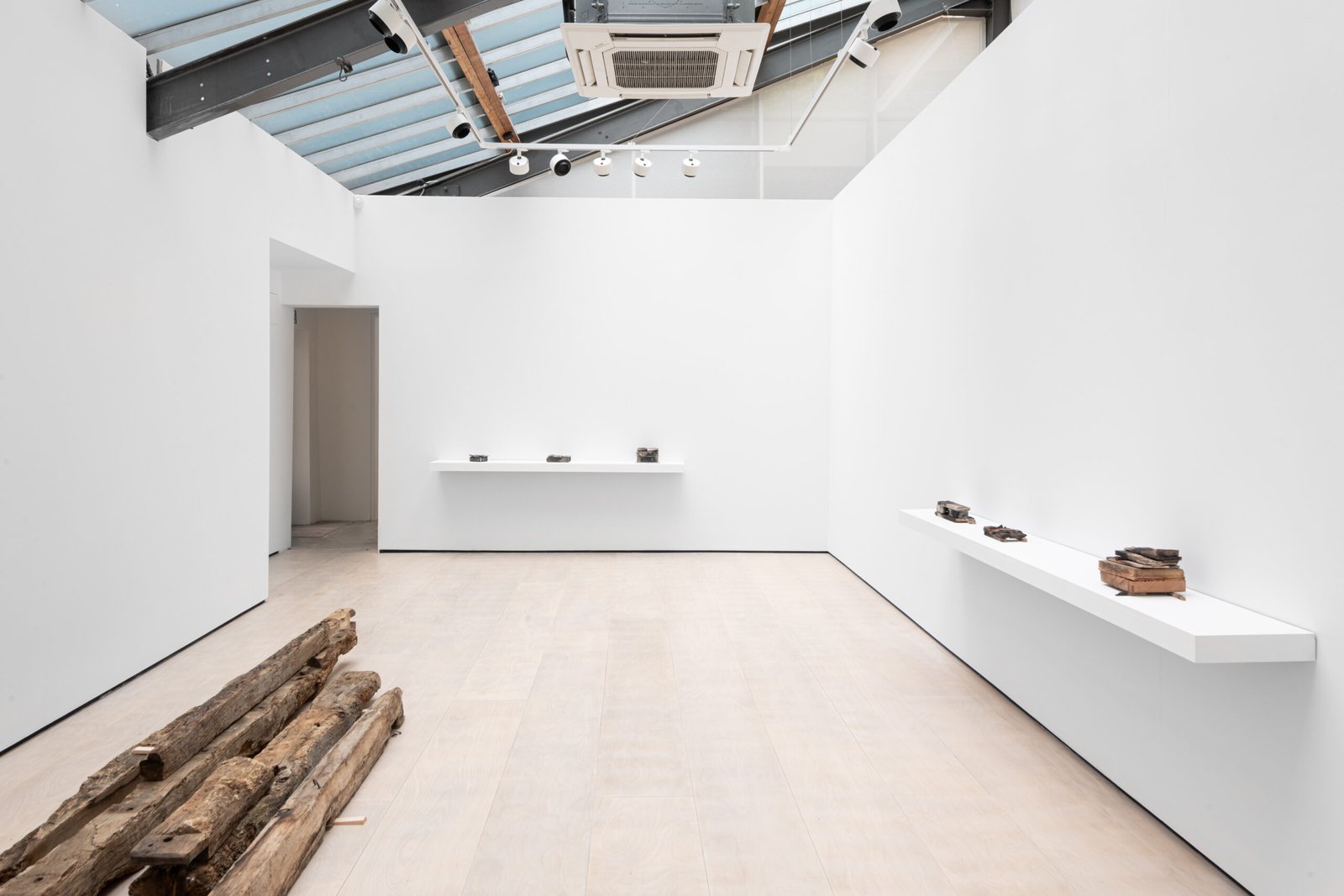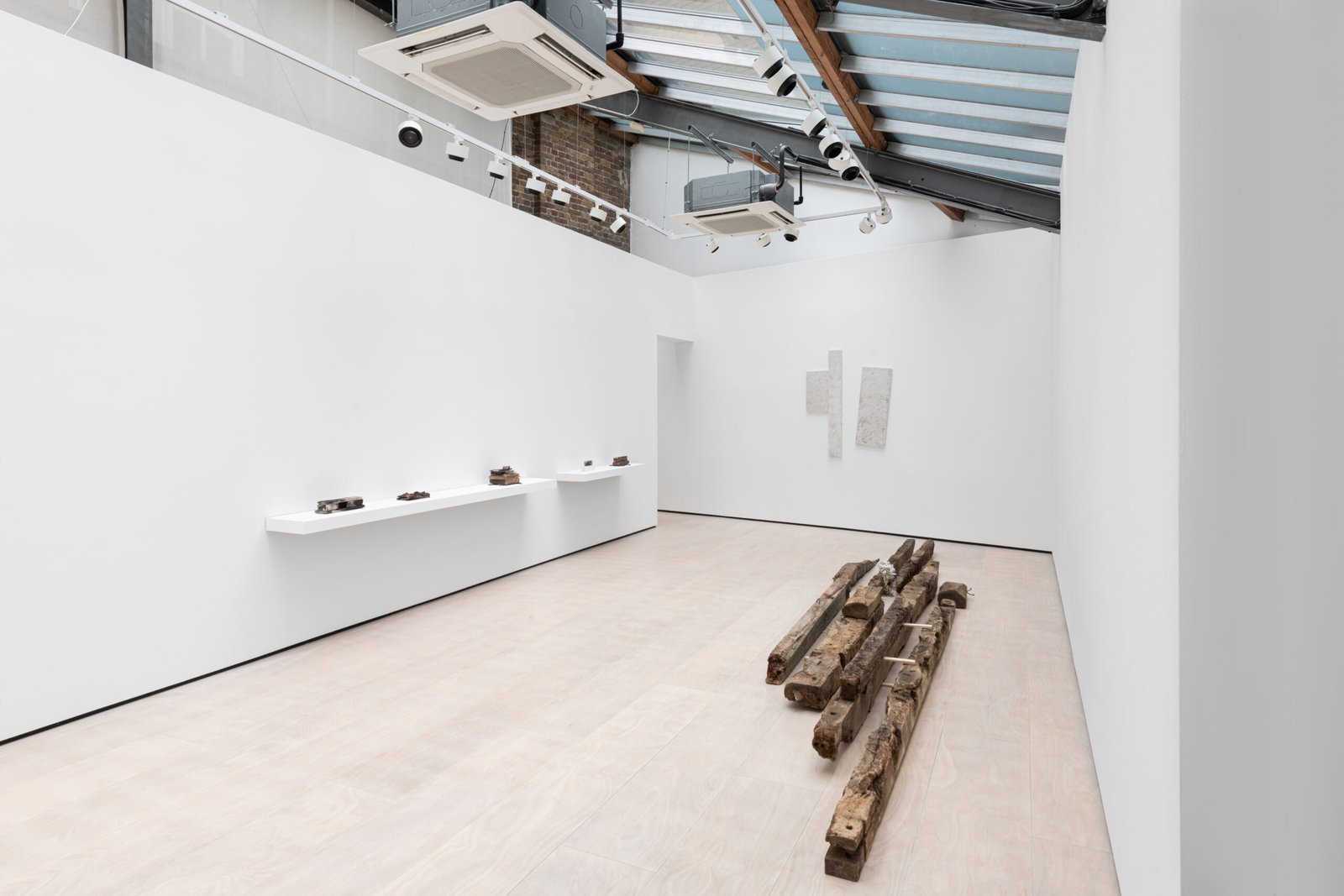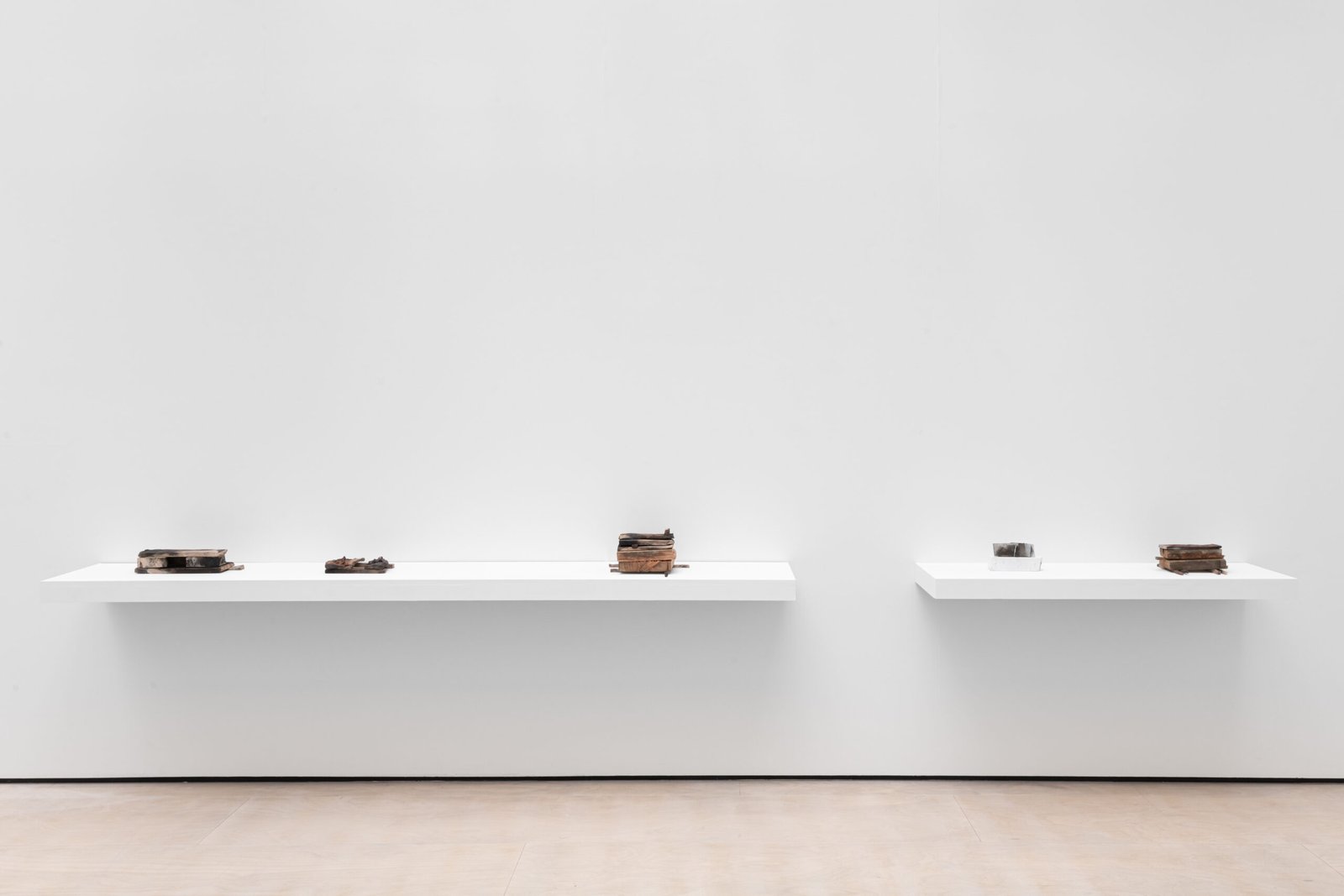 The wooden beams in the middle of the gallery, in contraposition, have been removed from an actual architectural site elsewhere. They have been stripped of their functional purpose, and now they lie in the centre of the gallery, catching the light leisurely. The site of collection is the same as that used in a previous exhibition, elongating the continuity that distils into the works’ desire for permanence and utility. The wall pieces suggest an abstract translation that combines some of the same colouring used in the ceramics on a traditional Korean paper used in architecture.