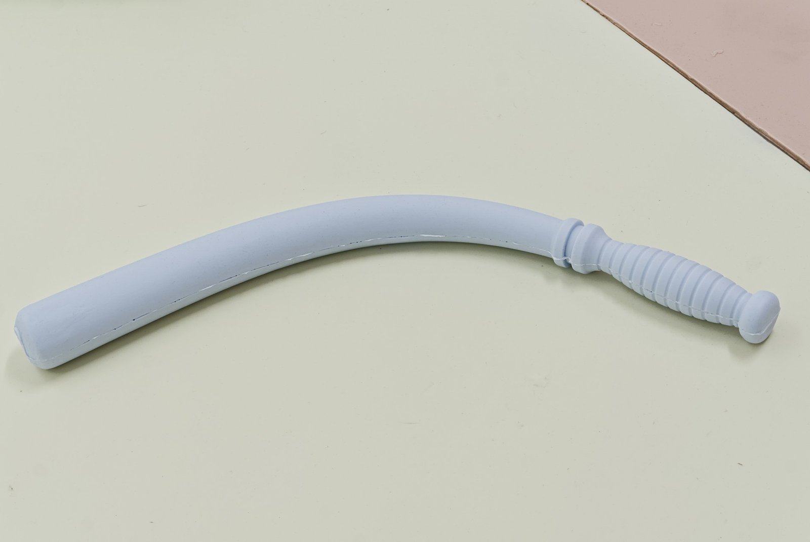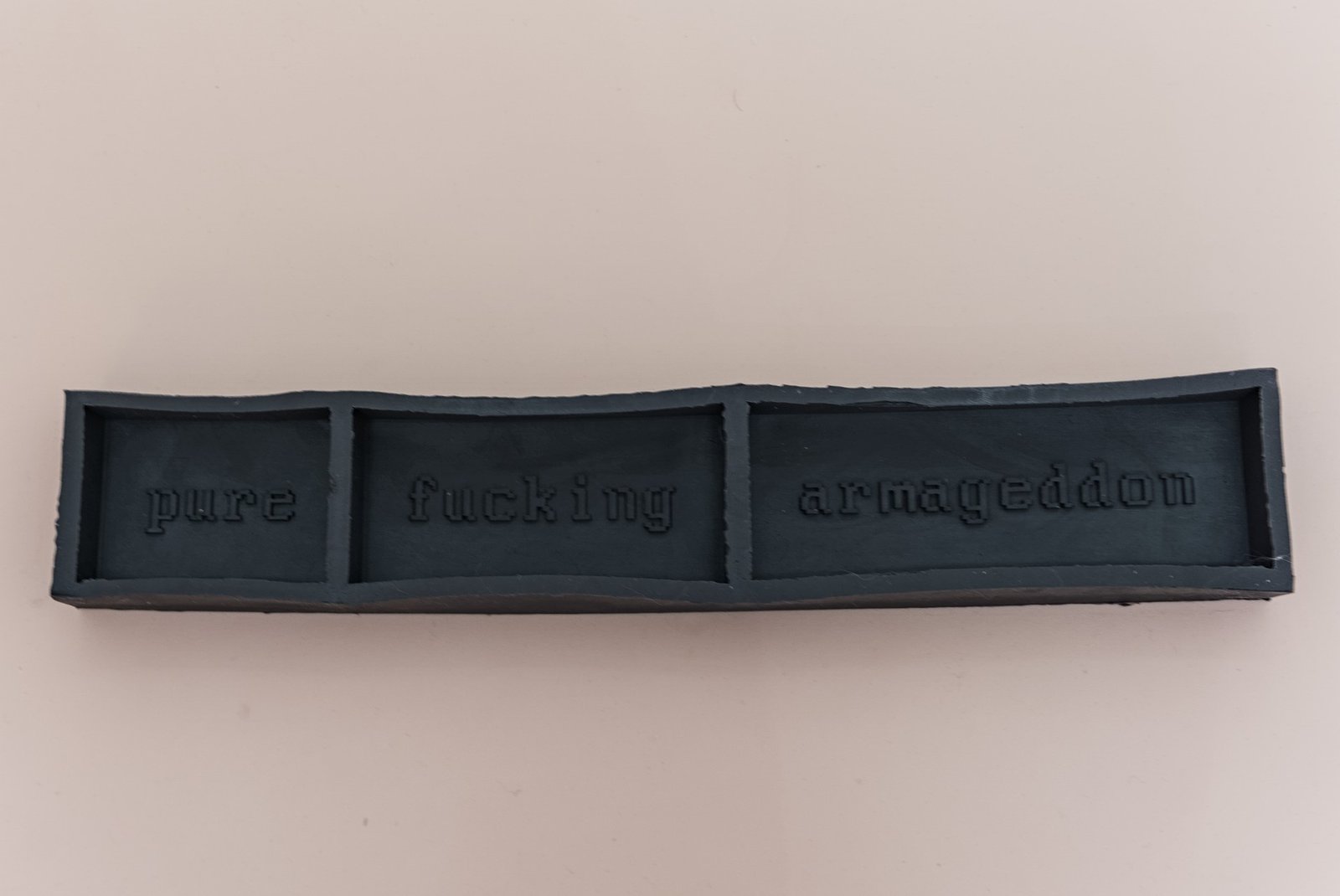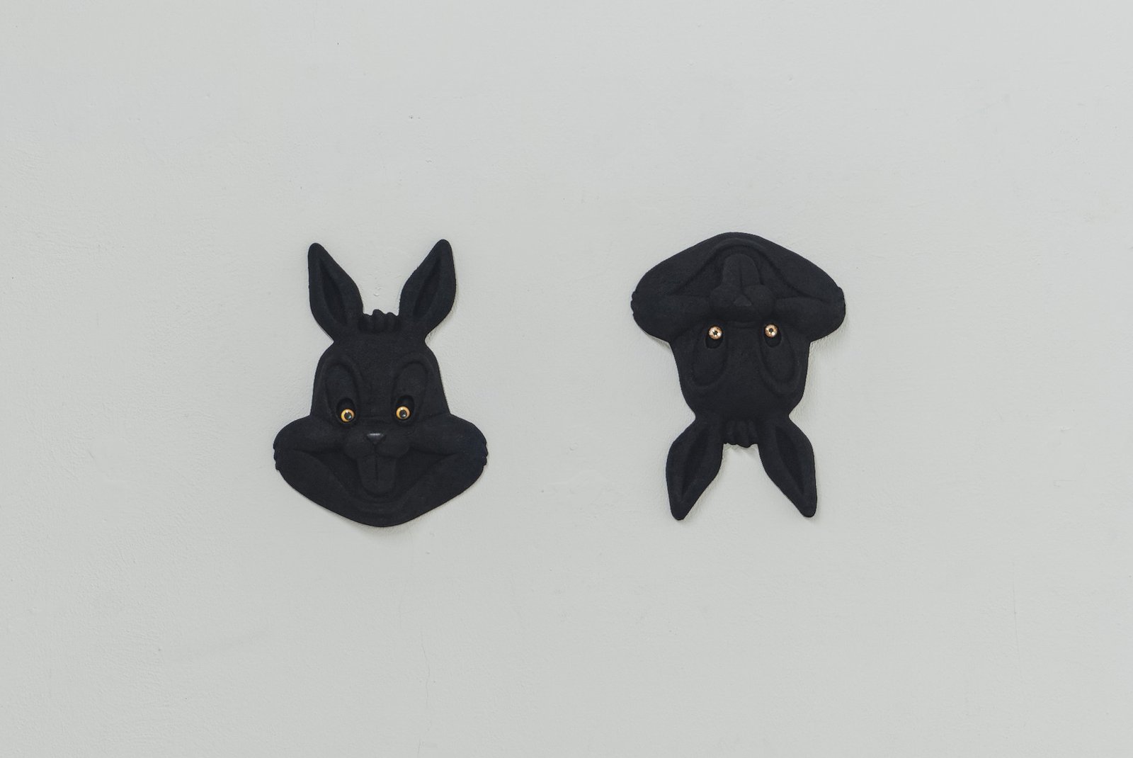 Bartram investigates these dynamics by transforming discarded industrial forms into sculptural presences, revealing the hidden infrastructures of consumer culture. His Styrofoam copy castings — rubber impressions derived from packaging waste — render tangible materials that are usually light, invisible, and disposable. Reappearing as smooth, colorful (or dark) and faintly seductive sculptures, they are not copies of originals but residues of mass production itself. The artist manipulates familiar figures — Haribo candies, cartoon characters, architectural models, and even taxidermied chicks or police batons reimagined in toy-like form — constructing a distinct visual grammar and orchestrating a choreography of objects that guides the viewer through the dynamics of control and seduction. Playfulness and a mordant irony pervade the works, simultaneously entertaining the viewer while exposing the underlying structures of power. Thus, Bartram stages a landscape of cultural capitalism that is at once absurd and unsettling — a dream factory whose foundations continue to crumble. Repetition, exaggeration, and surreal juxtaposition structure the core of his practice, traversed by a dark irony in the depiction of ecological damage, institutional violence, and emotional desertification, revealing how traditional American ideals such as freedom, individualism and progress circulate no longer as lived values but as empty symbols, endlessly reproduced and consumed.