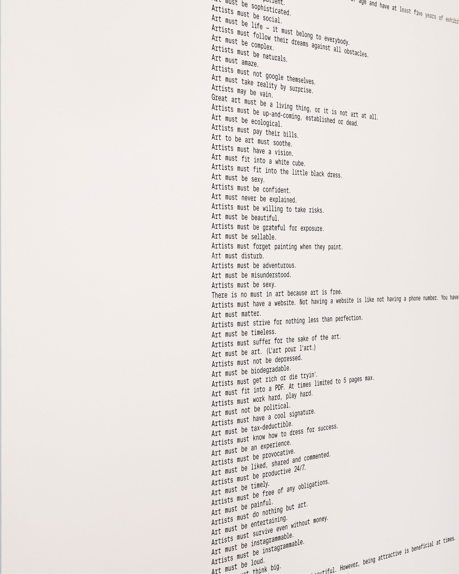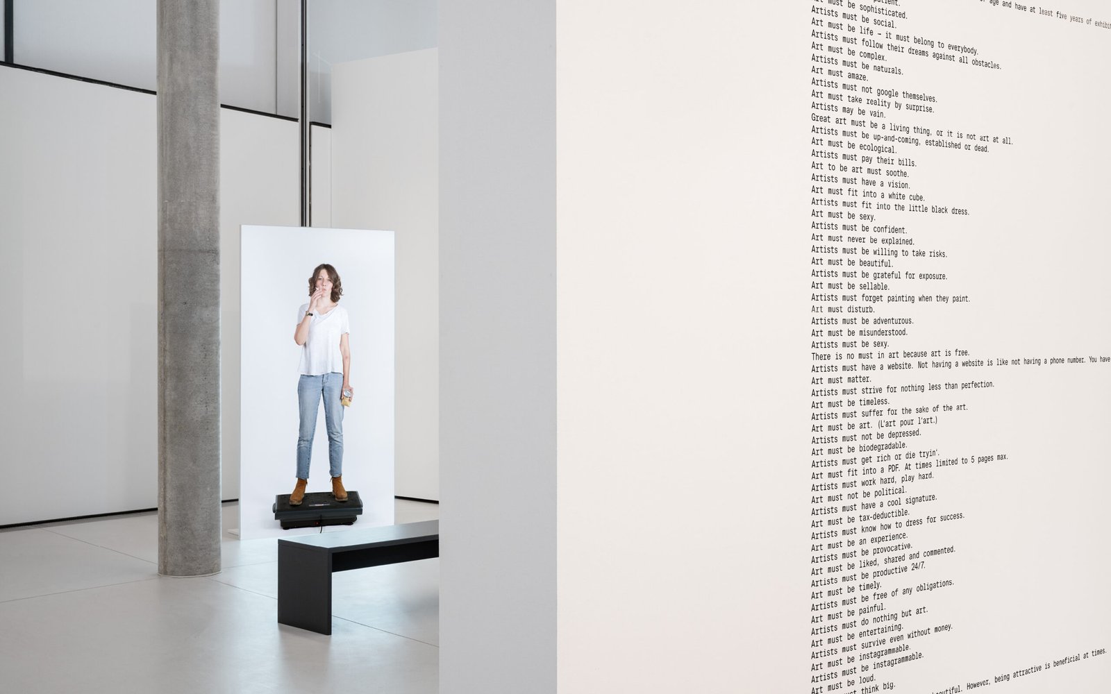 Lisa Großkopf’s solo exhibition, »Solid Performance«, tackles the relentless pressure to achieve in the modern age. The pervasive sense that we must constantly work on ourselves or be “on” at all times permeates every aspect of our lives. Through a mix of humor, critique, and raw vulnerability, her videos, photographs, installations, and performances confront these impossible standards. One wall piece perfectly captures the specific expectations placed on art and artists: they are expected to be beautiful, timeless, and long-suffering. Großkopf’s core provocation remains: Why, exactly, is that the case?