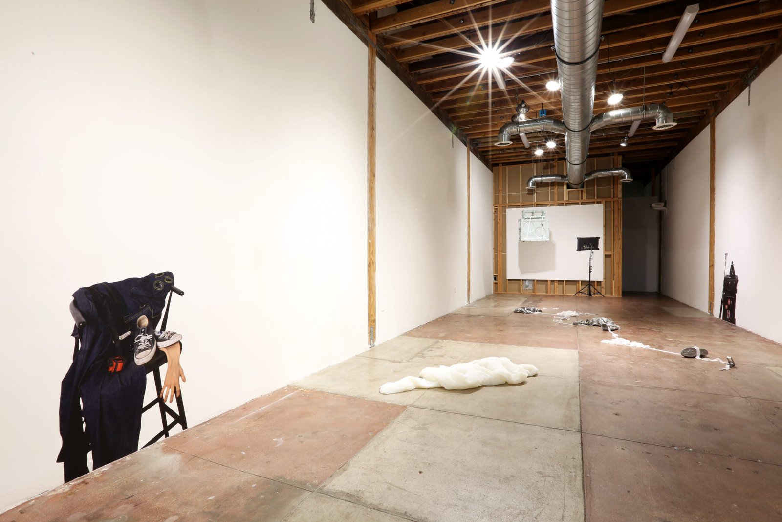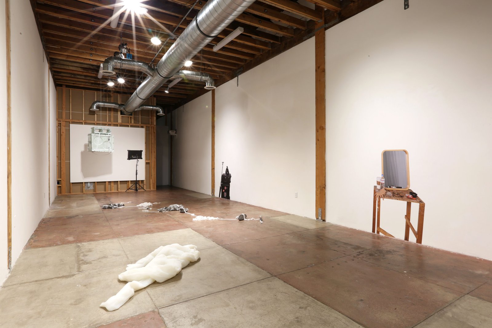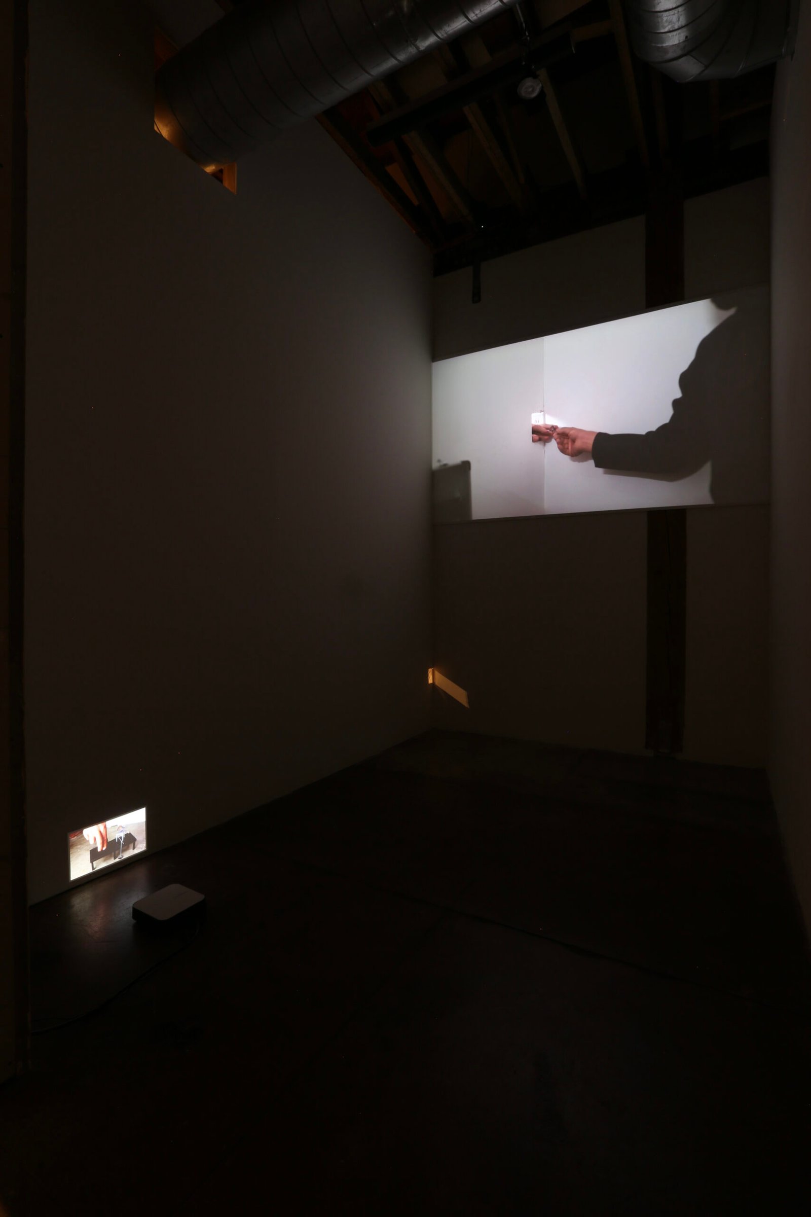 Meanwhile, this is the first exhibition at the gallery where we have actually (physically) produced the work in the space of the gallery itself—the gallery appears as itself in the context of this work—as itself, but also as someone else, somewhere else: right here… for now…. (Like learning my mother-tongue again, for the first time: remembering how I forget what you remember.) With this staged perspective initially set-up as a way of paying-attention to how “the market”—and at this point, politics— automatively absorbs opposition, converting it into consumable form, “the exhibition,” as well as the gallery itself, are positioned as activities that are obviously always in reach of commodification (if not already in circulation). “The artist’s” acts of refusal and gestures of transgression are continually folded back into the very systems they oppose: any performance is already [recorded,] reenacted. Otherwise, they won’t make money. They just won’t cut it. After all, anything cutting-edge still needs to be brought to the center of attention, bought and sold, transacted-on… or else! Or else what? Or, else. (What is-is this, a ‘knock-knock’ joke?)