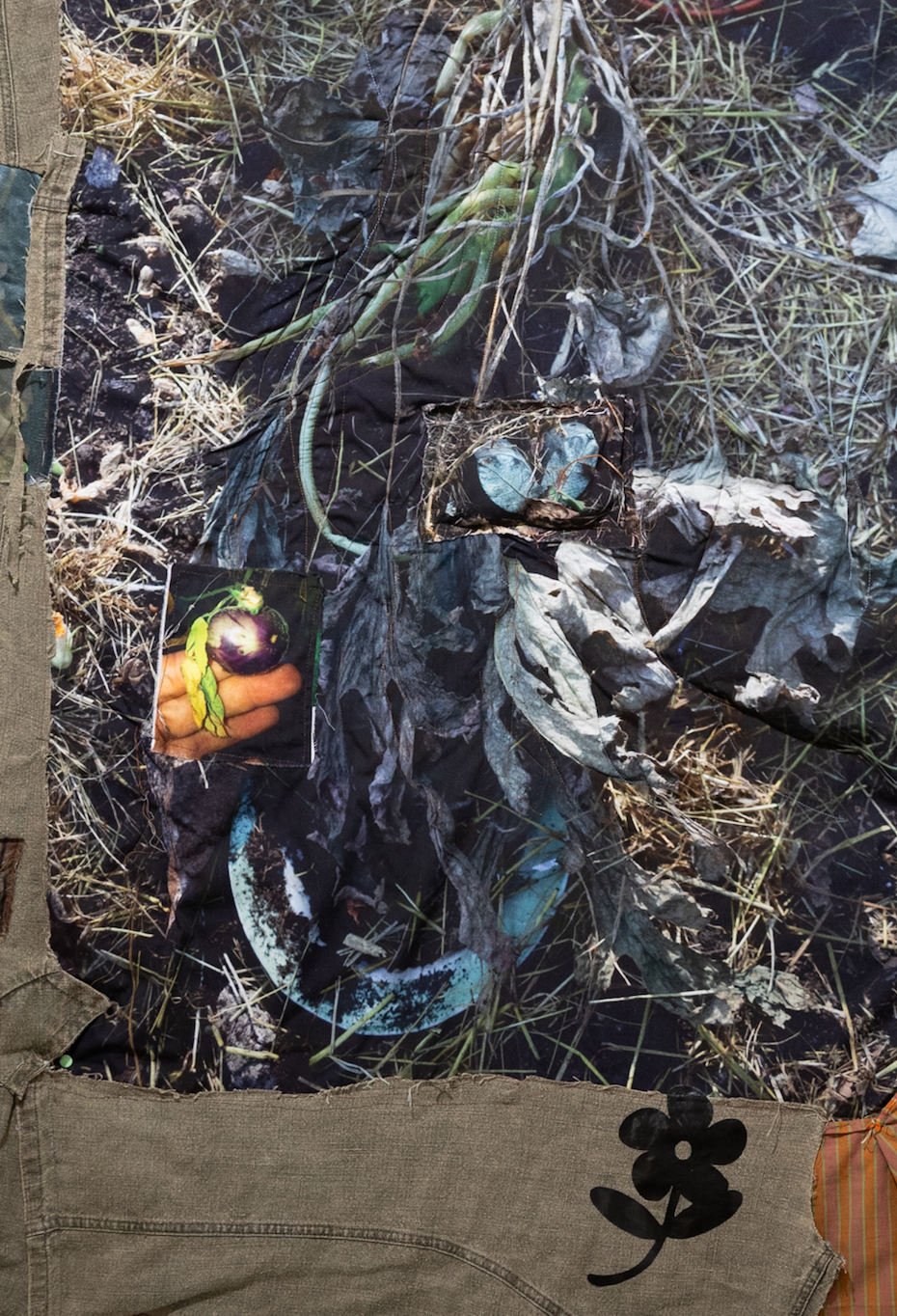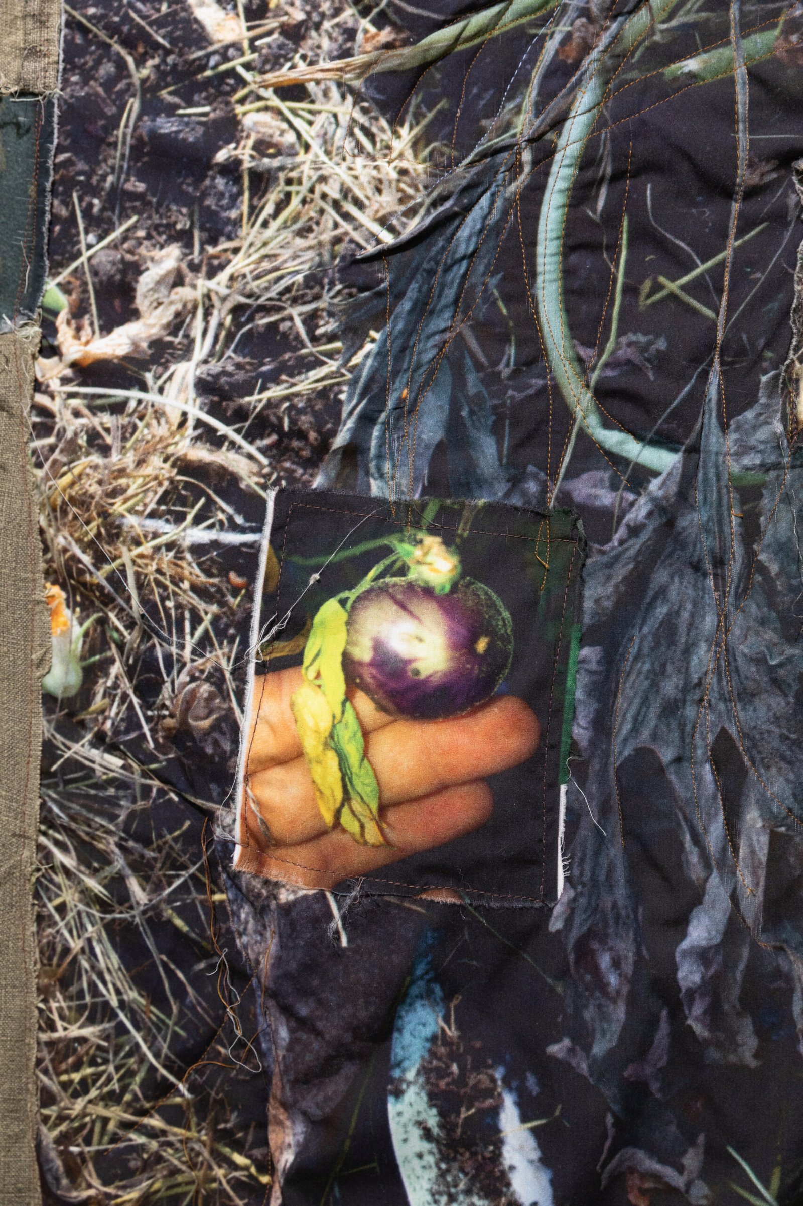 The works were developed alongside Blosseville’s work in the garden and her visits to the oral culture archive at the Finnish Literature Society, where she has been reading people’s anecdotes about their daily lives, their relationships with their bodies and their connections to the land. While browsing through the archive, the artist kept stumbling upon stories that shared the idea of the ground as a conductive net. Blosseville now transposes this idea into a body of work that can be considered as a web of conductivity, where the pixels of digital images are given physical form within the weave of textiles.