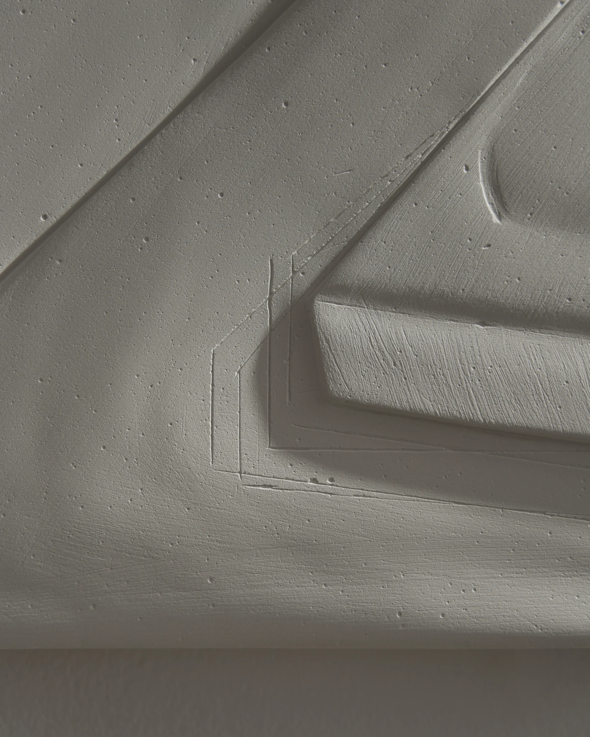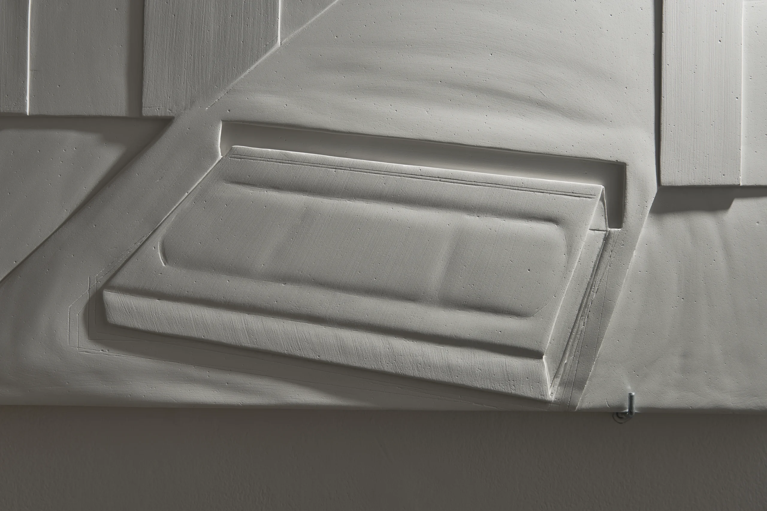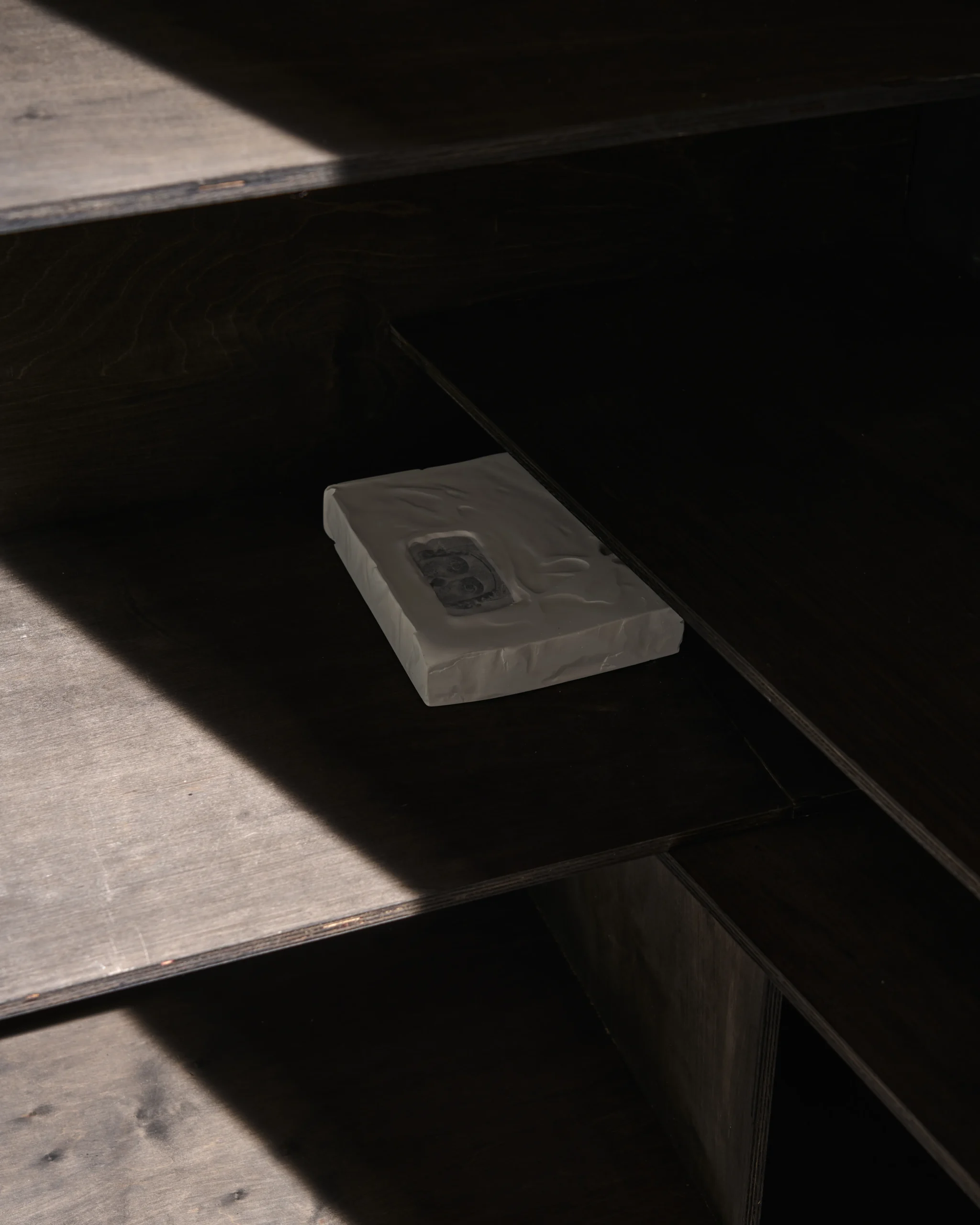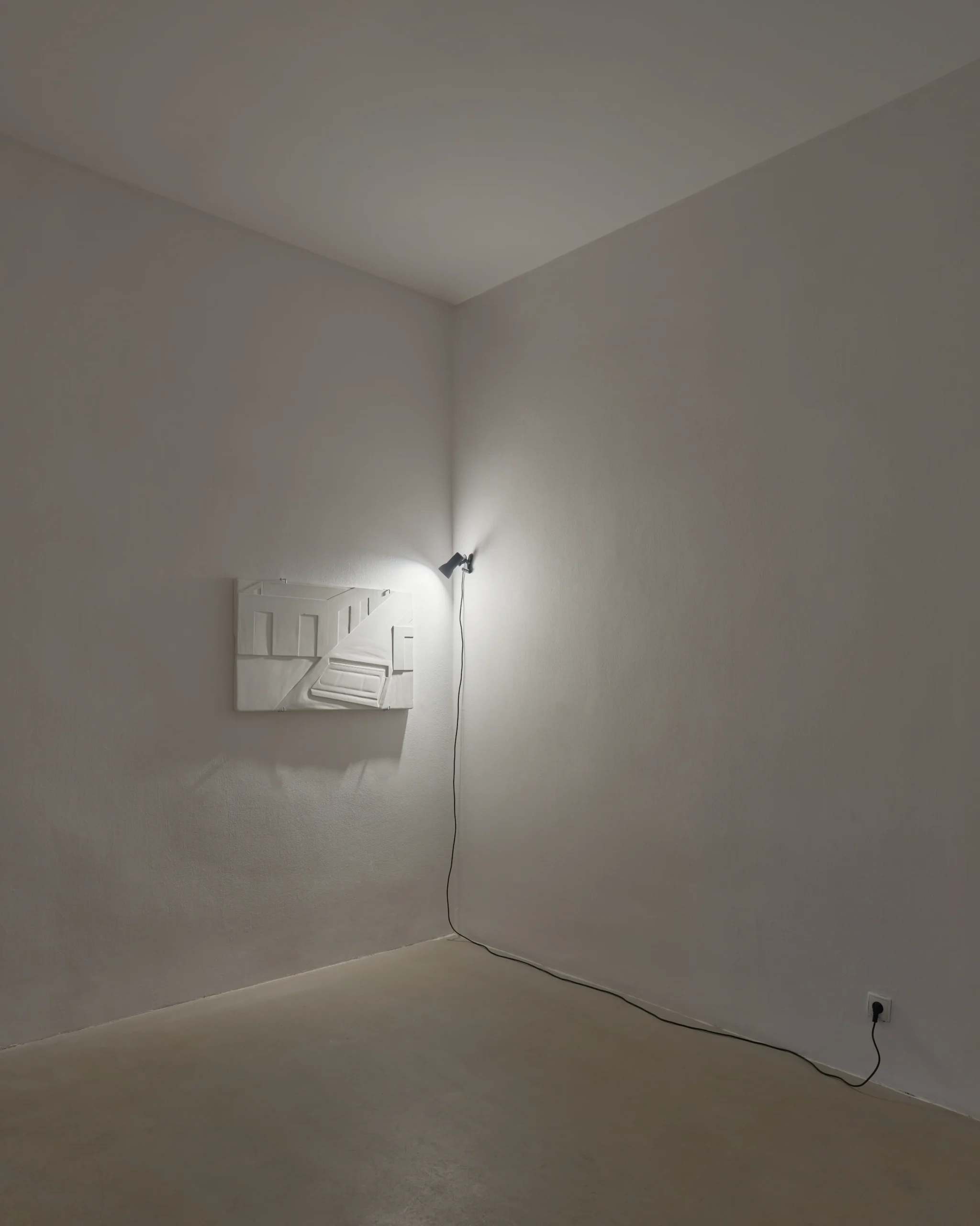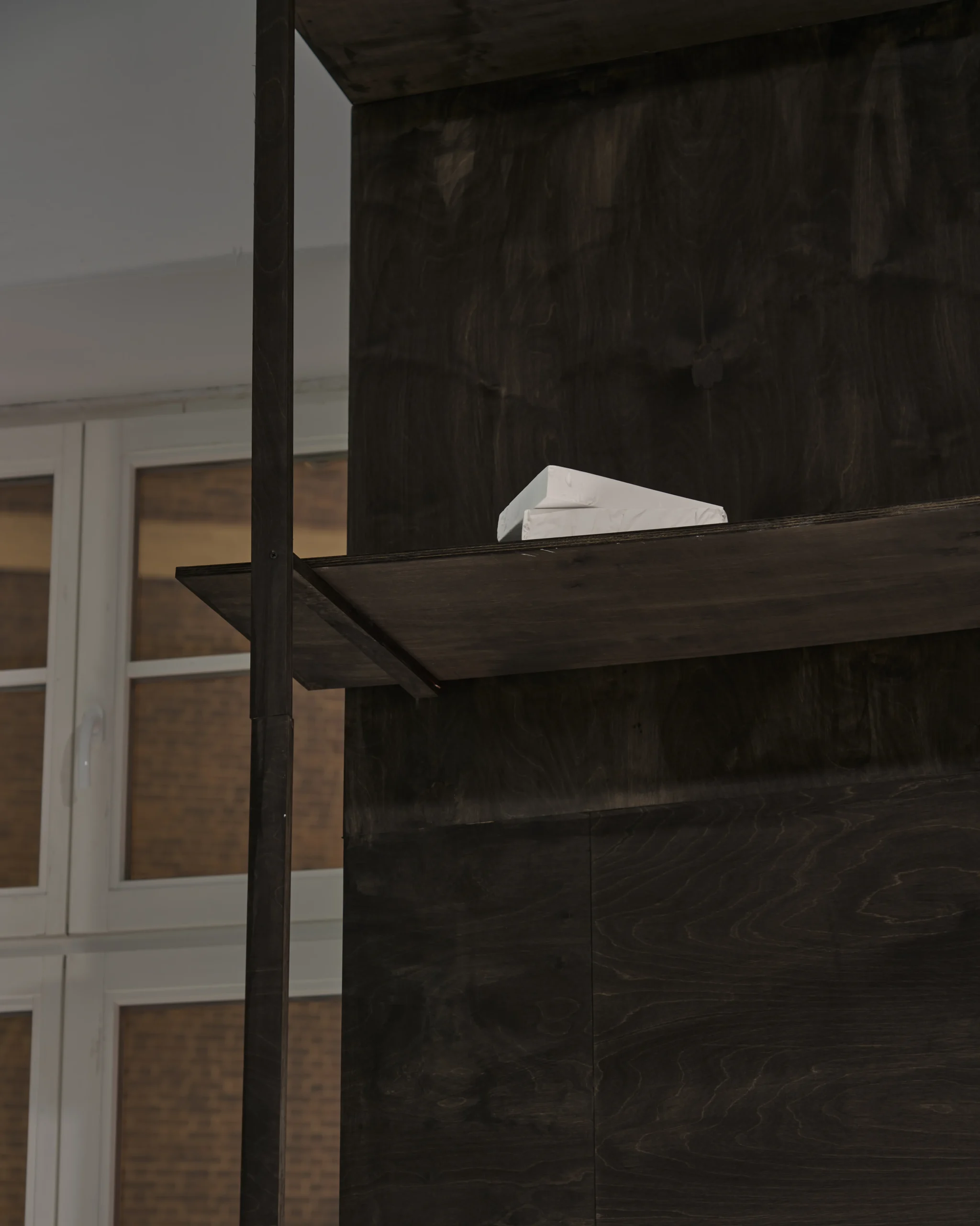 How to grasp something that exists only in fragments? Plaster reliefs and plywood objects employ a language of reduction. They organise weight, rhythm and internal relationships ‒ both within individual works and across the exhibition as a whole. This restrained visual system allows elements typically perceived as cool or distanced to function as carriers of affect and emotional charge. In this way, the exhibition spatialises anxiety and uncertainty, which ‒ like vultures suspended midair – hover above the structure of THE GRAND MEMORY.
