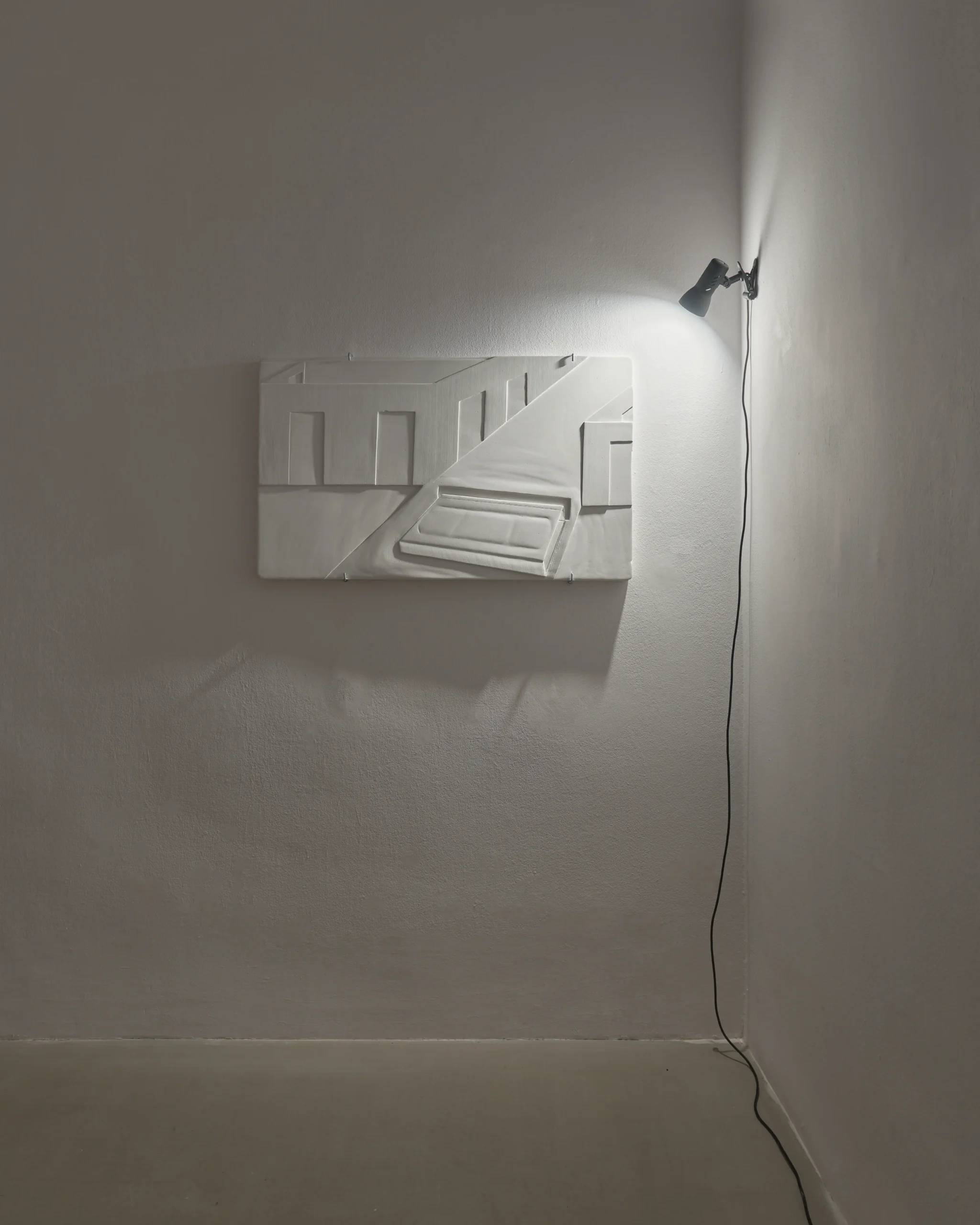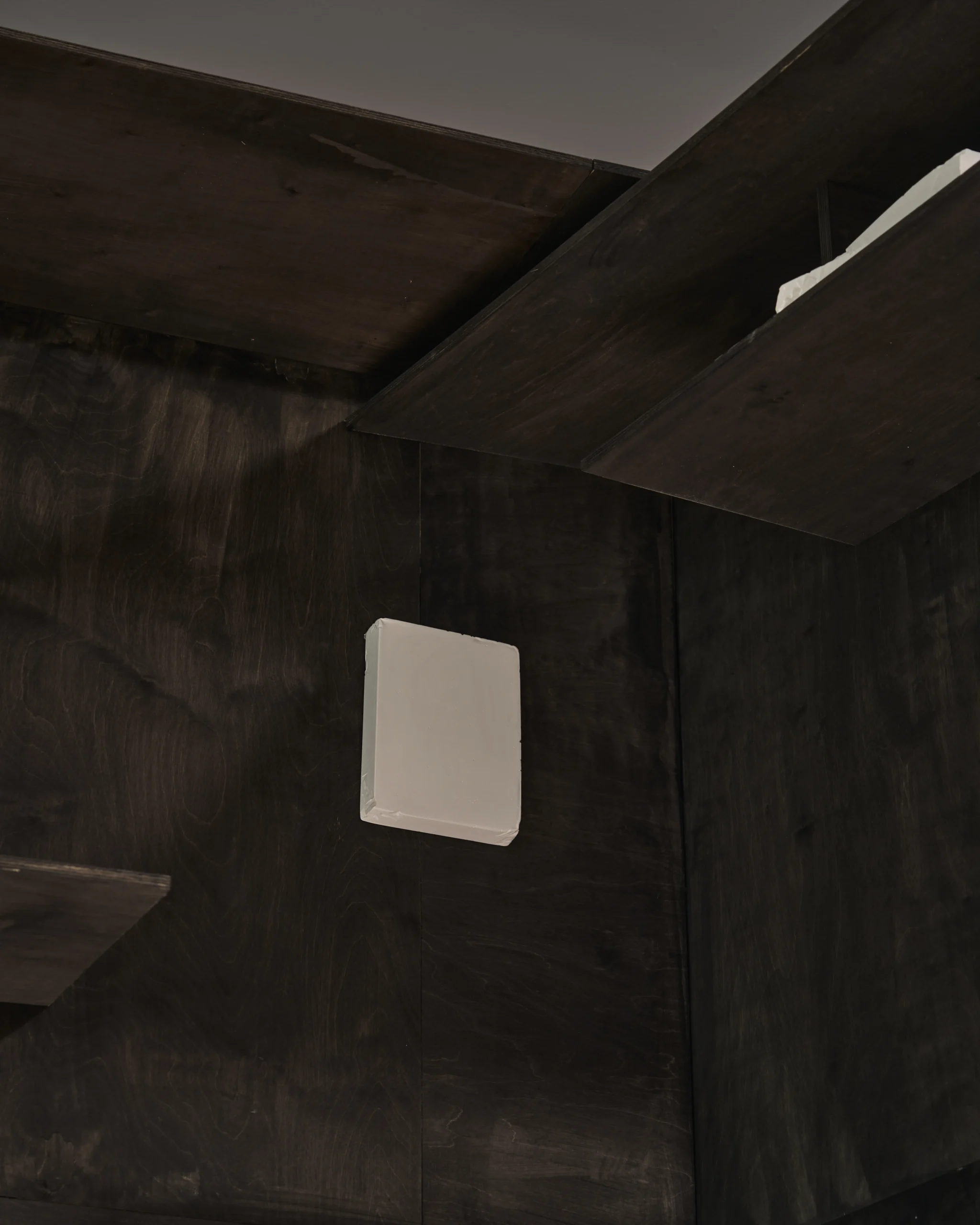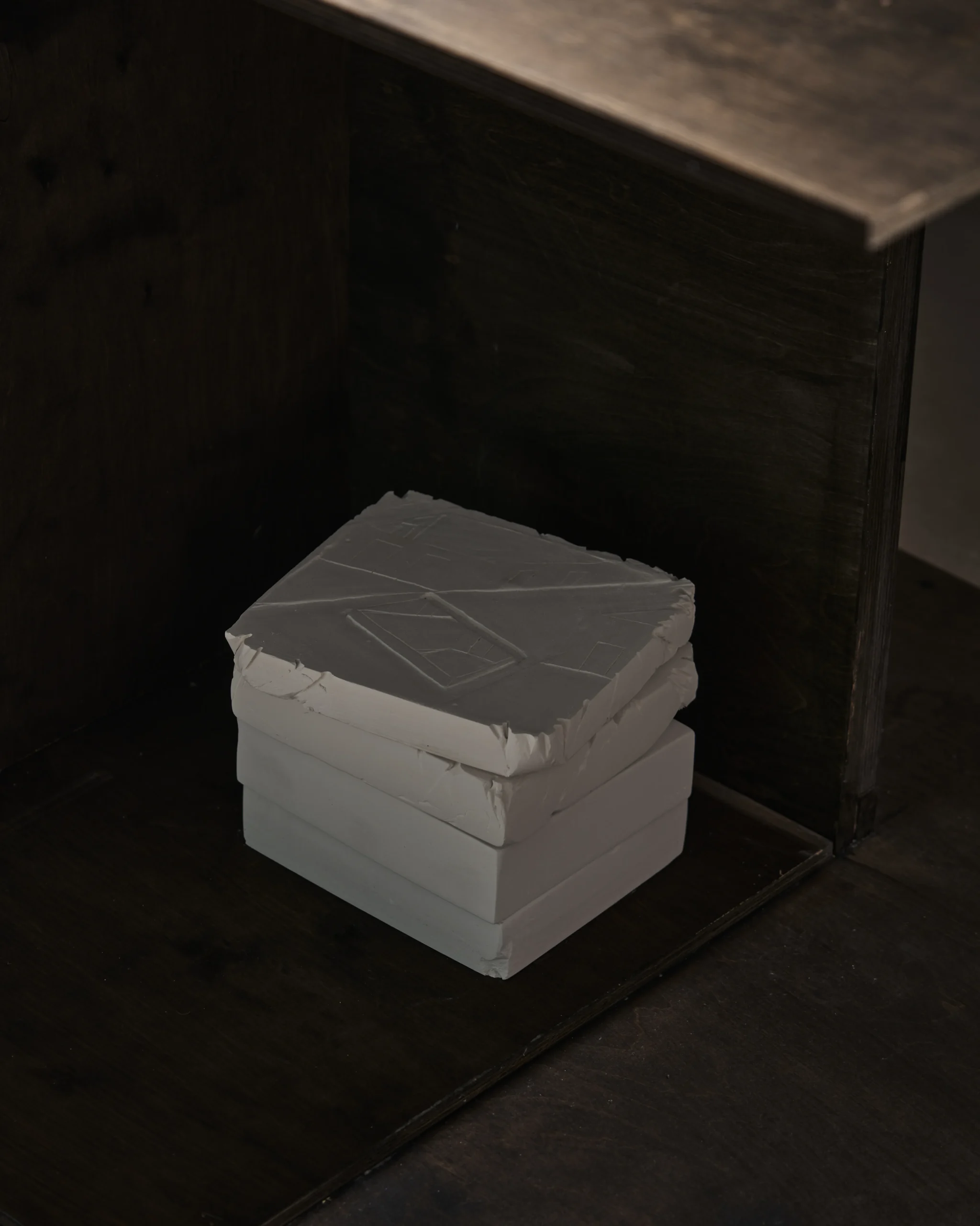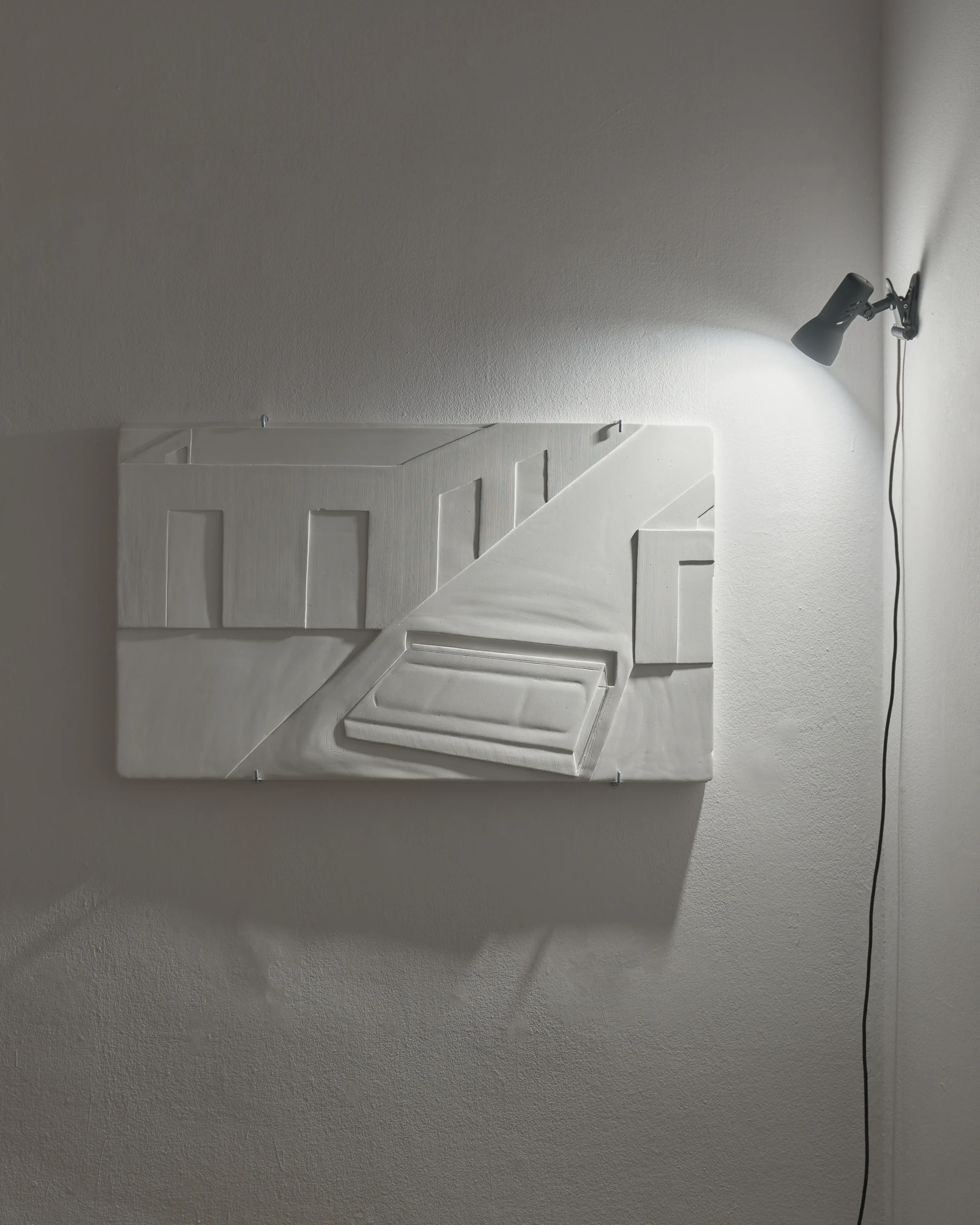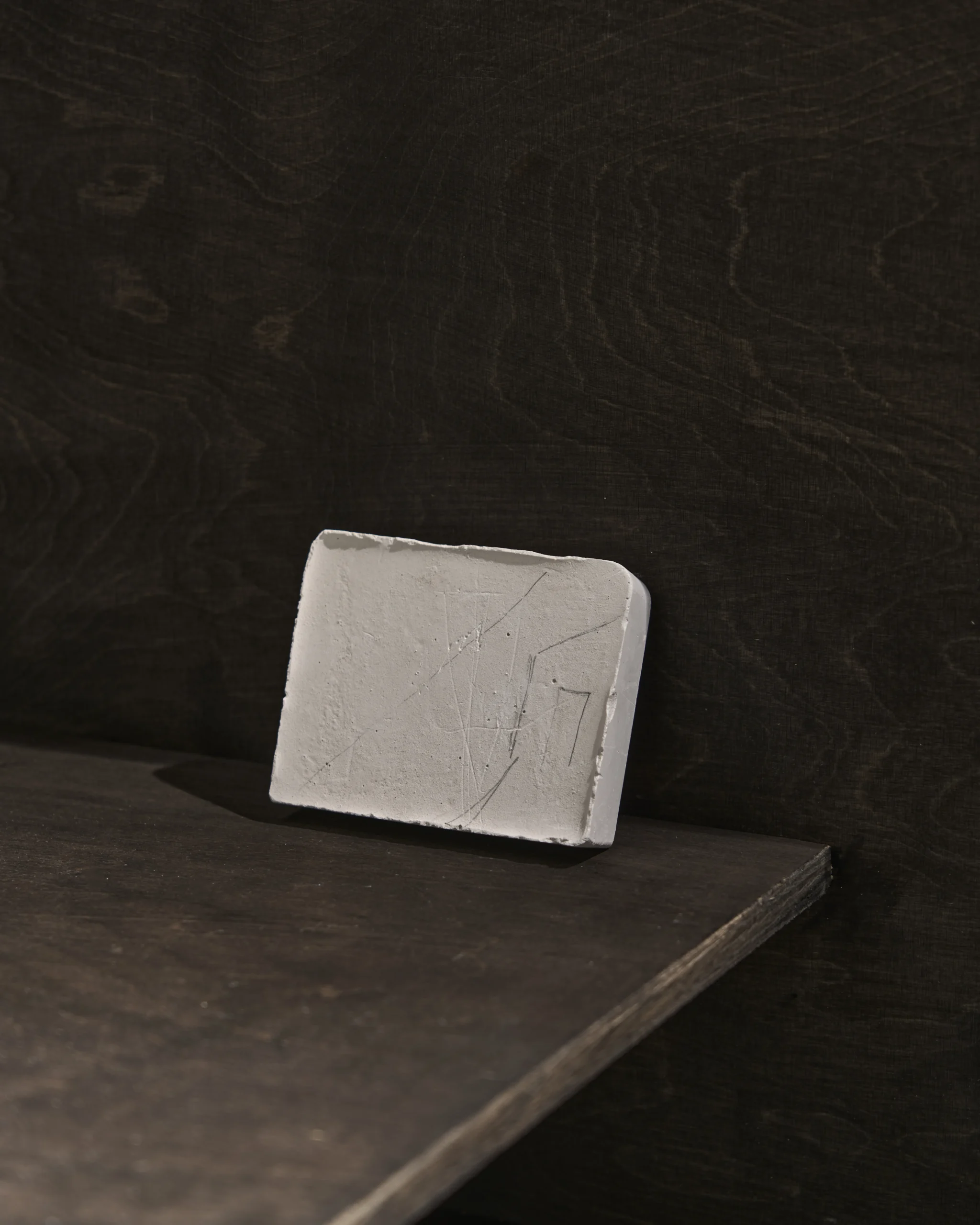How to grasp something that exists only in fragments? Plaster reliefs and plywood objects employ a language of reduction. They organise weight, rhythm and internal relationships ‒ both within individual works and across the exhibition as a whole. This restrained visual system allows elements typically perceived as cool or distanced to function as carriers of affect and emotional charge. In this way, the exhibition spatialises anxiety and uncertainty, which ‒ like vultures suspended midair – hover above the structure of THE GRAND MEMORY.