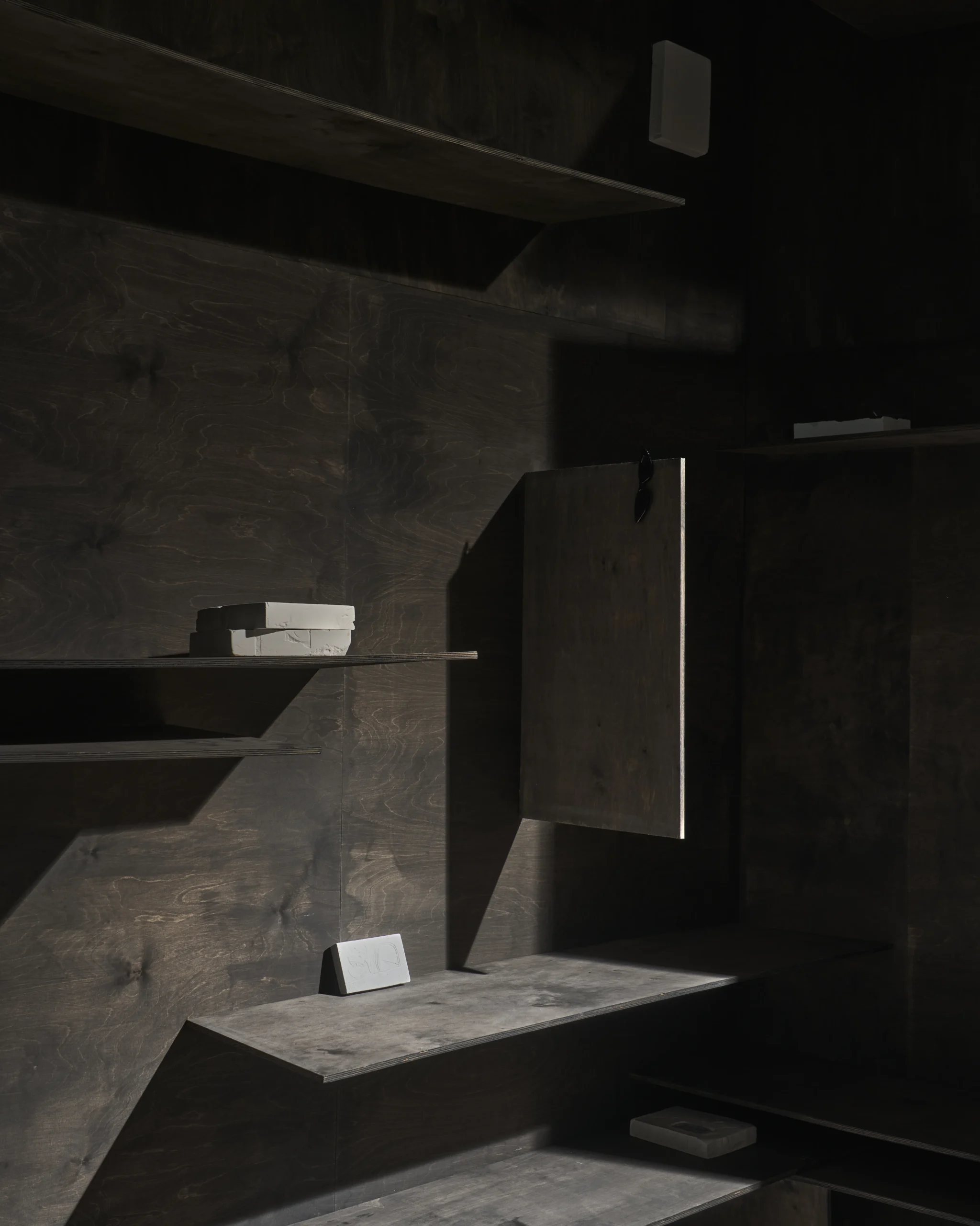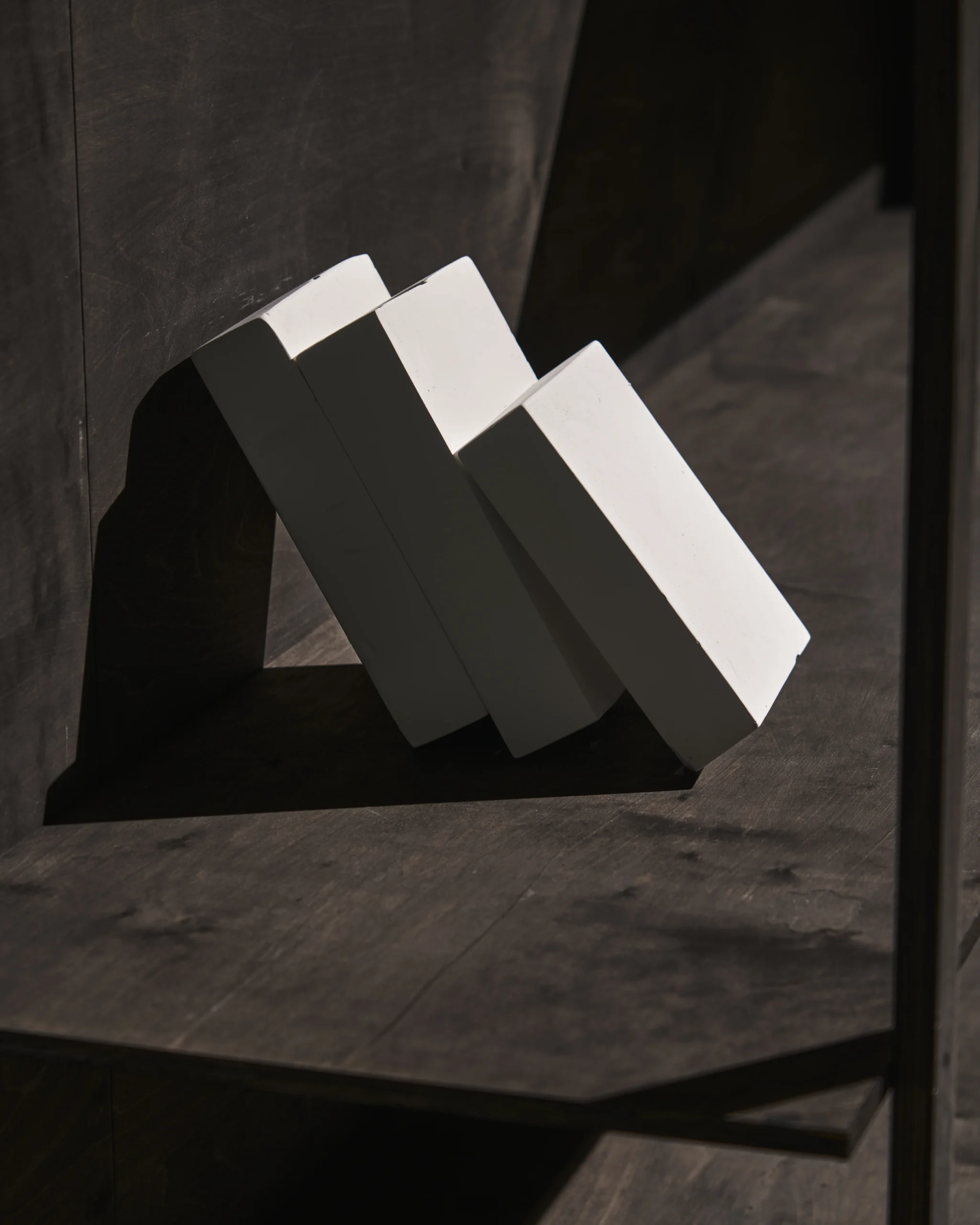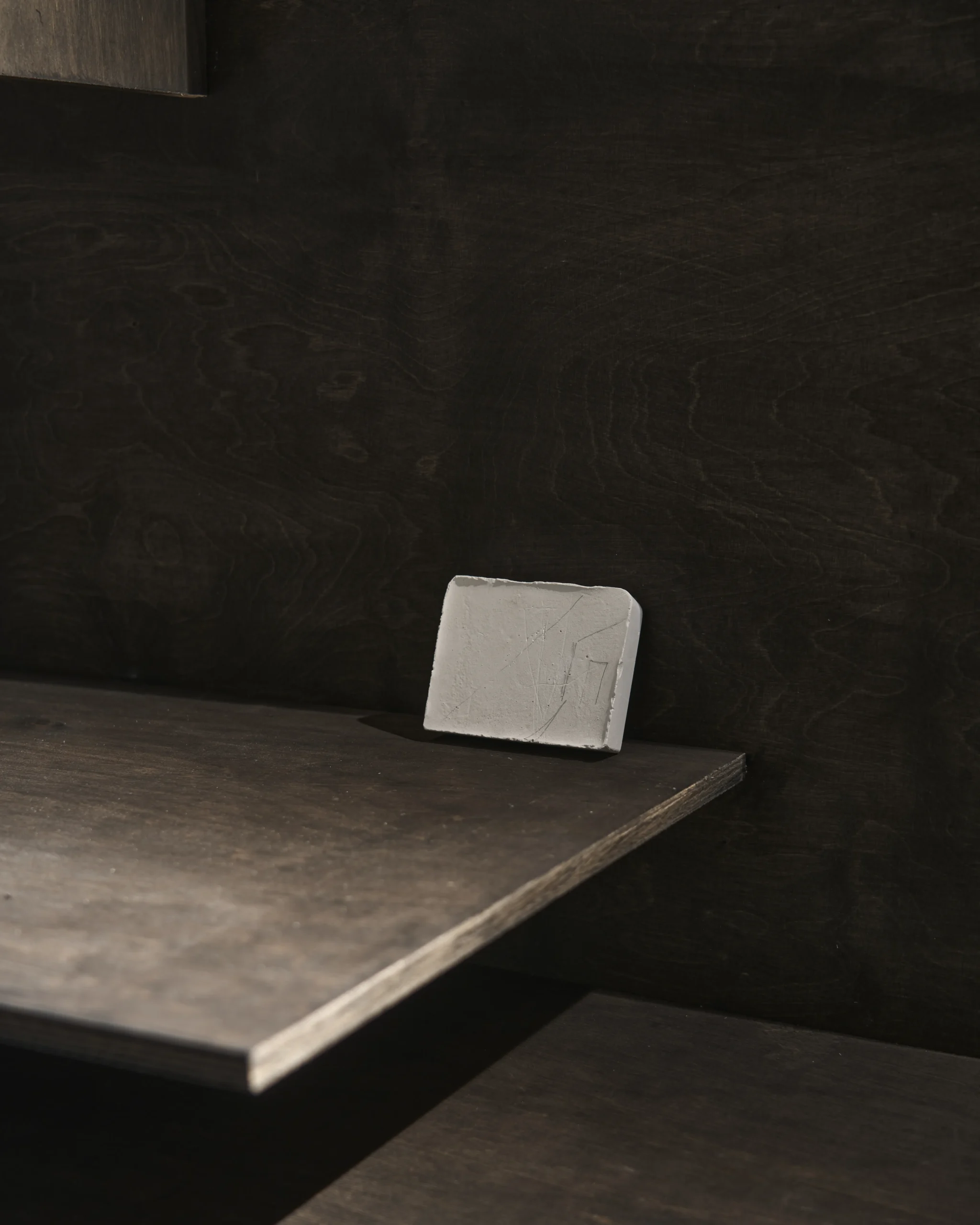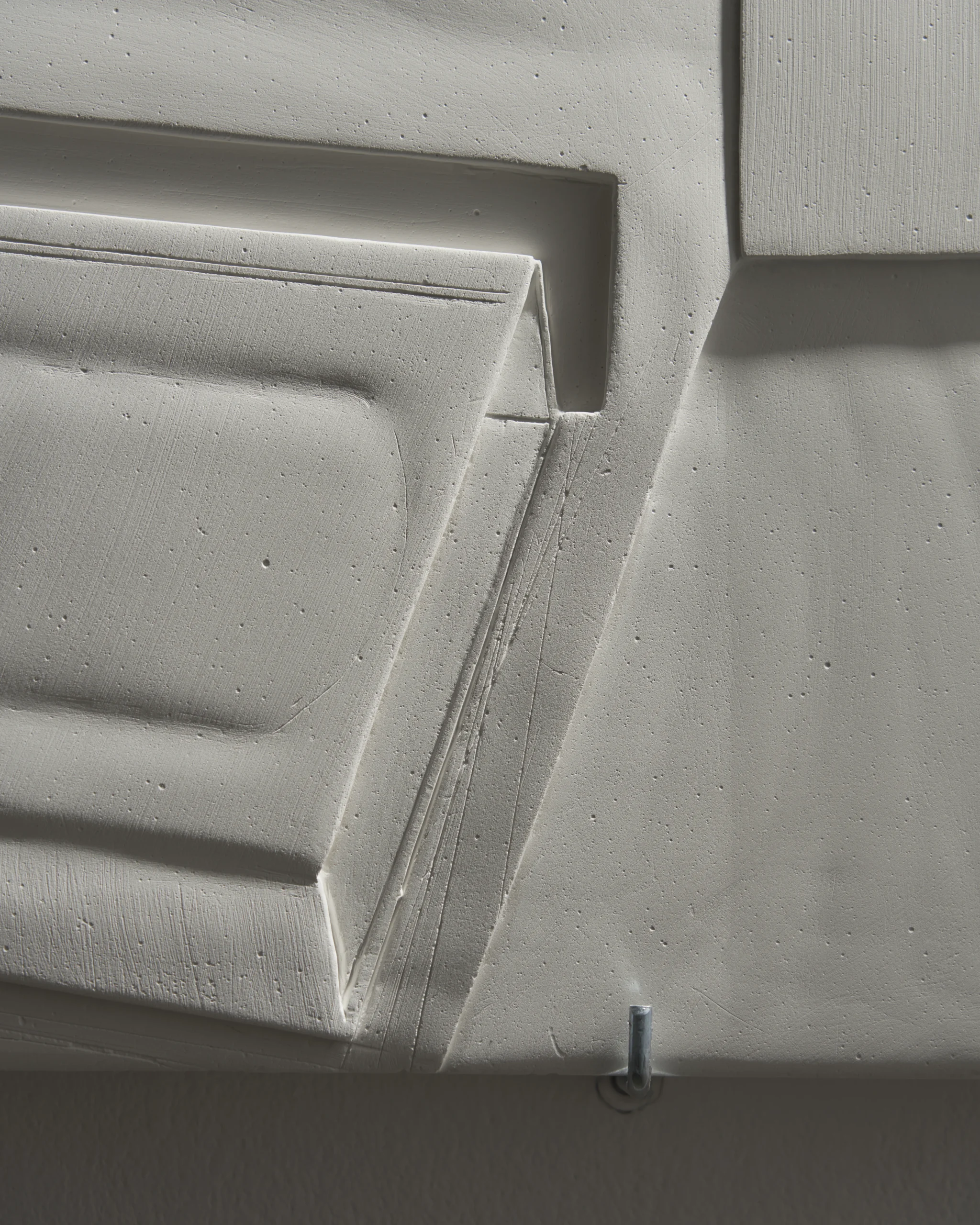 How to grasp something that exists only in fragments? Plaster reliefs and plywood objects employ a language of reduction. They organise weight, rhythm and internal relationships ‒ both within individual works and across the exhibition as a whole. This restrained visual system allows elements typically perceived as cool or distanced to function as carriers of affect and emotional charge. In this way, the exhibition spatialises anxiety and uncertainty, which ‒ like vultures suspended midair – hover above the structure of THE GRAND MEMORY.