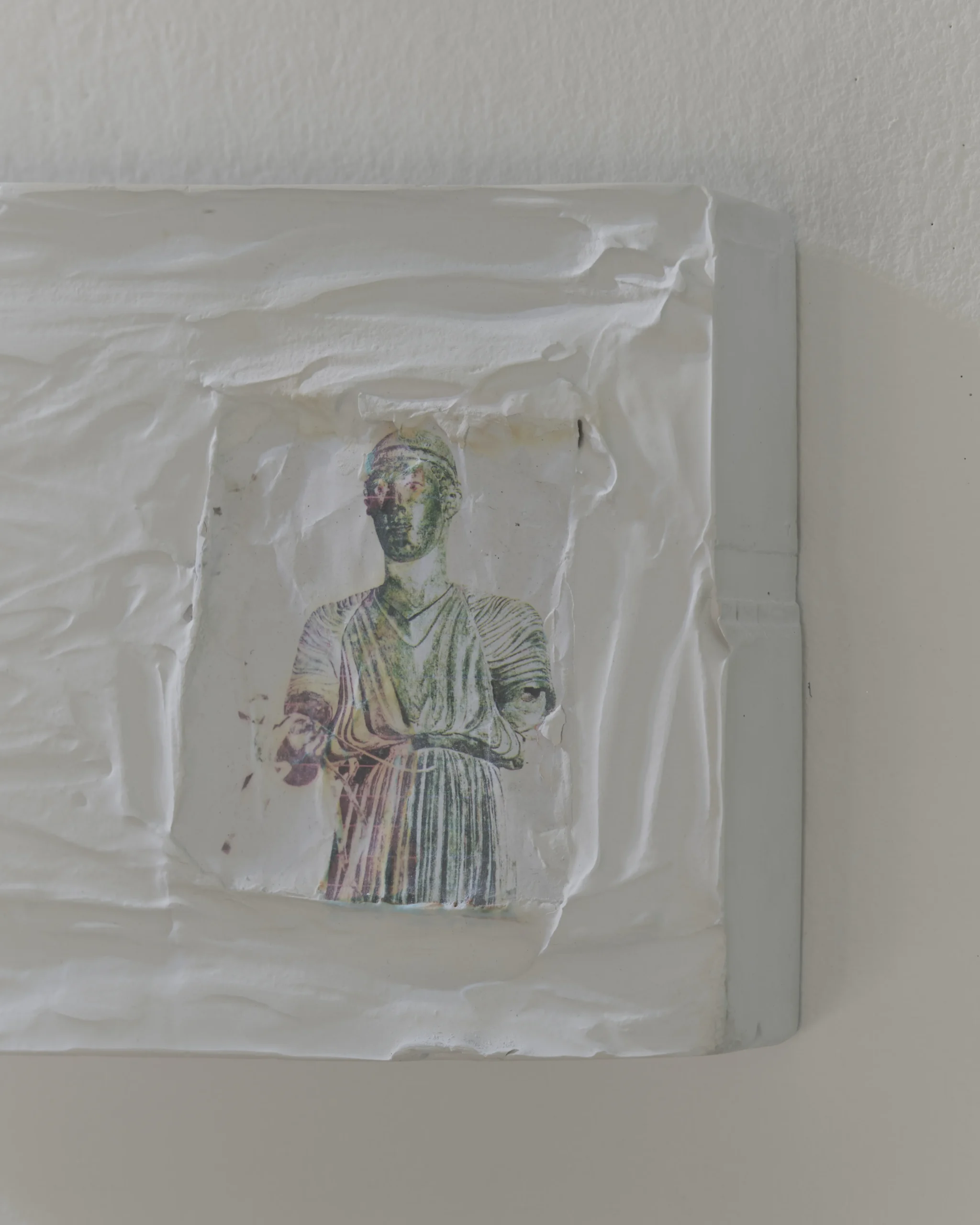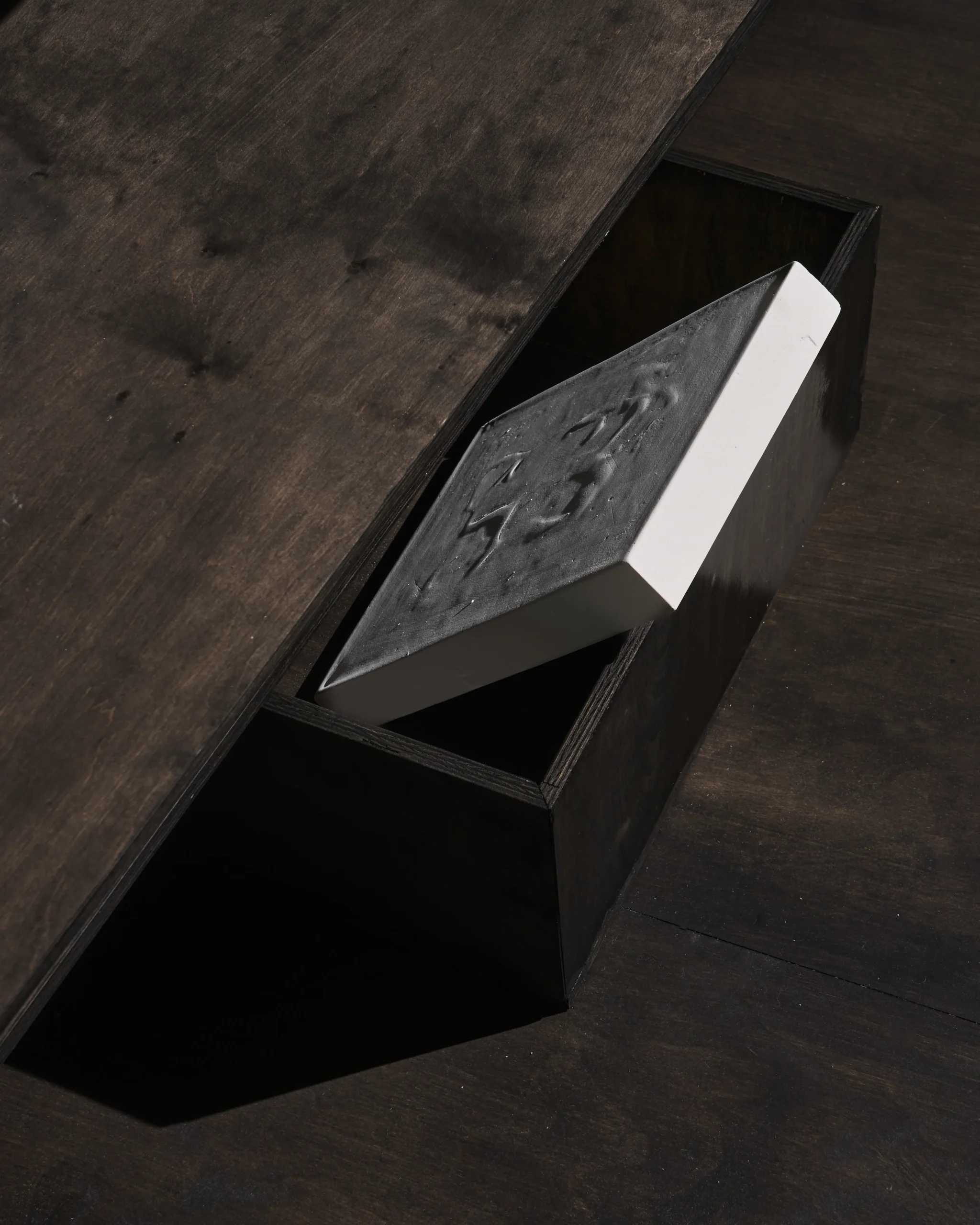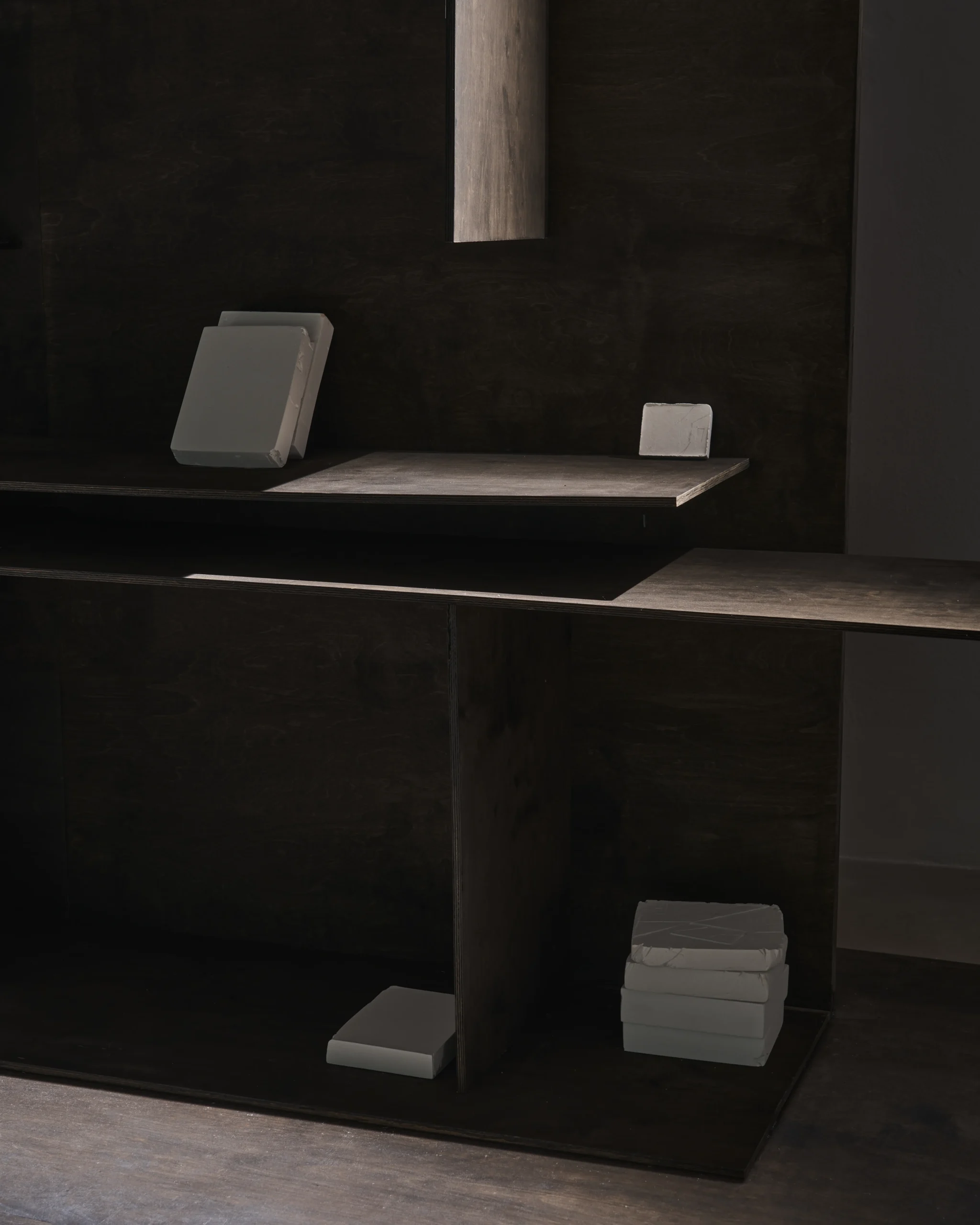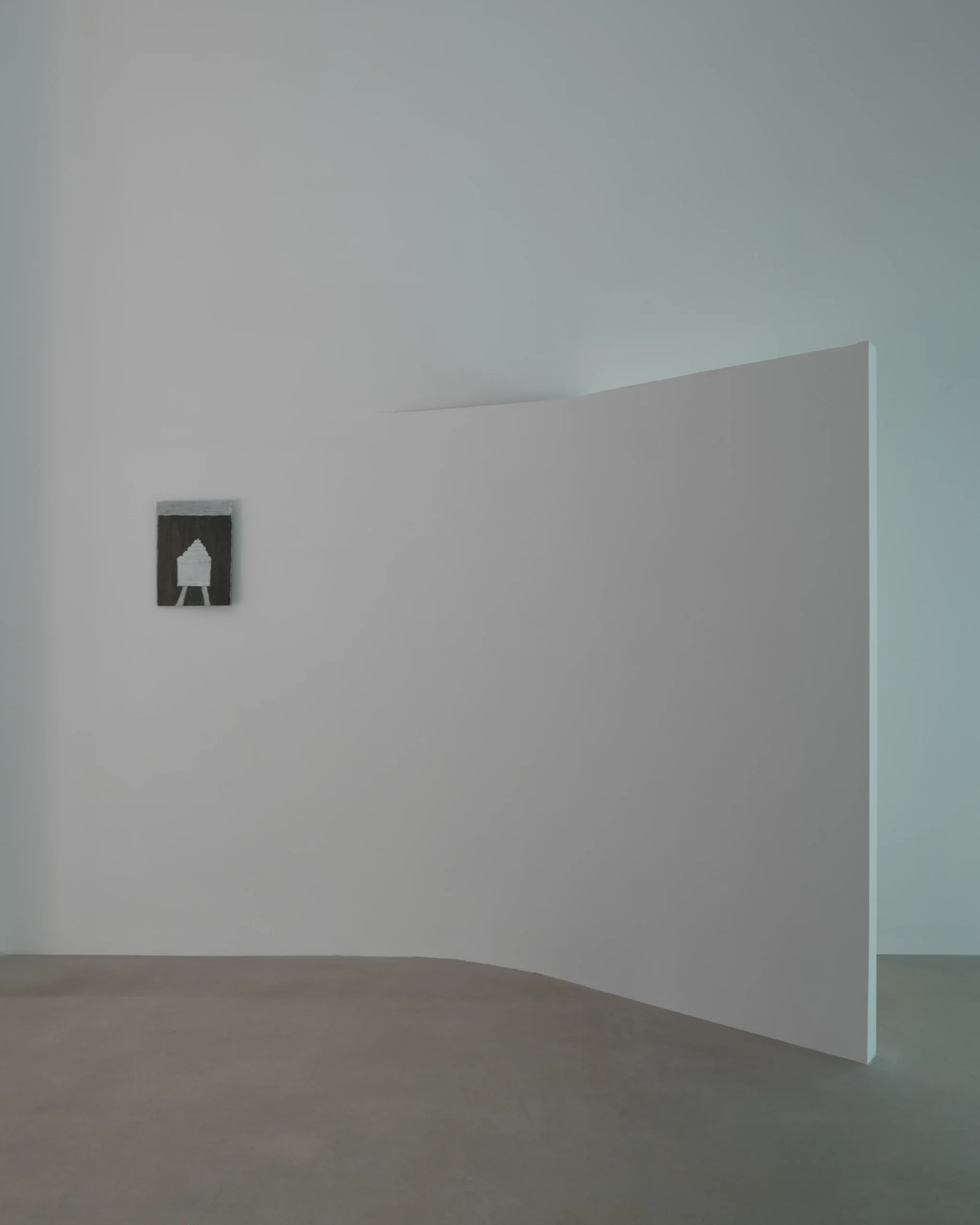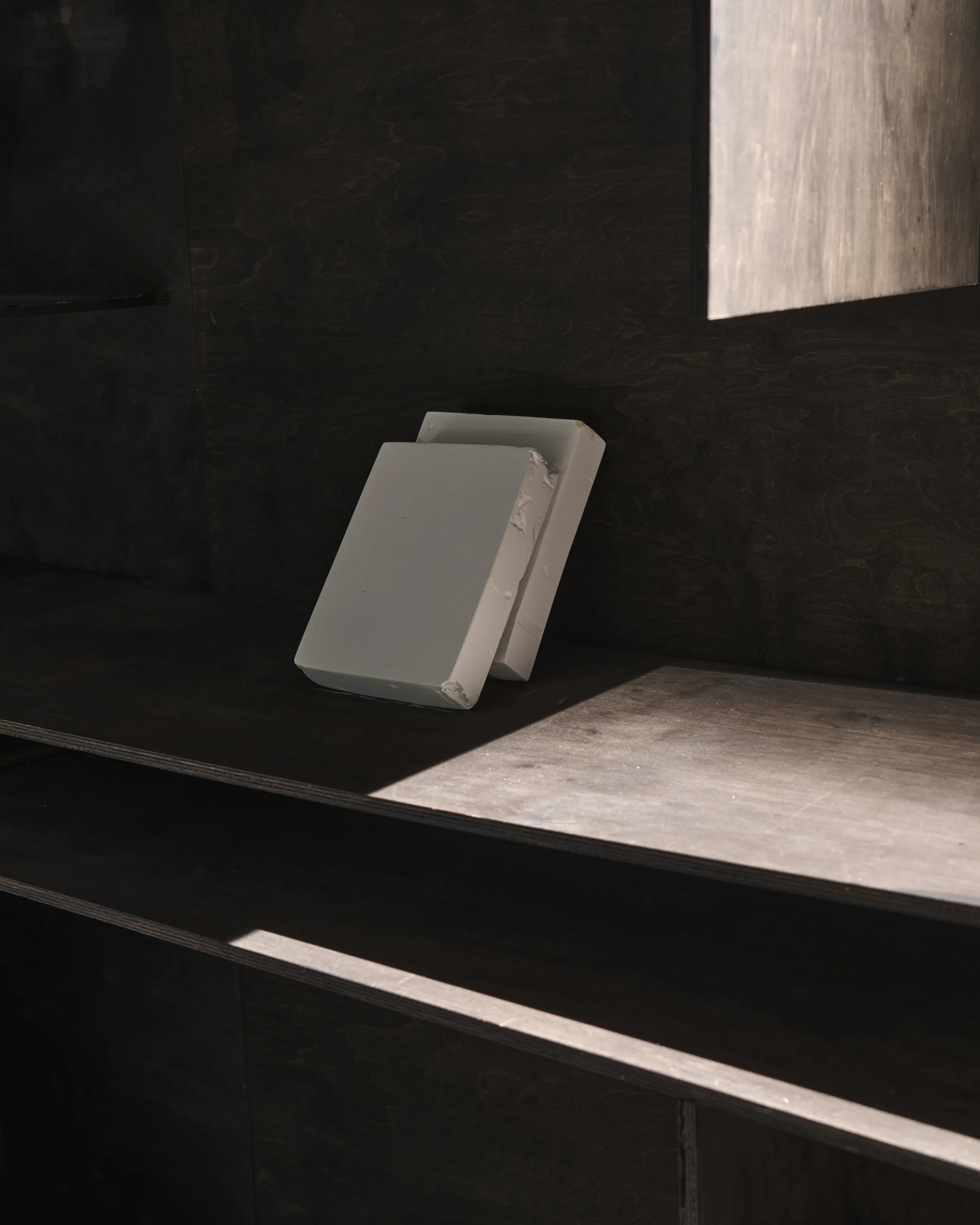 How to grasp something that exists only in fragments? Plaster reliefs and plywood objects employ a language of reduction. They organise weight, rhythm and internal relationships ‒ both within individual works and across the exhibition as a whole. This restrained visual system allows elements typically perceived as cool or distanced to function as carriers of affect and emotional charge. In this way, the exhibition spatialises anxiety and uncertainty, which ‒ like vultures suspended midair – hover above the structure of THE GRAND MEMORY.
