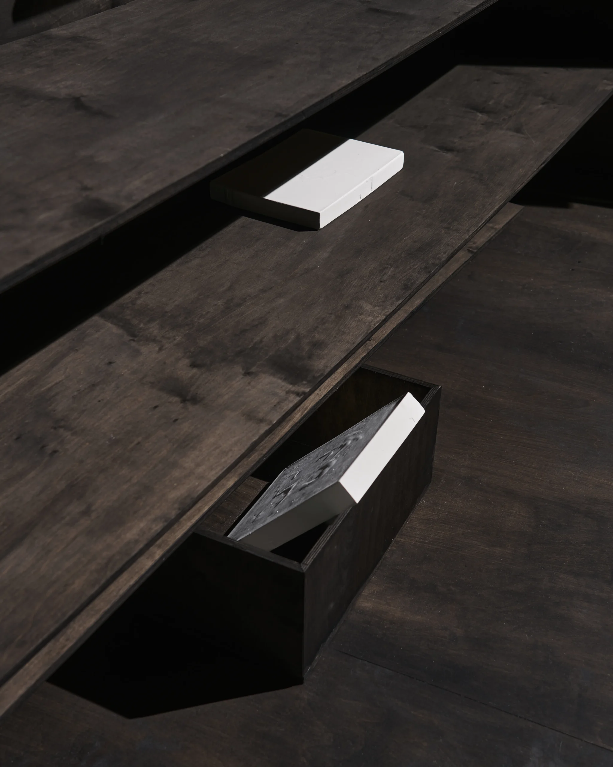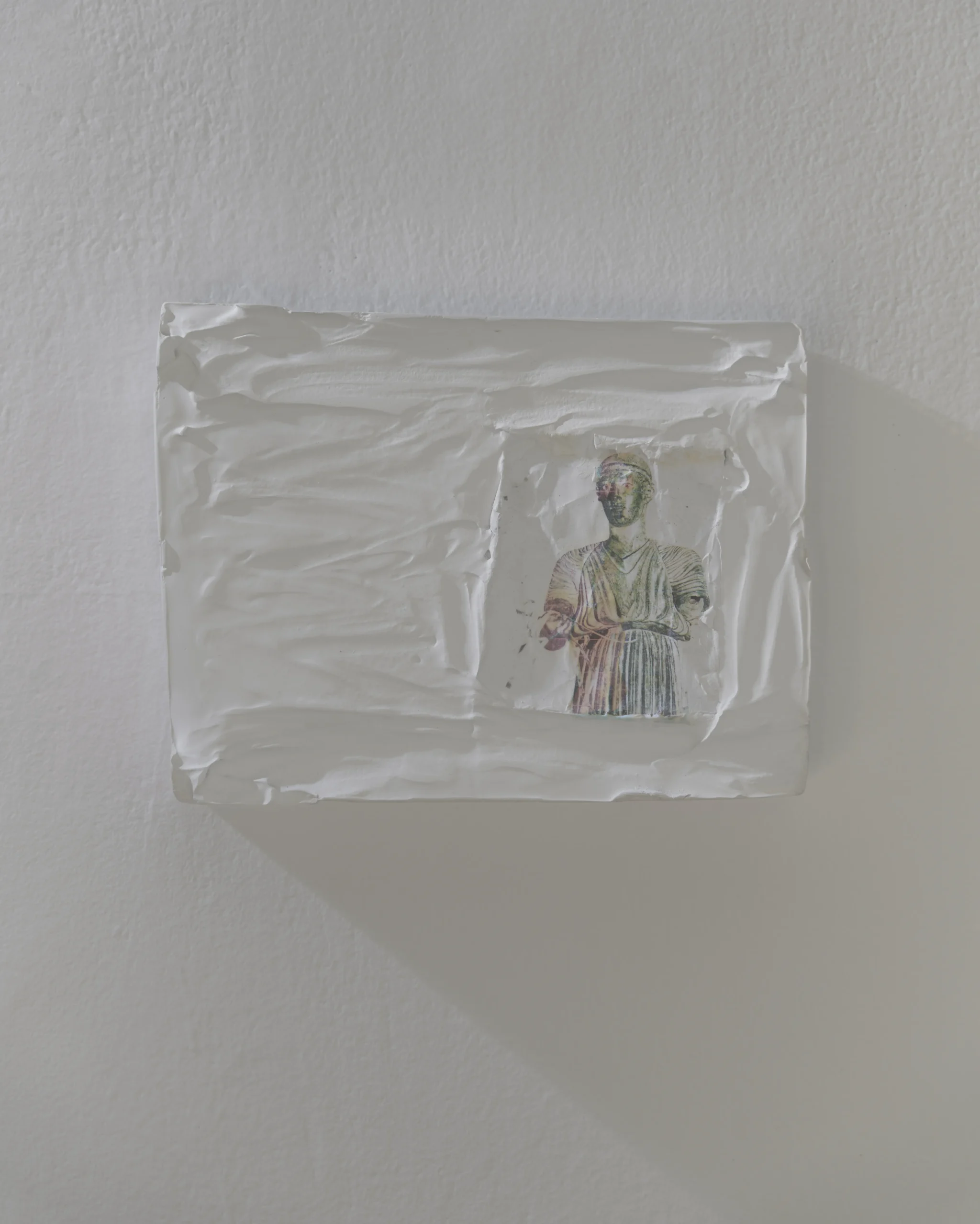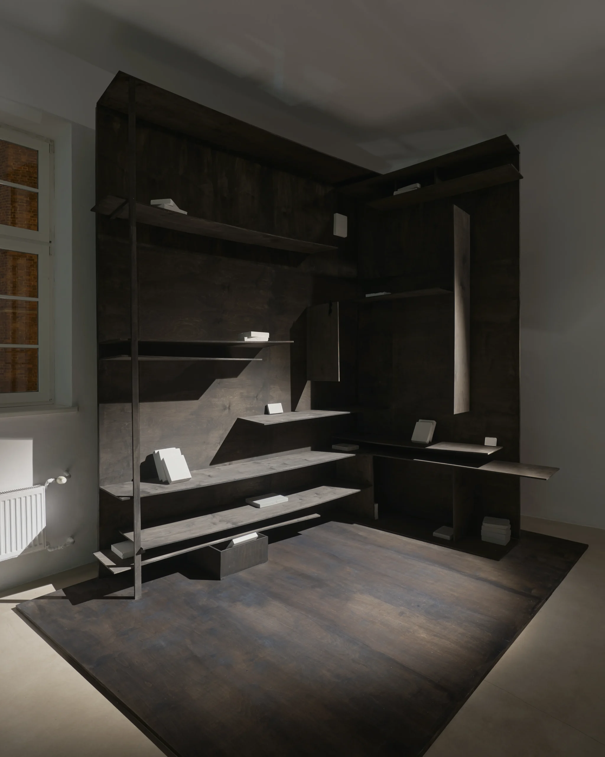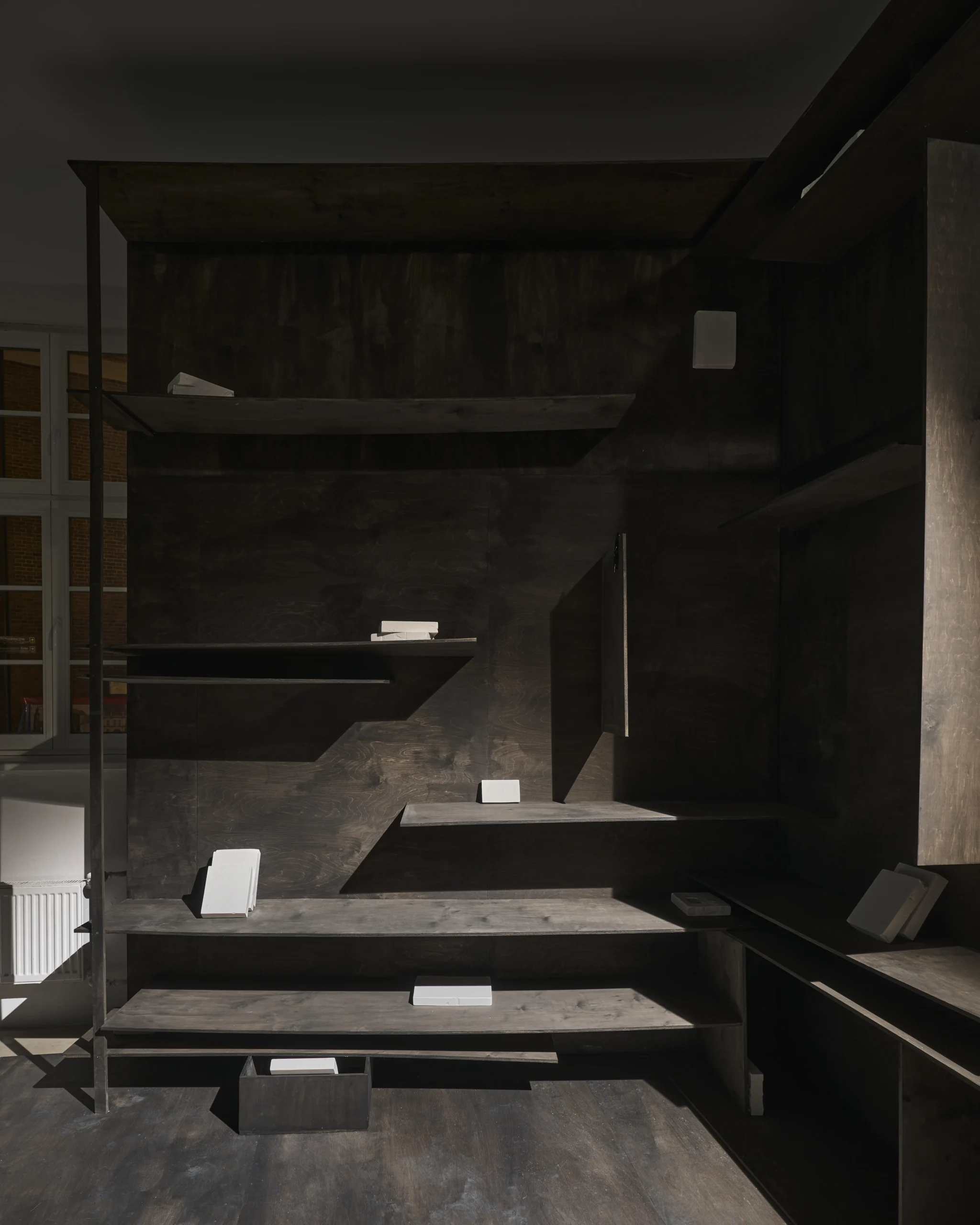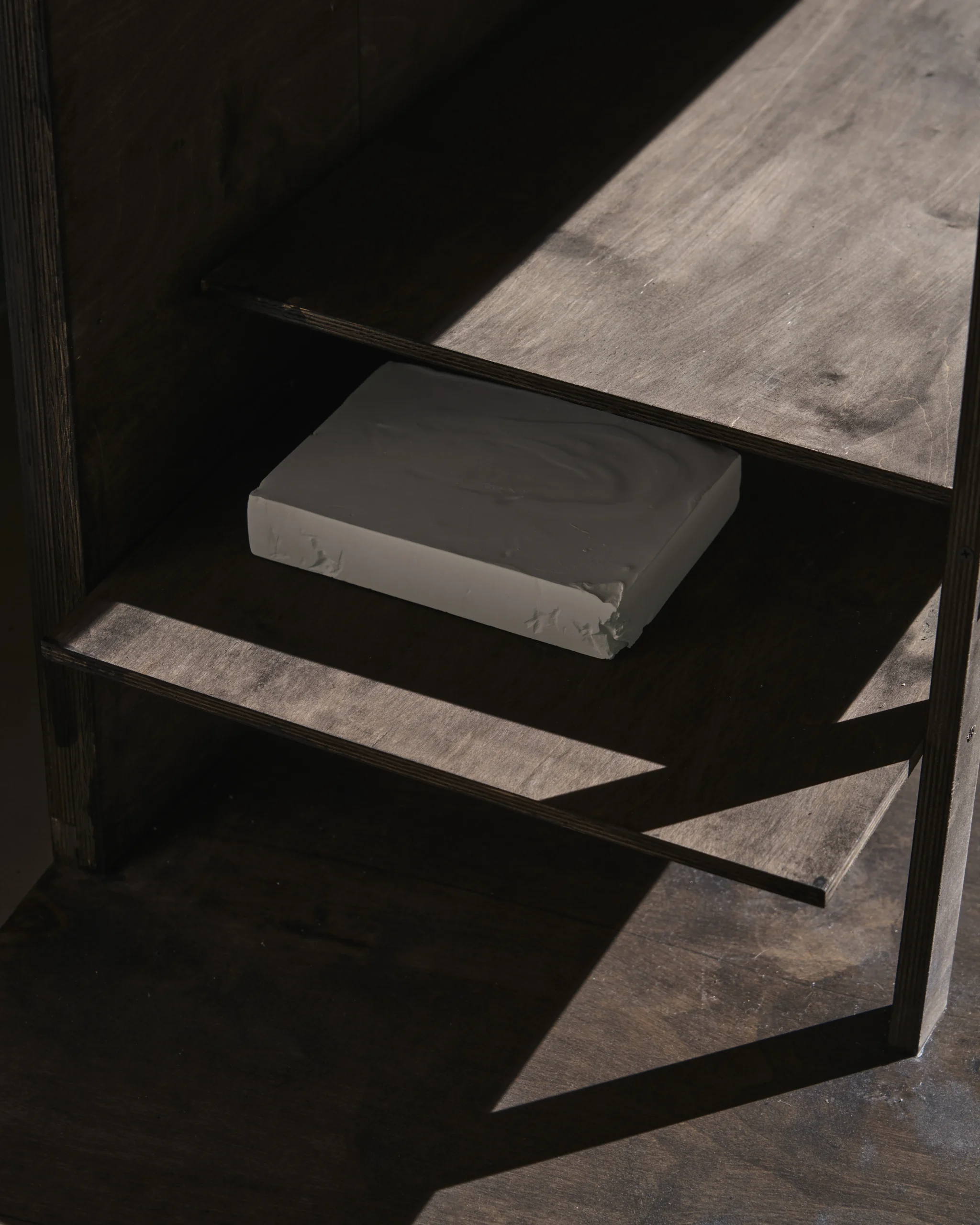 How to grasp something that exists only in fragments? Plaster reliefs and plywood objects employ a language of reduction. They organise weight, rhythm and internal relationships ‒ both within individual works and across the exhibition as a whole. This restrained visual system allows elements typically perceived as cool or distanced to function as carriers of affect and emotional charge. In this way, the exhibition spatialises anxiety and uncertainty, which ‒ like vultures suspended midair – hover above the structure of THE GRAND MEMORY.
