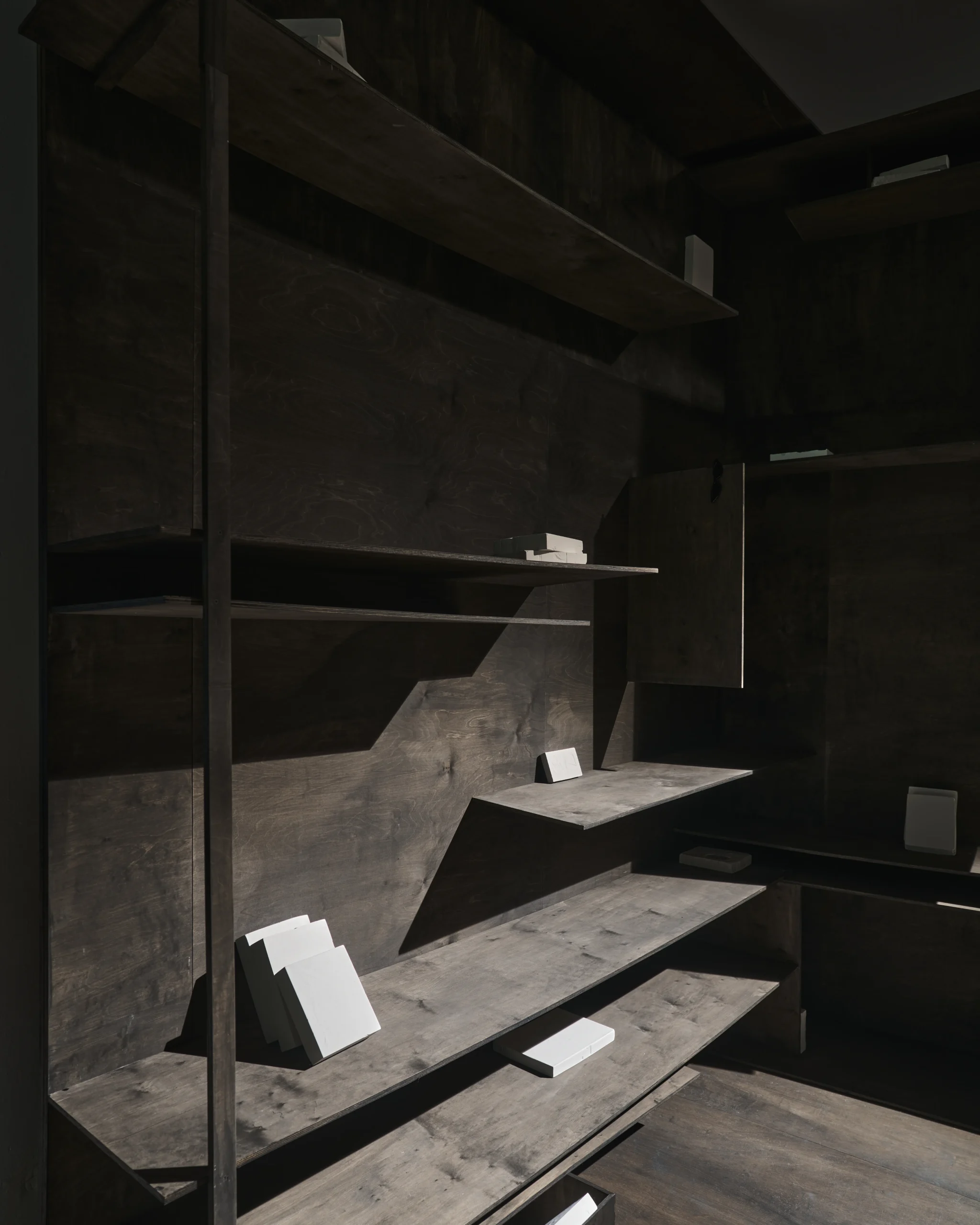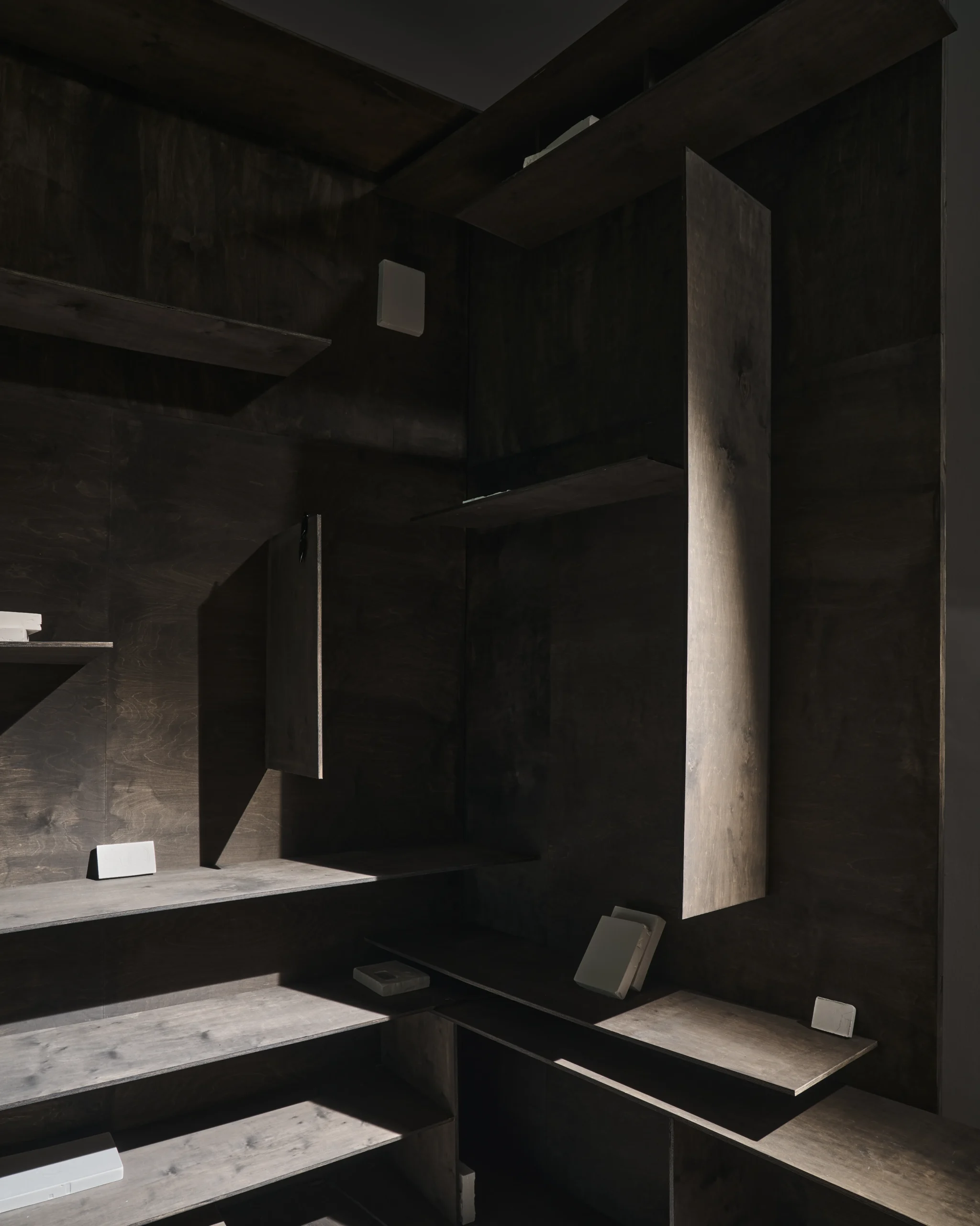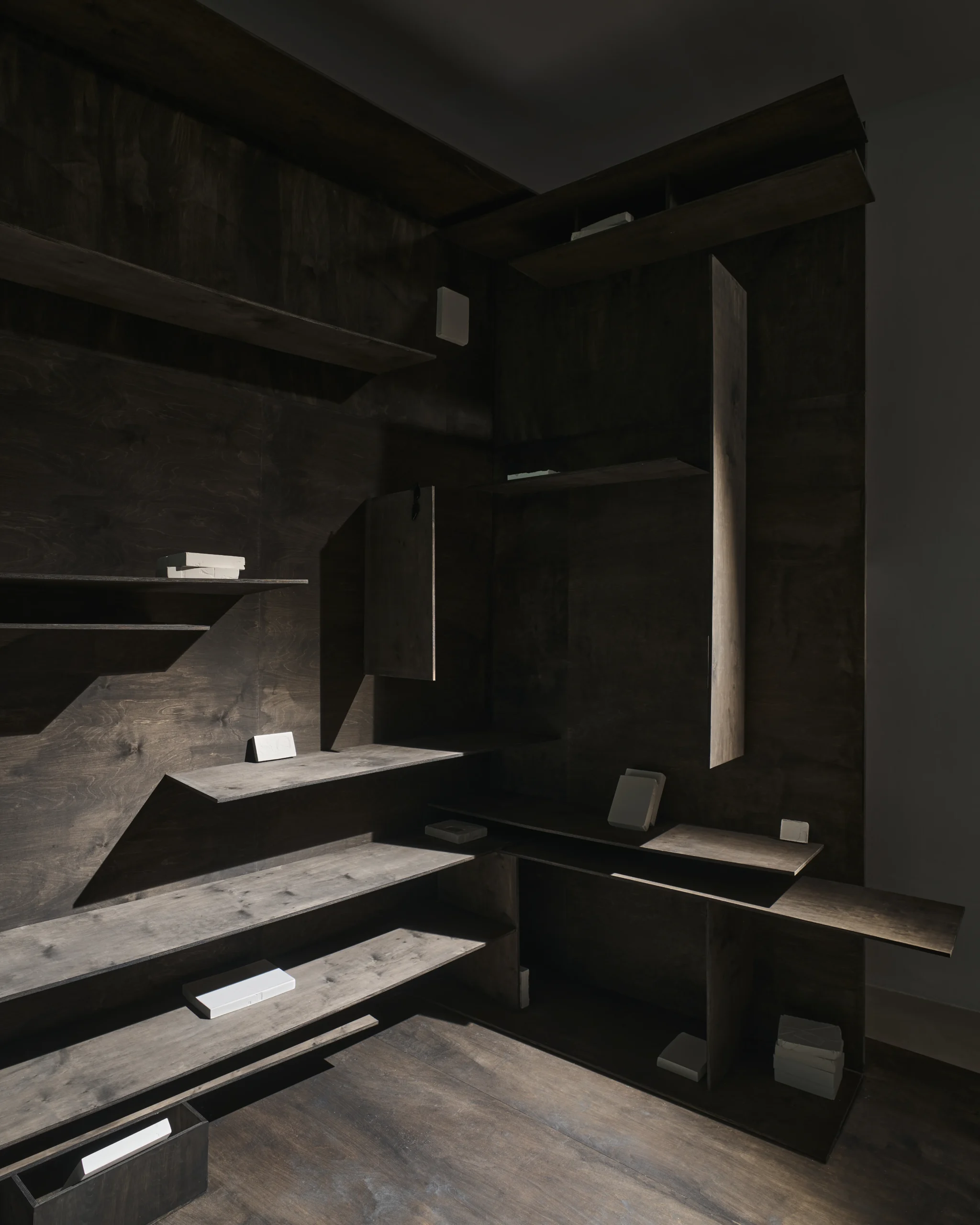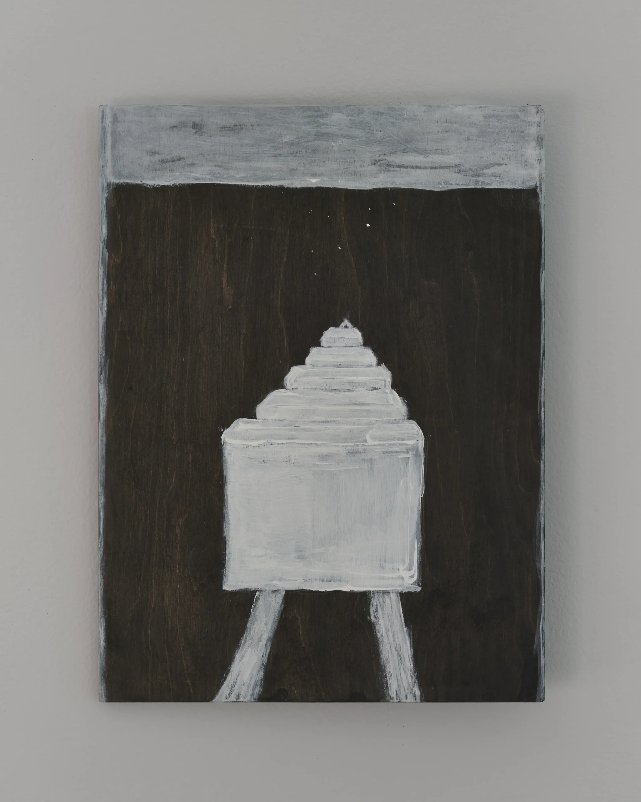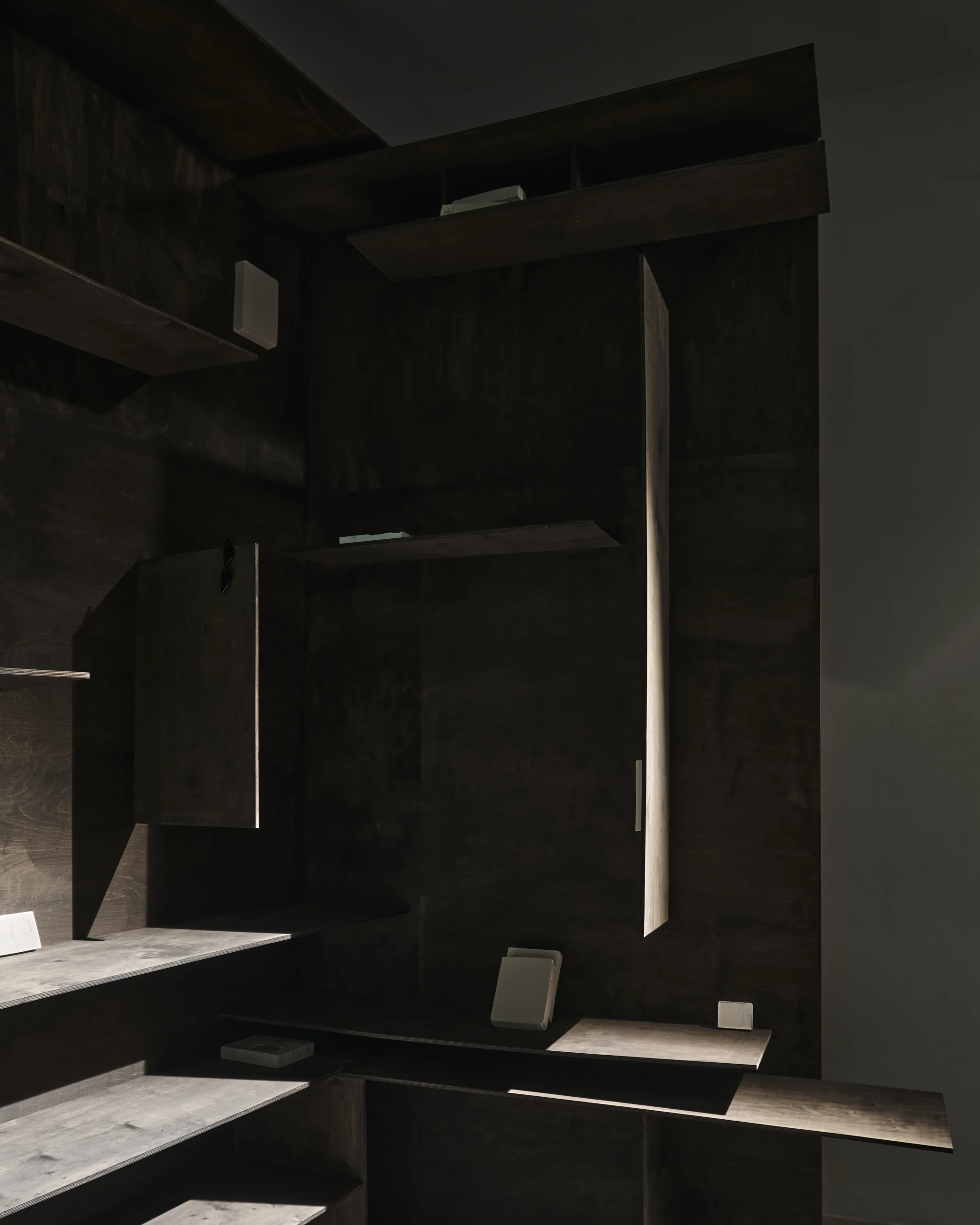 How to grasp something that exists only in fragments? Plaster reliefs and plywood objects employ a language of reduction. They organise weight, rhythm and internal relationships ‒ both within individual works and across the exhibition as a whole. This restrained visual system allows elements typically perceived as cool or distanced to function as carriers of affect and emotional charge. In this way, the exhibition spatialises anxiety and uncertainty, which ‒ like vultures suspended midair – hover above the structure of THE GRAND MEMORY.