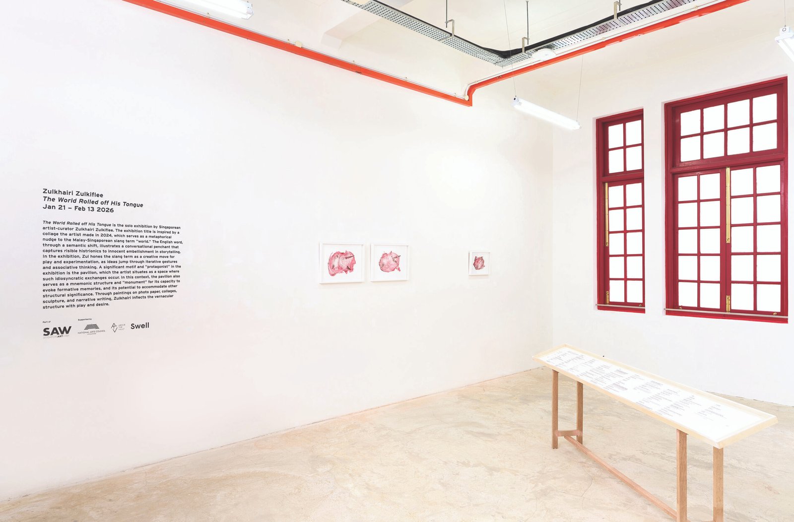 The World Rolled off His Tongue is the solo exhibition by Singaporean artist-curator Zulkhairi Zulkiflee. The exhibition title is inspired by a collage the artist made in 2024, which serves as a metaphorical nudge to the Malay-Singaporean slang term “world.” The English word, through a semantic shift, illustrates a conversational penchant that captures risible histrionics to innocent embellishment in storytelling.
