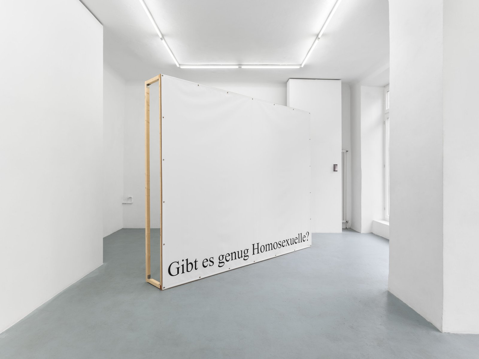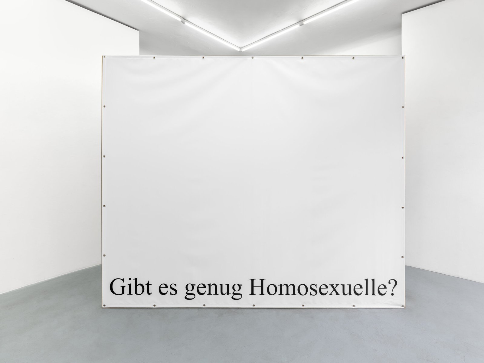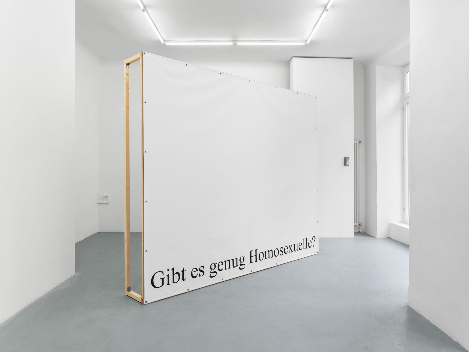 Urban’s screens placed in an irregular sometimes widely spaced sequence form a horizontal band. A rather restrained and minimalist gesture in the gallery space. Which, however, is dominated by a boldly printed tarpaulin, 2.50 x 3 m, stretched diagonally and expansively across a wooden wall blocking the gallery. With the provocative question: ‘Gibt es genug Homosexuelle?’ (‘Are there enough homosexuals?’) Almost a slogan that sounds like old ‘Berlin Frontstadt’ (‘Berlin frontline’) in tranquil Wilmersdorf.