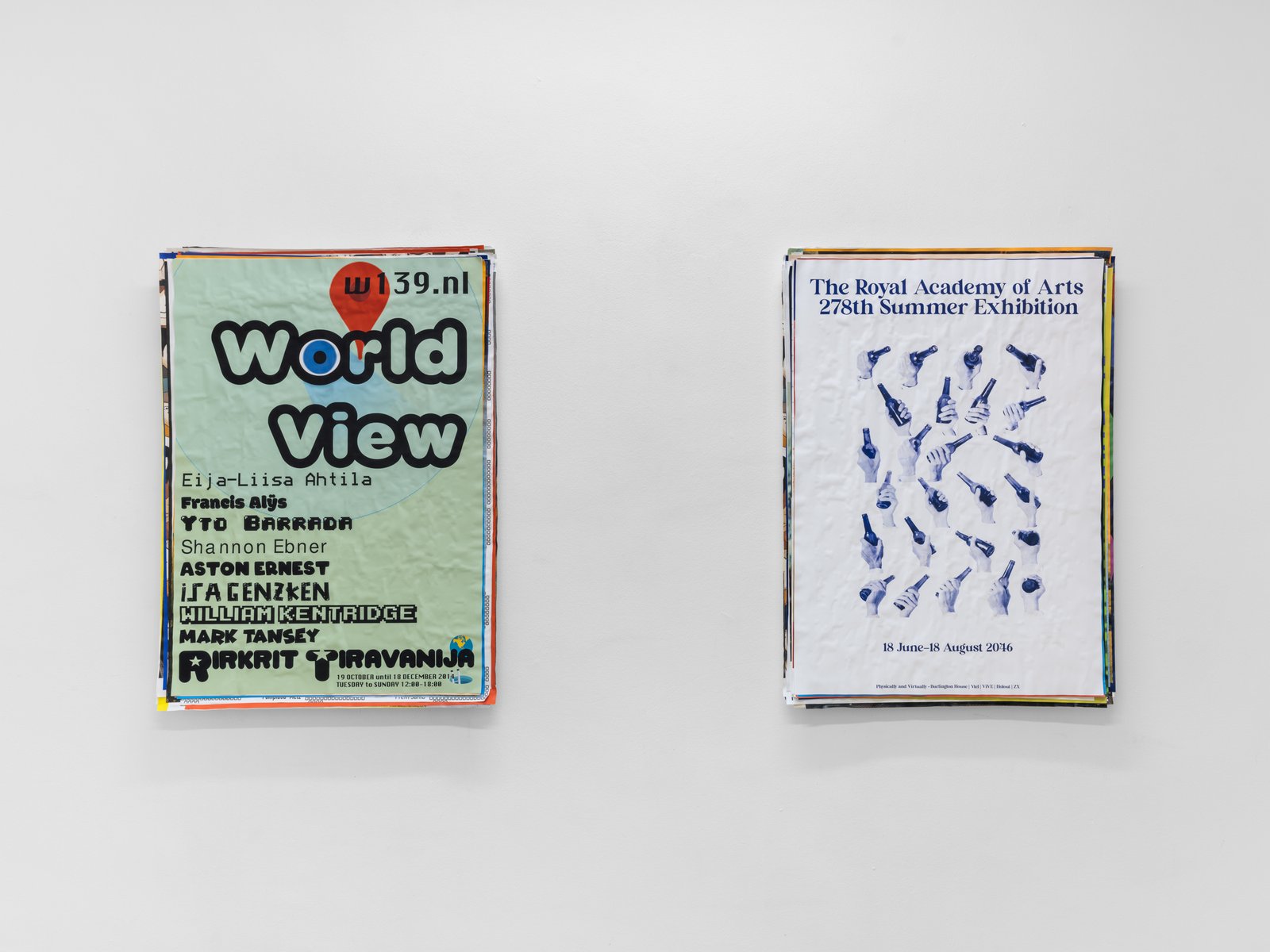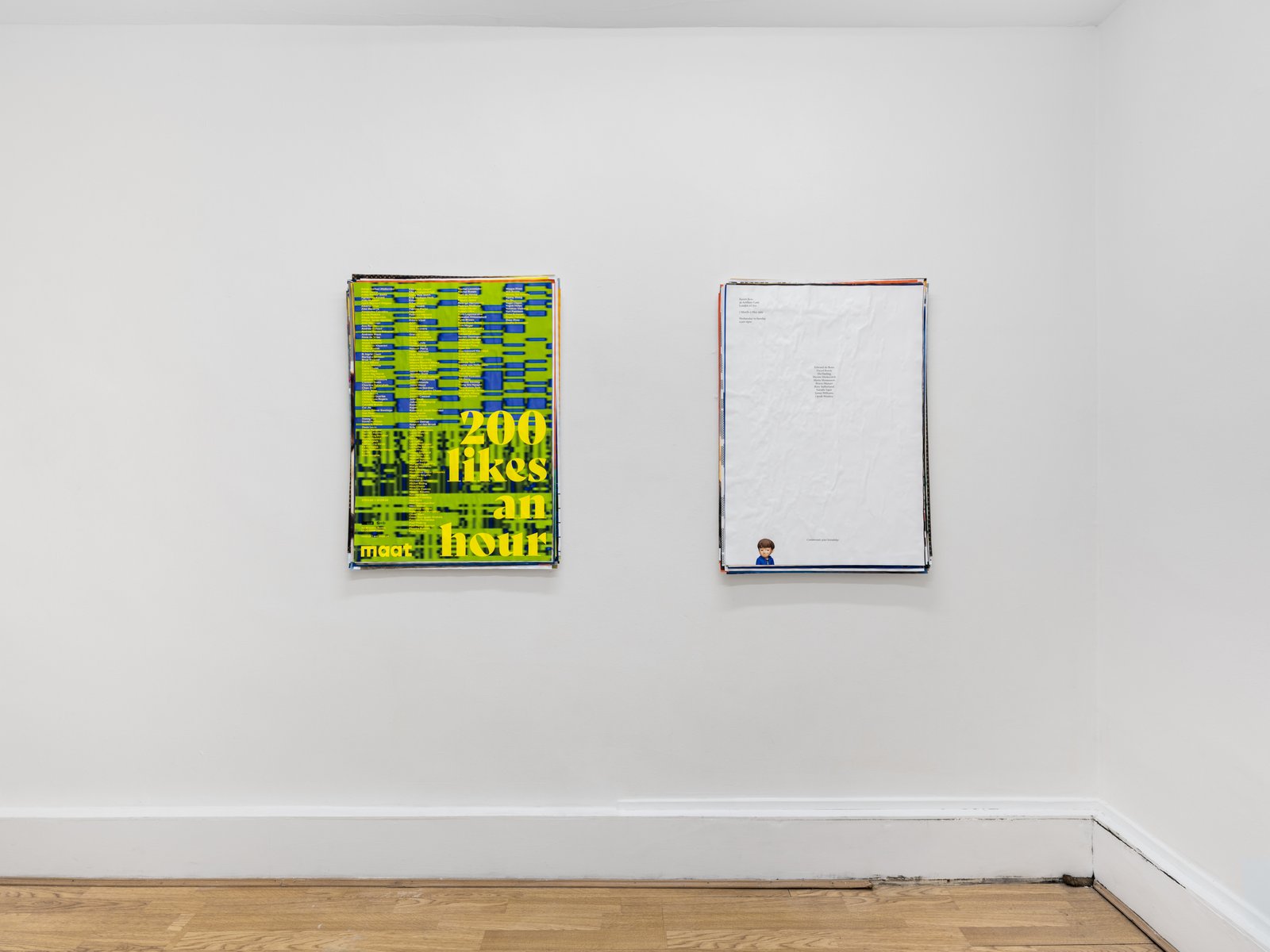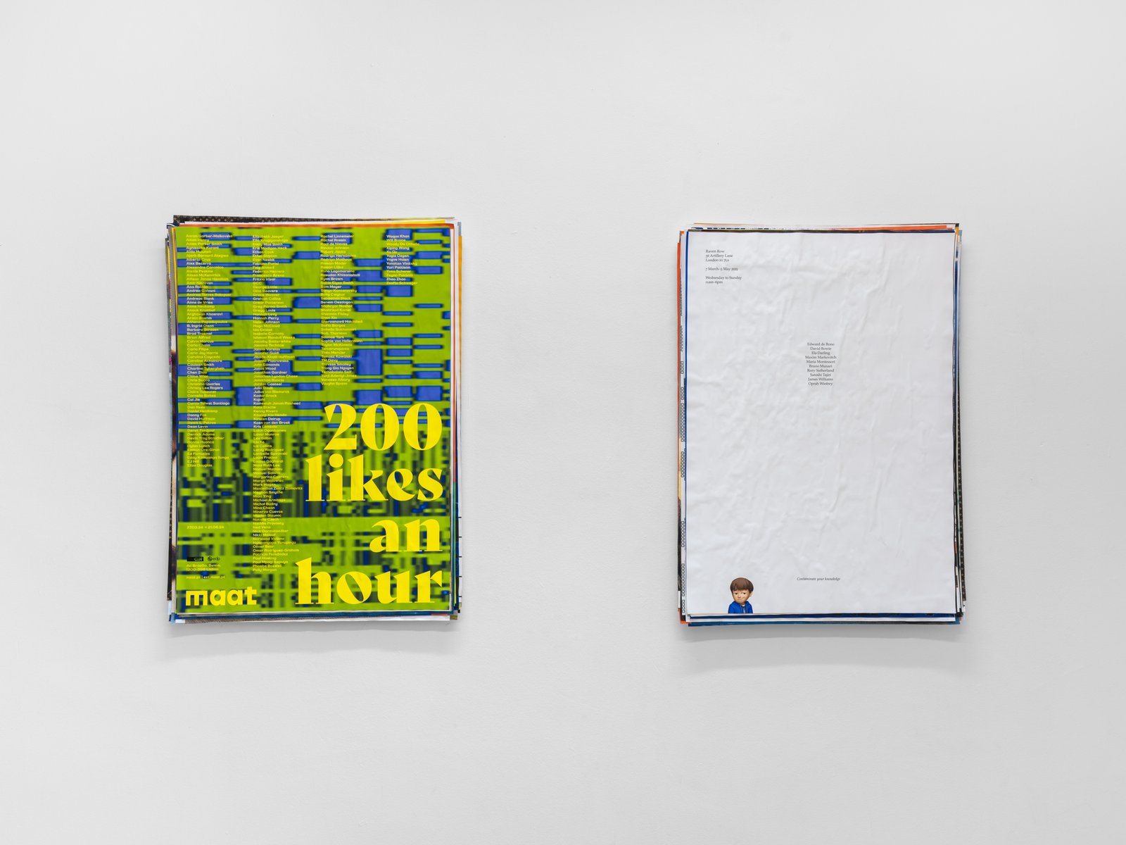 “Phantom Ambition” unfolds as an accumulation of dreams. On sleepless nights, Gander curates an imagined exhibition populated by artists, writers, designers, and even celebrities. For every work, Gander develops a title, selects a venue, and assigns dates—sometimes in the past, other times in the future. Each poster is designed in the style of the institution it references, situating these fictitious exhibitions as though they might truly occur. Collectively, they form a sculptural archive of personal ambitions, with one poster displayed on the surface while the remaining forty-nine in the series lie layered and concealed underneath.