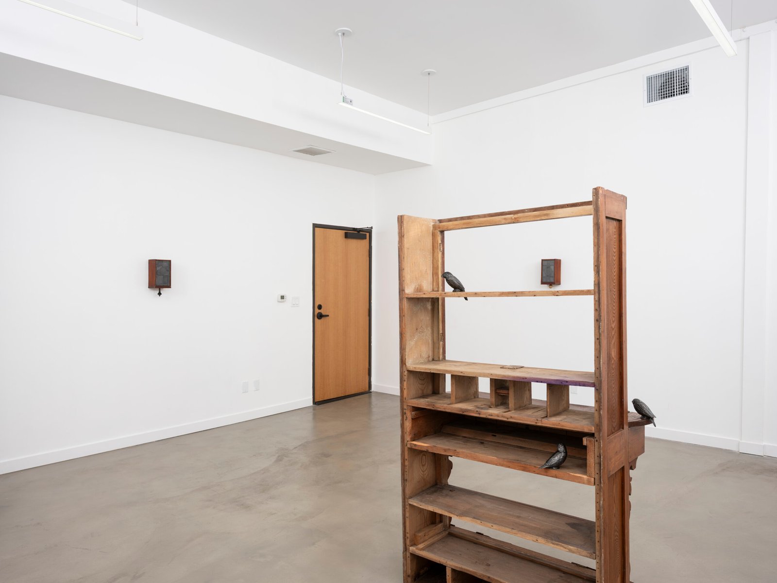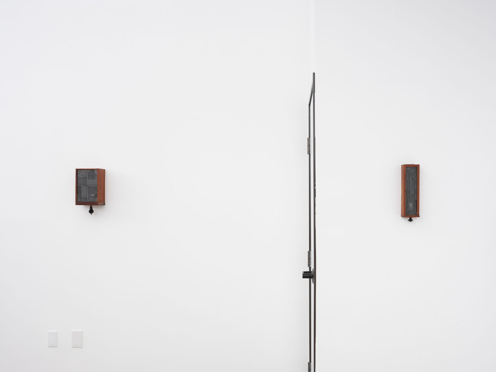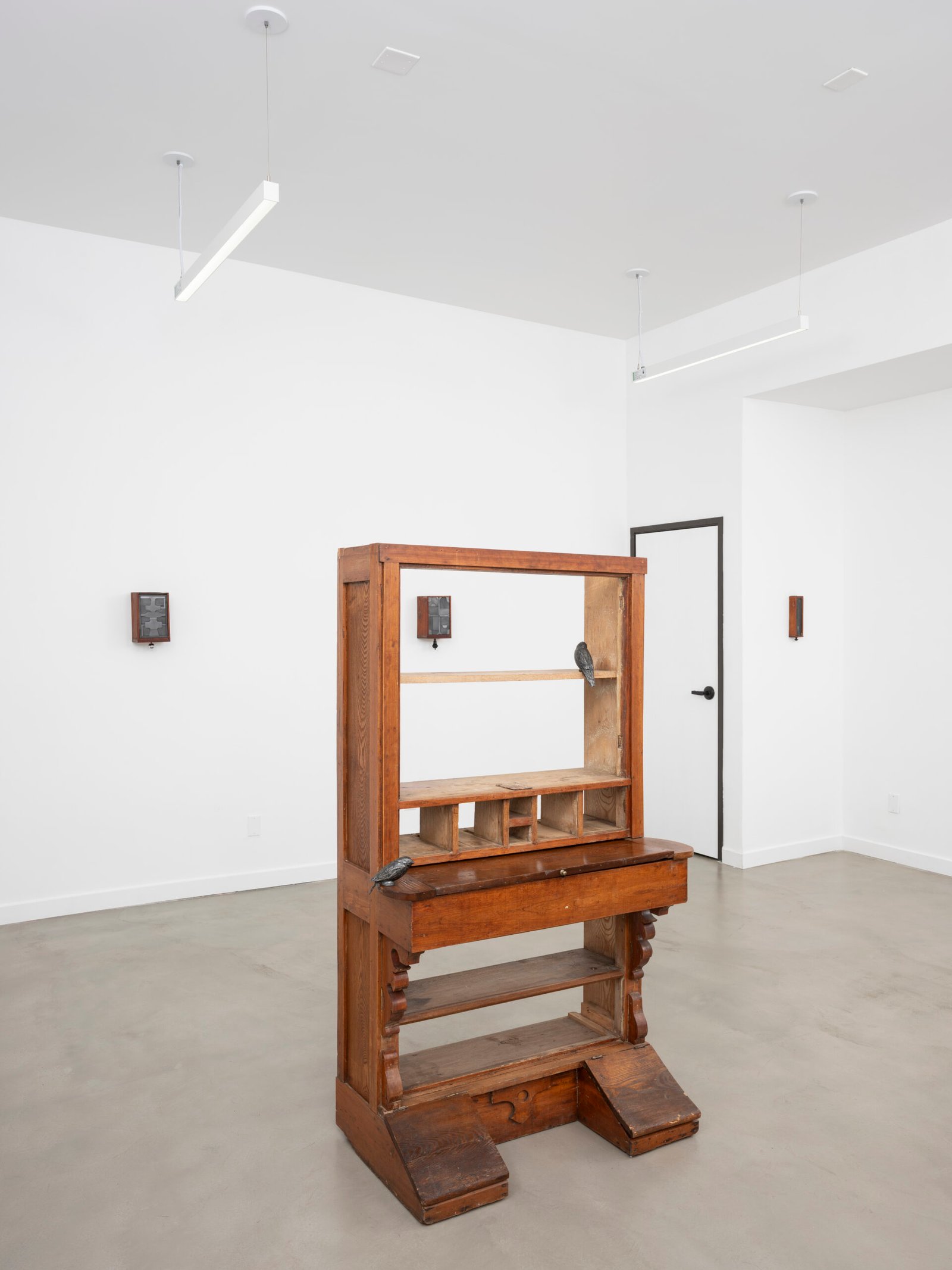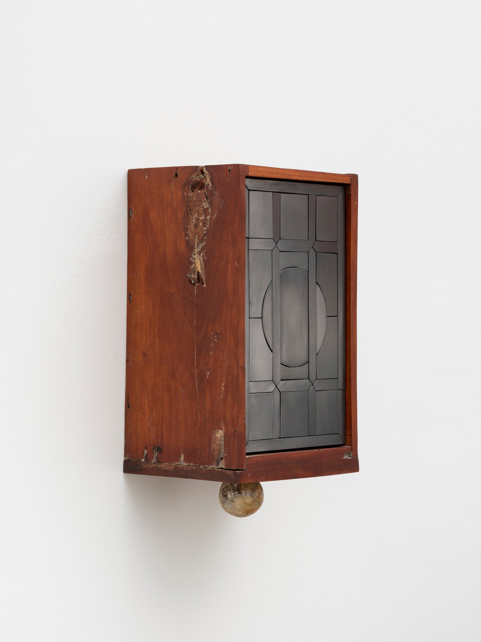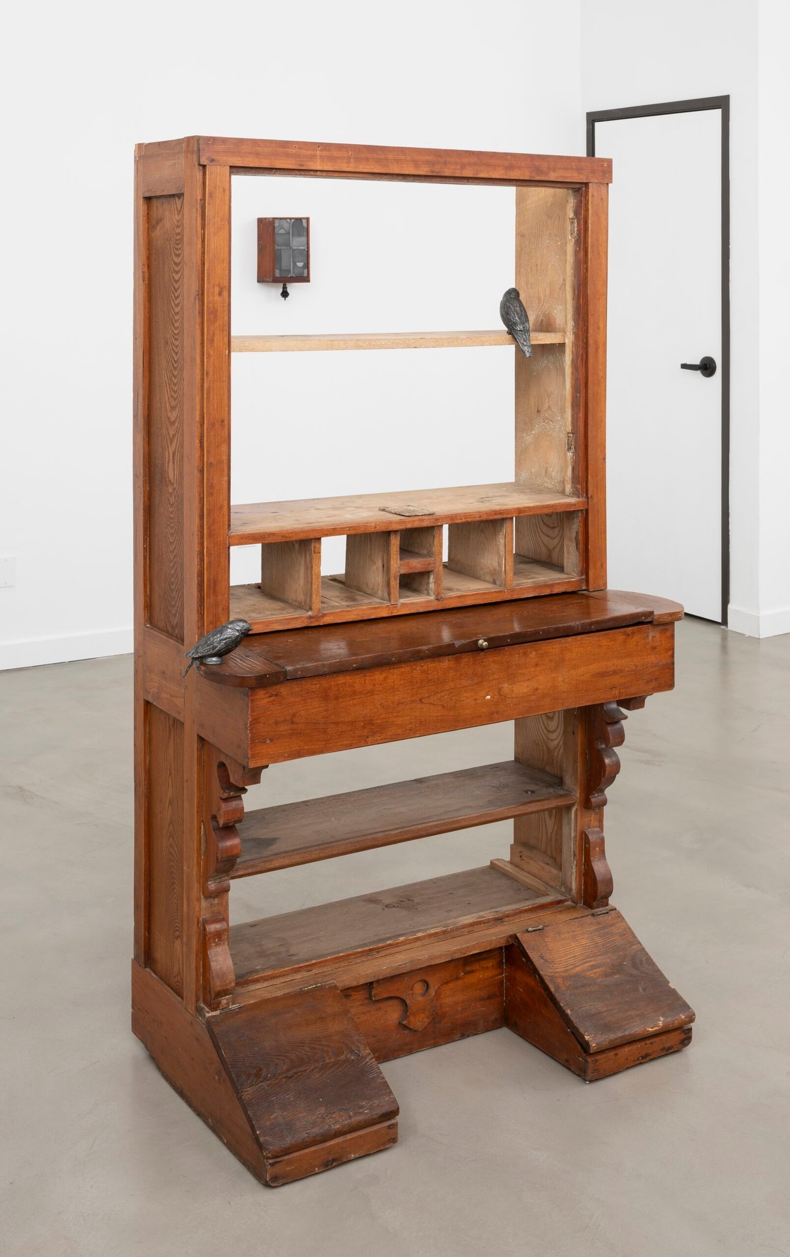 The mosaics are materially connected to a sculpture standing in the center of the space – a disemboweled antique cabinet