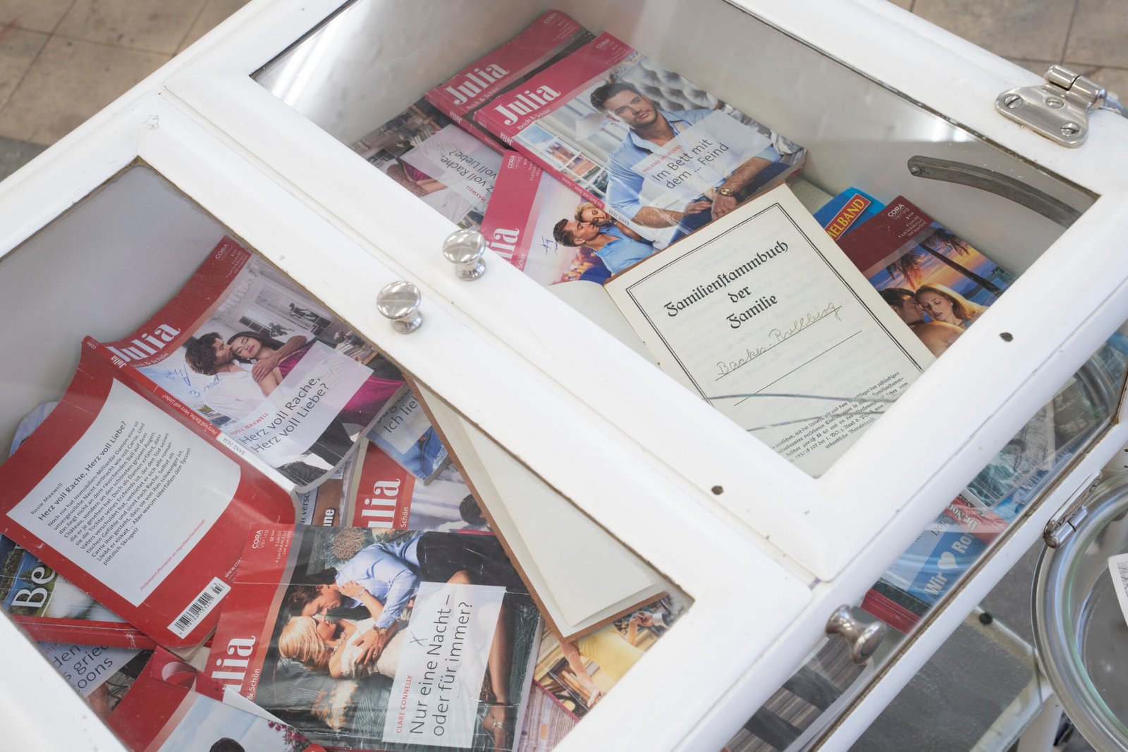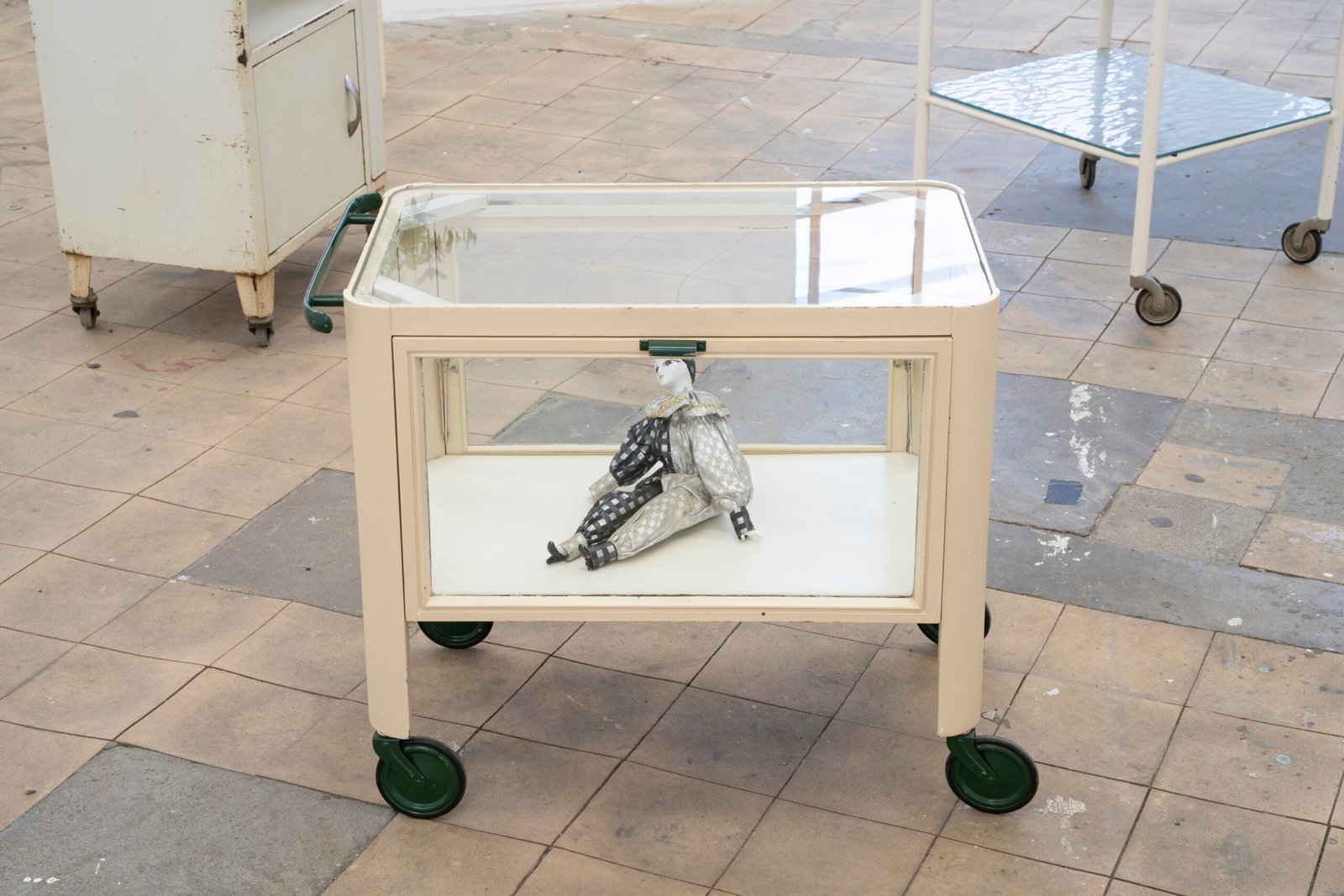 Here, Legouez presents objects as sedimented time: garments, care products, furniture and cos-